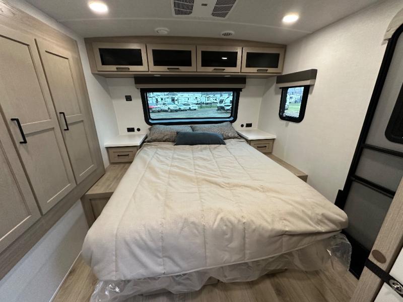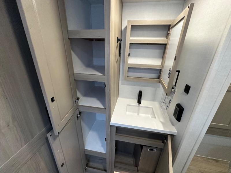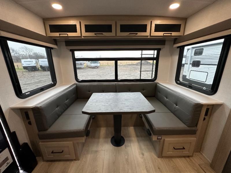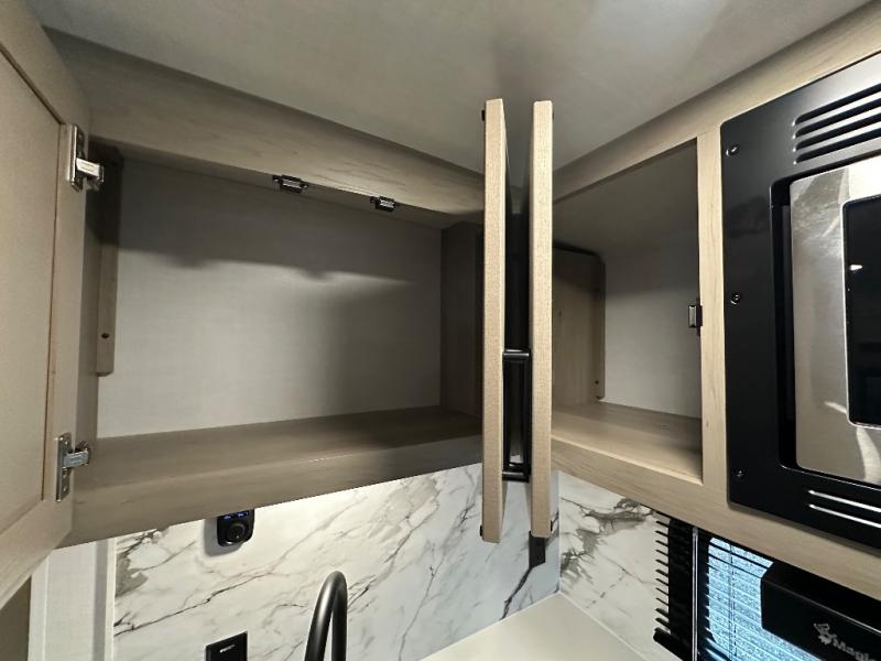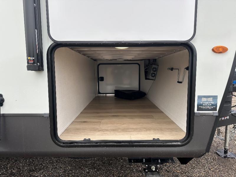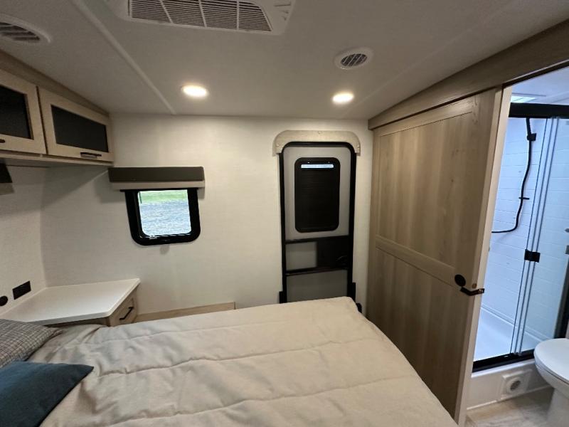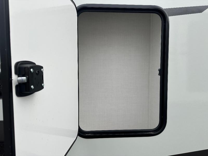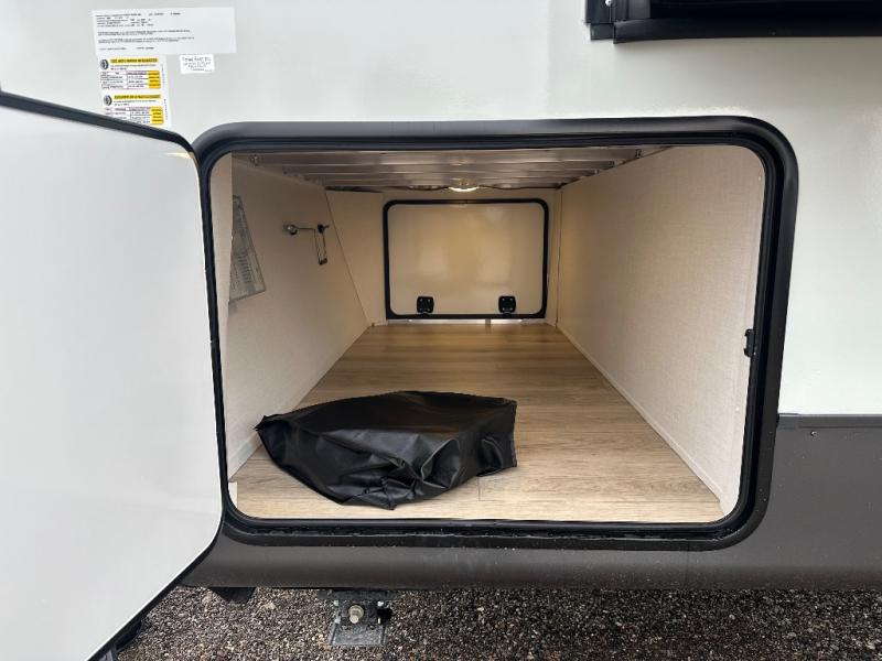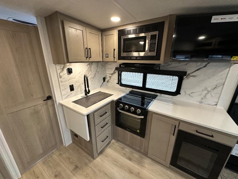 It will be so easy to enjoy time at the campground in this cozy travel trailer. The full kitchen includes a three burner gas oven, a microwave oven, and a 12V refrigerator to cook and store food, and the pantry will let you stock up on snacks. Your crew can get comfortable on the theater seat or around the rear U-shaped dinette, and there is a smart TV here to make it a movie night. The walk-thru bath will let you freshen up each day, and the queen bed in the front bedroom is sure to bring comfort. You will also find one of the dual entry doors here for convenience plus a wardrobe slide out for more storage and floor space. The exterior is just as accommodating with its pass-thru storage, 2" receiver hitch, and 21' power awning!
