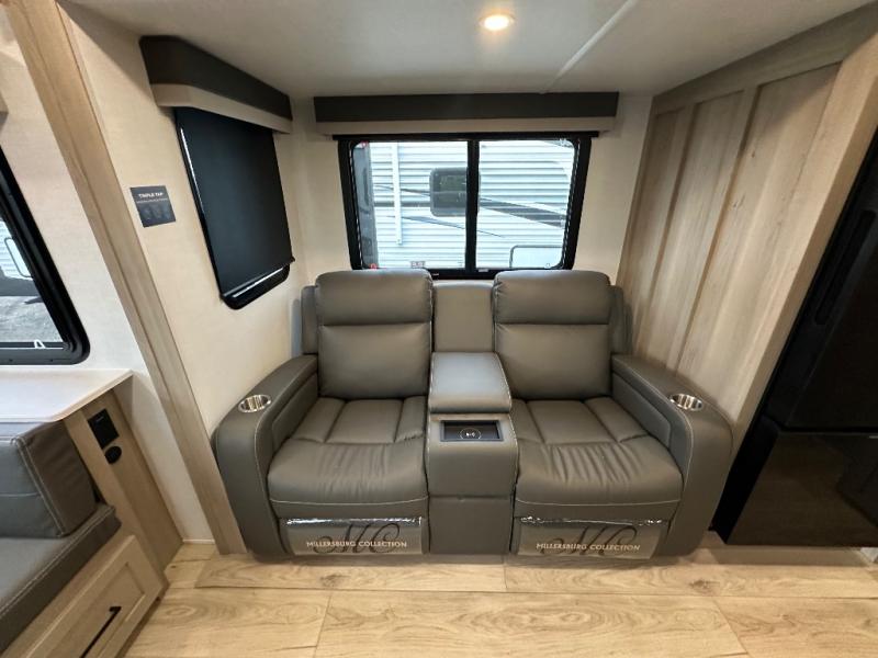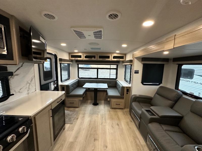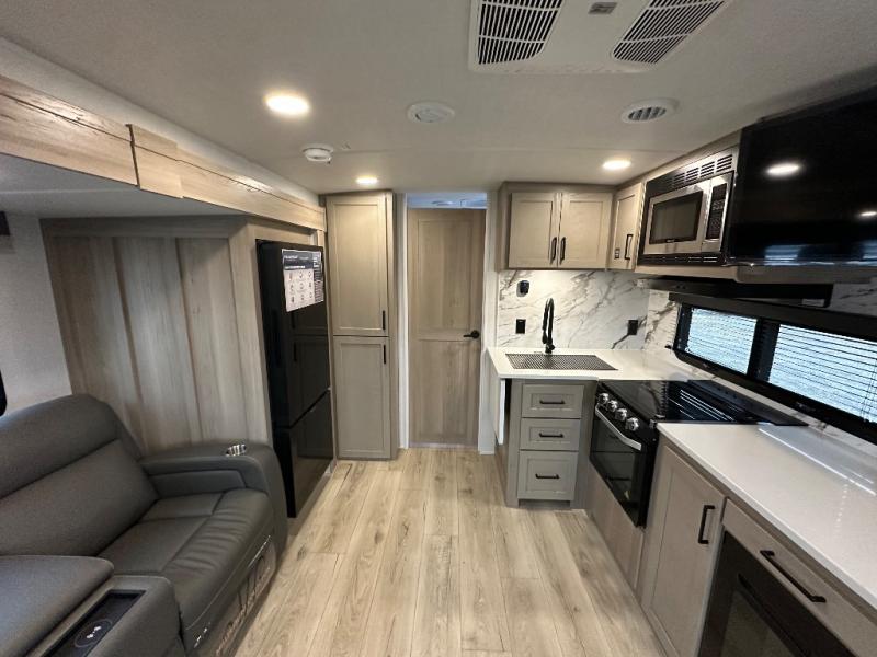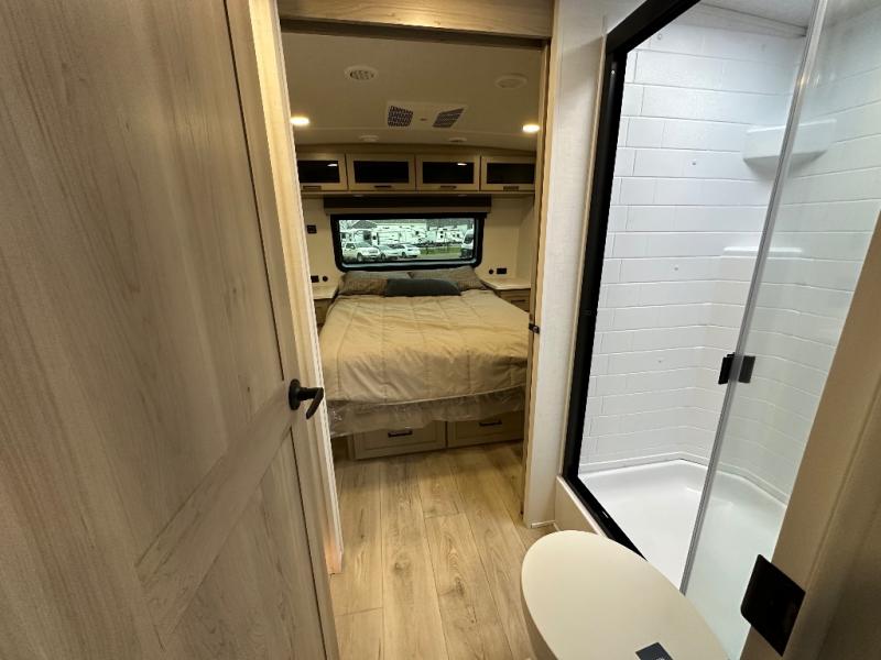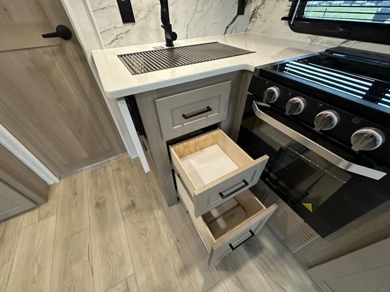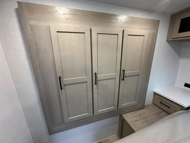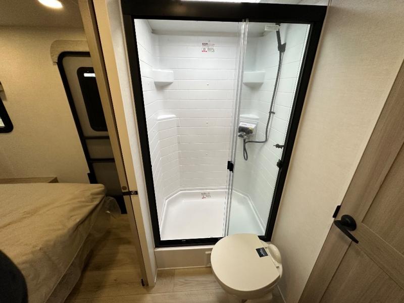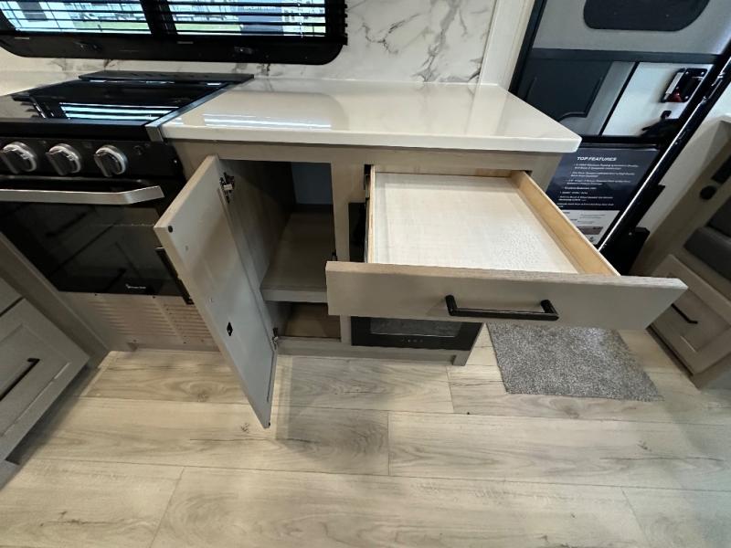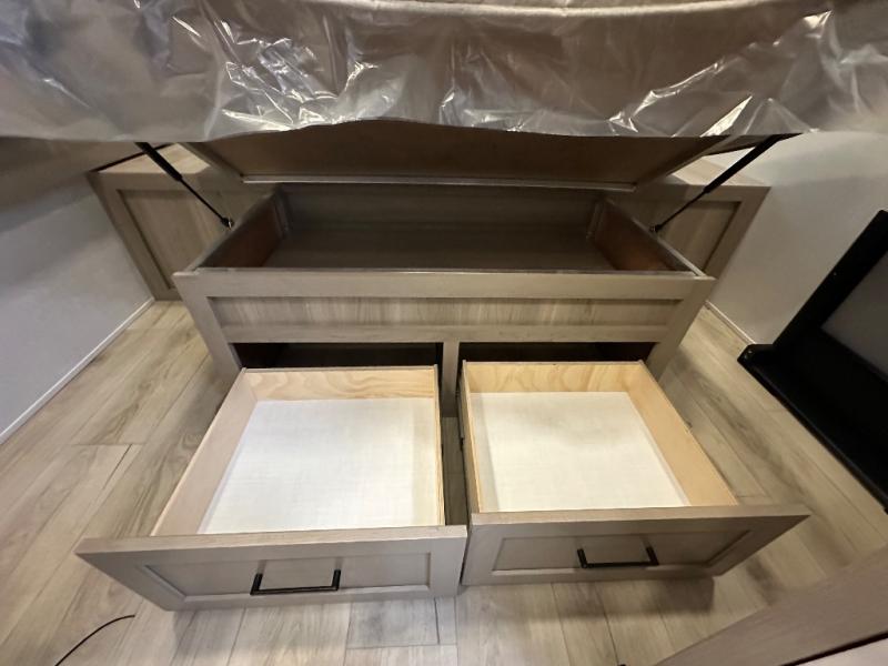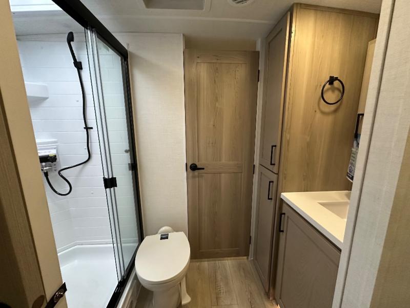 It will be so easy to enjoy time at the campground in this cozy travel trailer. The full kitchen includes a three burner gas oven, a microwave oven, and a 12V refrigerator to cook and store food, and the pantry will let you stock up on snacks. Your crew can get comfortable on the theater seat or around the rear U-shaped dinette, and there is a smart TV here to make it a movie night. The walk-thru bath will let you freshen up each day, and the queen bed in the front bedroom is sure to bring comfort. You will also find one of the dual entry doors here for convenience plus a wardrobe slide out for more storage and floor space. The exterior is just as accommodating with its pass-thru storage, 2" receiver hitch, and 21' power awning!