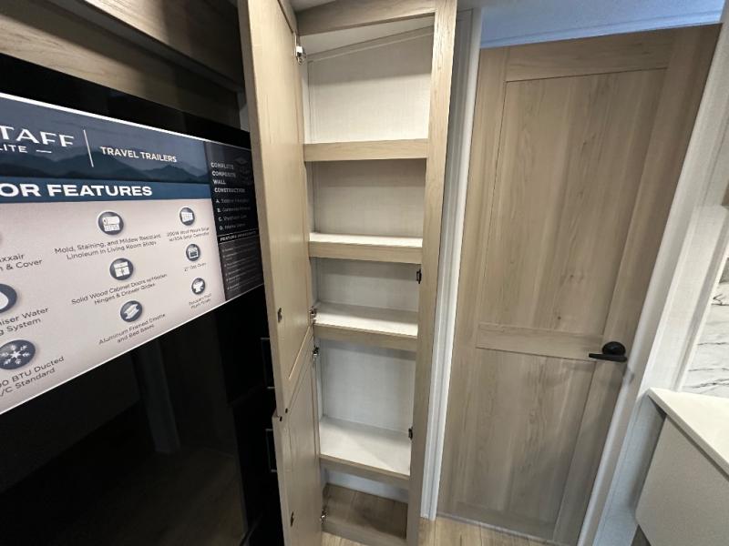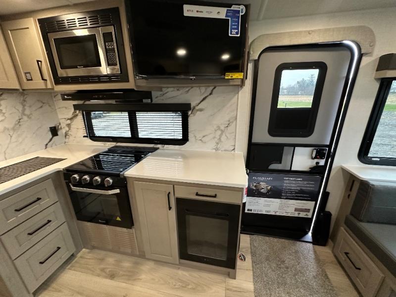 With any Flagstaff Super Lite travel trailer by Forest River, you can enjoy quality features with lightweight towing! The Climate Protection Package includes radiant foil in the front cap, underbelly, and slides, plus there are 12V thermostat-controlled heated tanks for added protection. The complete composite wall construction and 6-sided full-aluminum frame is ultra durable, and the RoadTech tire pressure monitoring adds safety. Each model also includes the Coast to Coast Package that comes with slam latch baggage doors, a high gloss fiberglass cap, Goodyear Endurance tires, plus a 200W solar panel with an optional additional 200W panel for more off grid capabilities. Inside, you'll love the roller shades, solid surface kitchen countertops, a shower miser system, and many more comforts!
