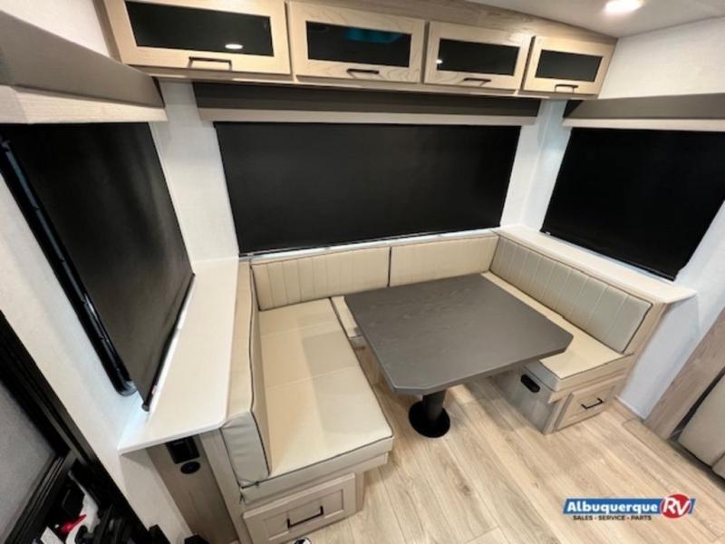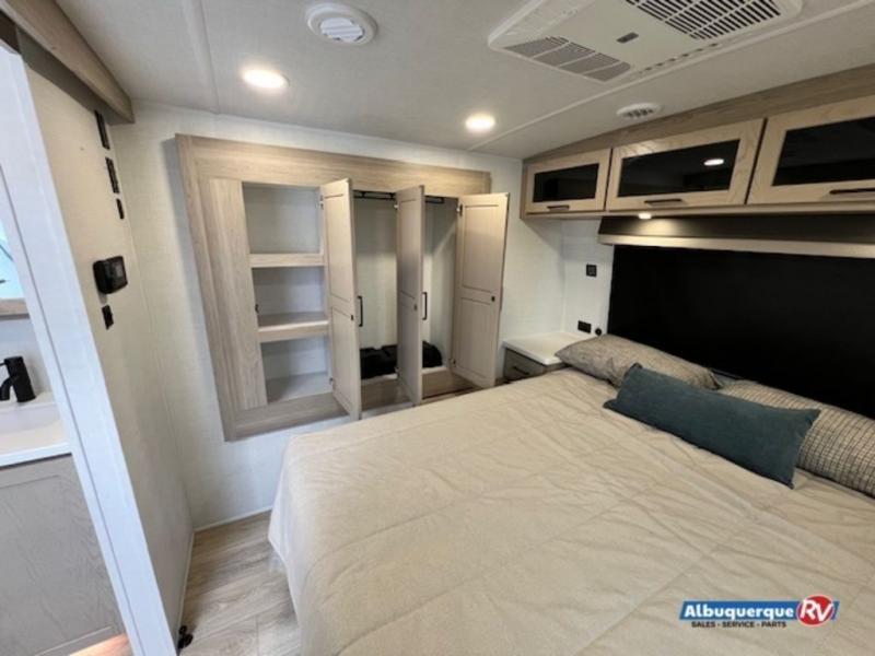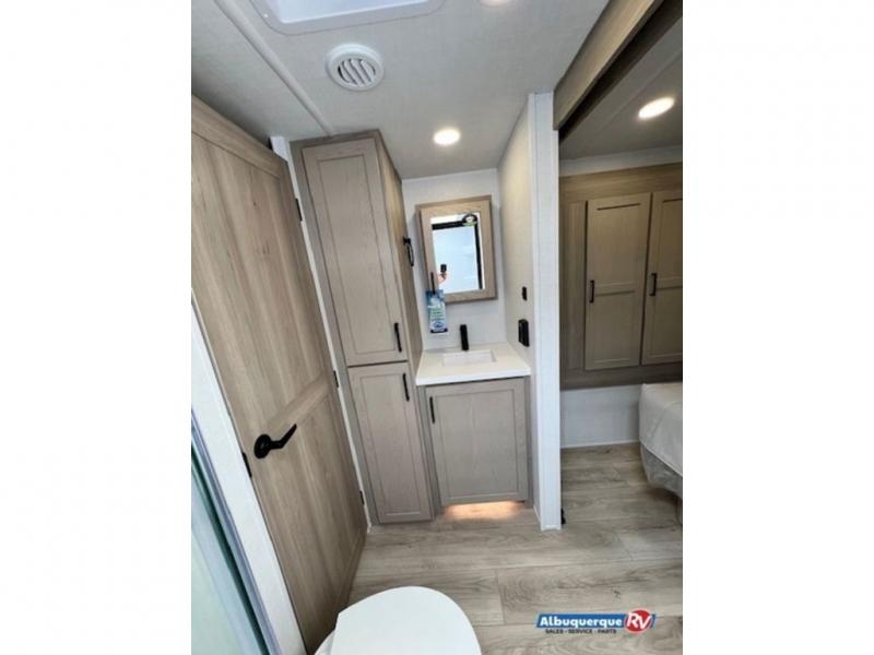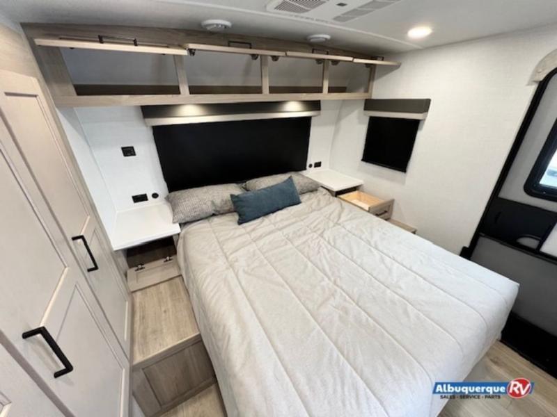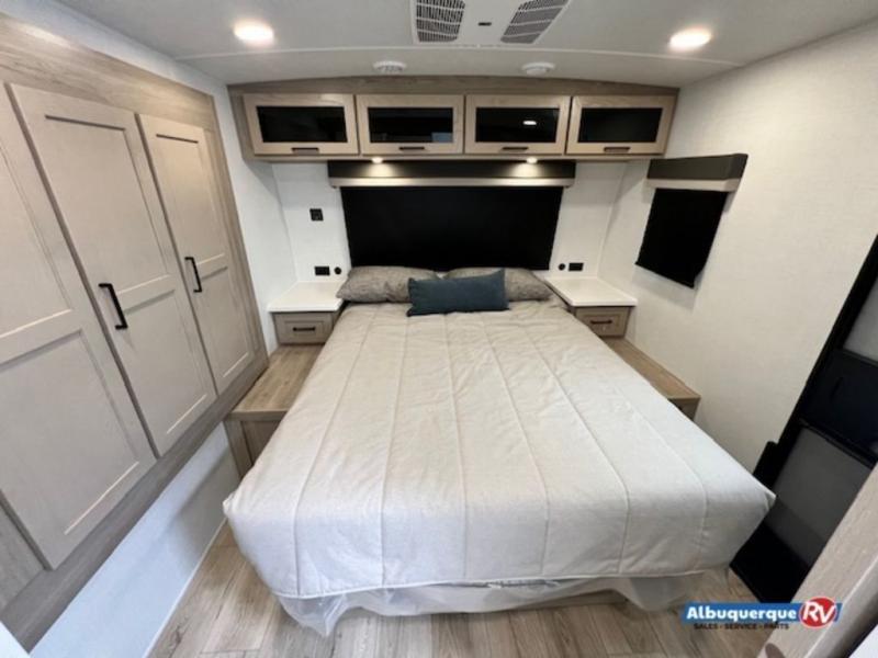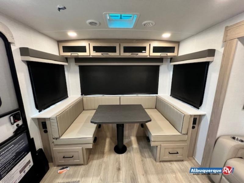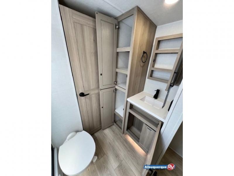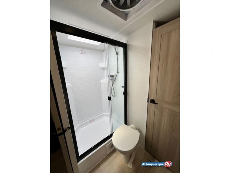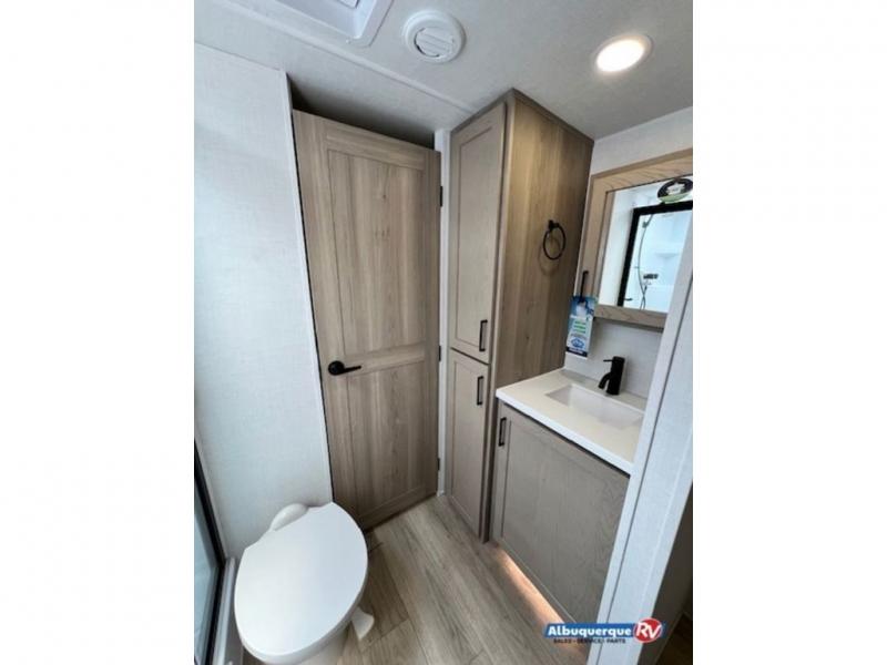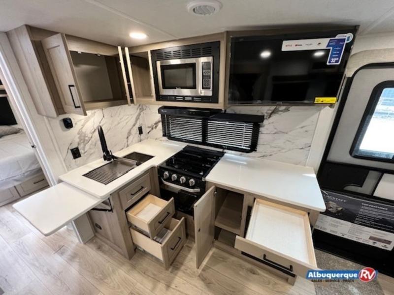 It will be so easy to enjoy time at the campground in this cozy travel trailer. The full kitchen includes a three burner gas oven, a microwave oven, and a 12V refrigerator to cook and store food, and the pantry will let you stock up on snacks. Your crew can get comfortable on the theater seat or around the rear U-shaped dinette, and there is a smart TV here to make it a movie night. The walk-thru bath will let you freshen up each day, and the queen bed in the front bedroom is sure to bring comfort. You will also find one of the dual entry doors here for convenience plus a wardrobe slide out for more storage and floor space. The exterior is just as accommodating with its pass-thru storage, 2" receiver hitch, and 21' power awning!