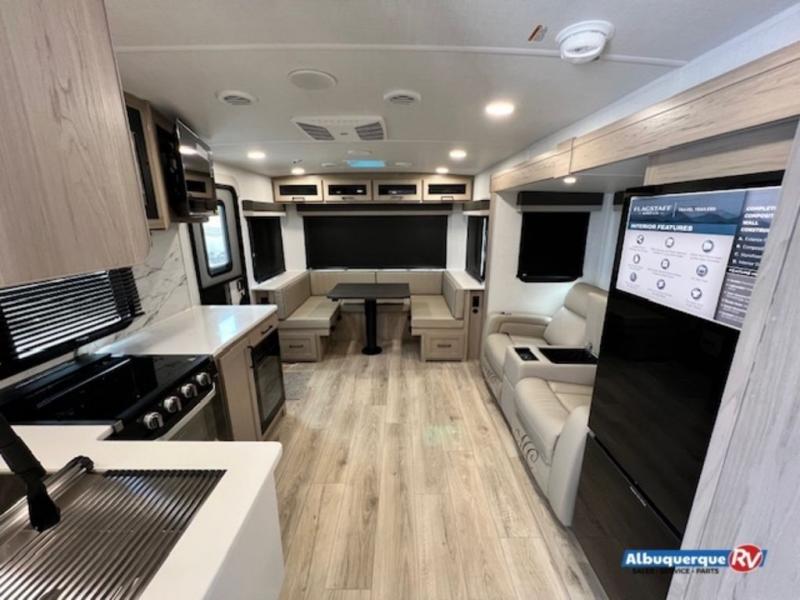 With any Flagstaff Super Lite travel trailer by Forest River, you can enjoy quality features with lightweight towing! The Climate Protection Package includes radiant foil in the front cap, underbelly, and slides, plus there are 12V thermostat-controlled heated tanks for added protection. The complete composite wall construction and 6-sided full-aluminum frame is ultra durable, and the RoadTech tire pressure monitoring adds safety. Each model also includes the Coast to Coast Package that comes with slam latch baggage doors, a high gloss fiberglass cap, Goodyear Endurance tires, plus a 200W solar panel with an optional additional 200W panel for more off grid capabilities. Inside, you'll love the roller shades, solid surface kitchen countertops, a shower miser system, and many more comforts!