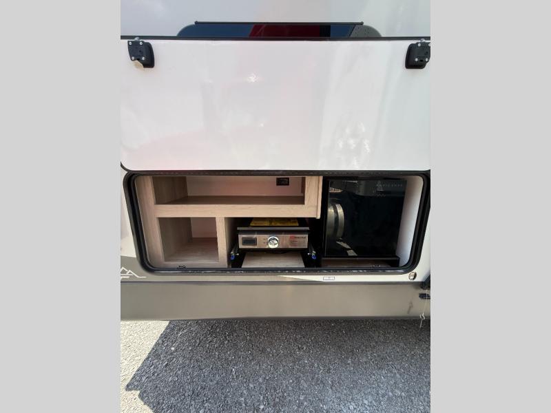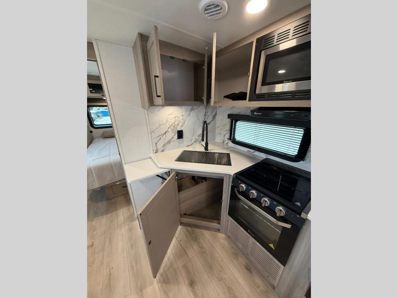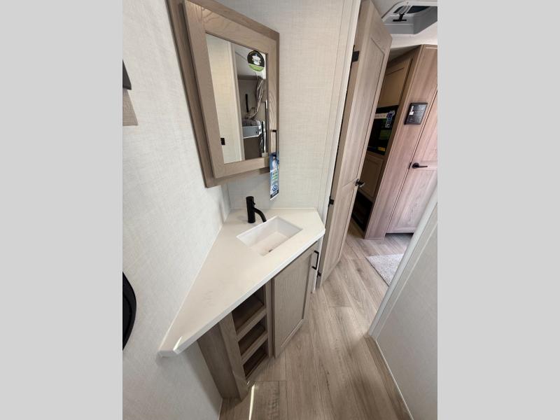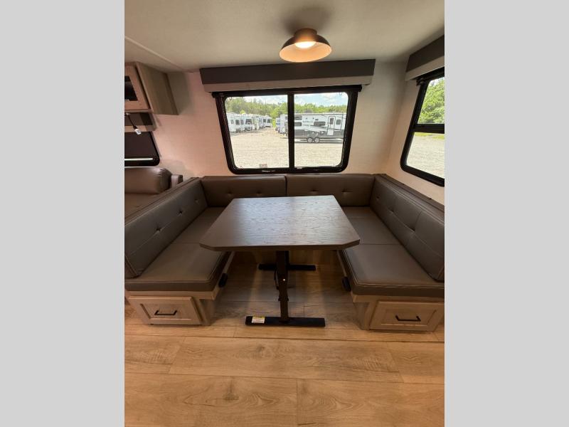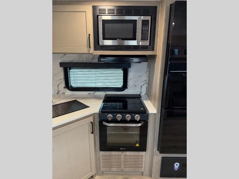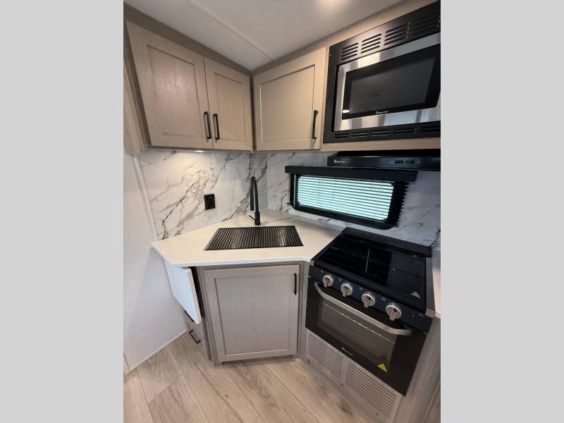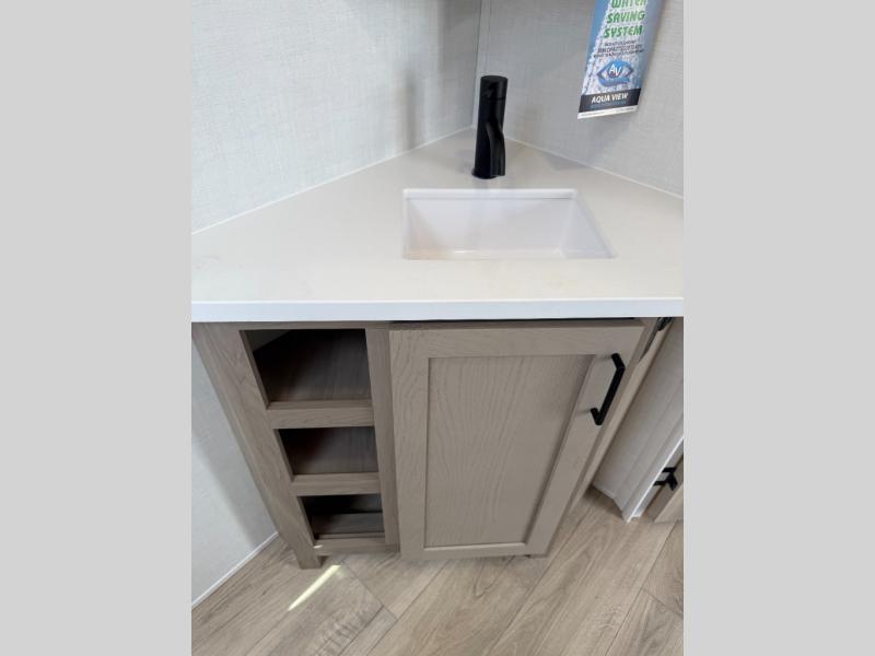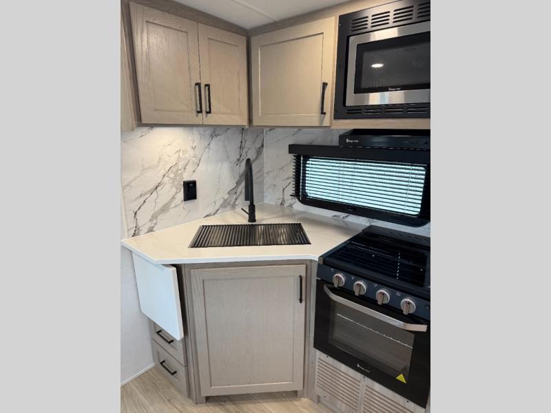 With any Flagstaff Super Lite travel trailer by Forest River the towing features include the TST tire pressure monitor system with a monitor providing safety on the road, Easy Lube axles and Nev-R adjust brakes, a power tongue jack for easy setup, and rear observation camera prep. Each is built with 6 sided aluminum framed side walls, end wall, front, floor and a roof, a plywood tongue and groove subfloor, electronically controlled heated holding tanks and an enclosed underbelly allowing you to travel during any season. The interior includes designer kitchen backsplash, solid surface kitchen countertops, Sedonwood cabinetry, and solid wood cabinet doors and drawers to make you feel right at home.