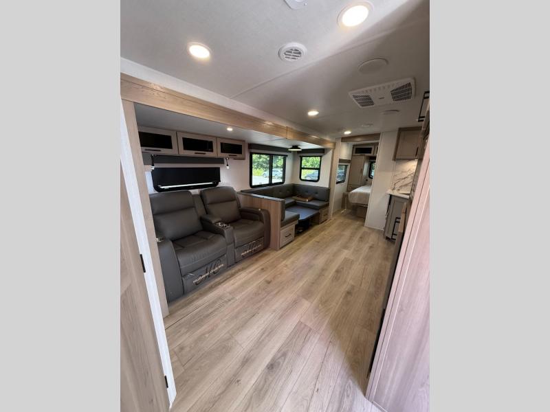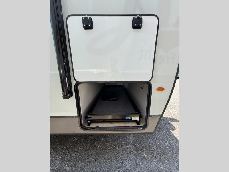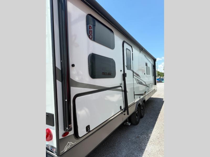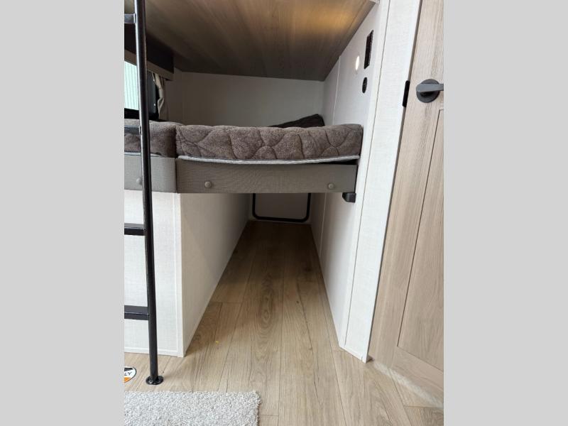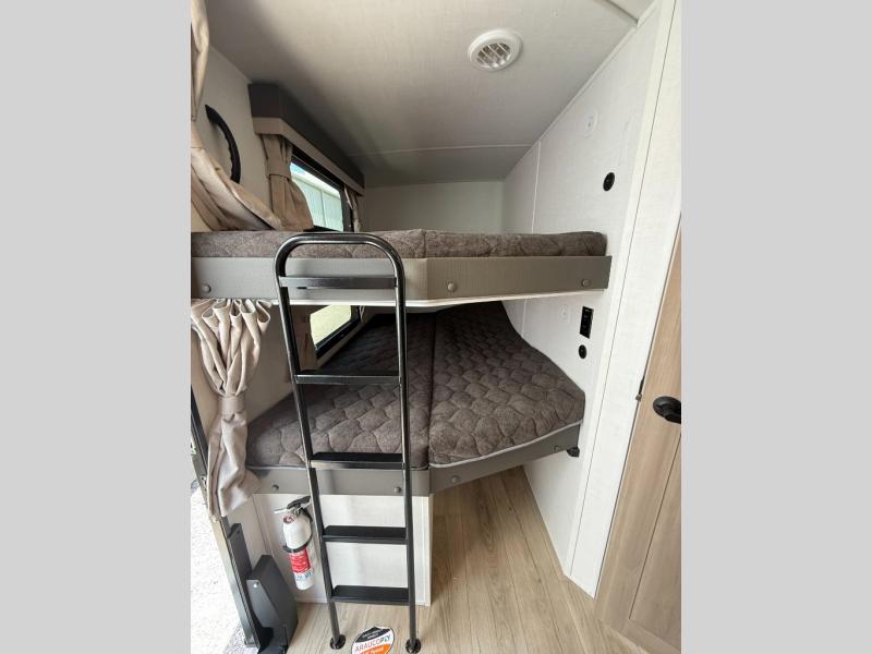 Get ready for a fun camping experience with your family and friends in this trailer that sleeps eight! From the rear double size bunks to the front bedroom's queen bed, and the furniture in the spacious main living area, everyone will find a place to lay their head at night. The cook will have full amenities inside and the choice to make meals on the outside kitchen when feeding everyone. There is abundant storage for your snacks and dry ingredients in the walk-in pantry, your cold items in the 12V refrigerator, and throughout the interior and along the exterior. You can load the larger gear in the front pass-thru storage with an optional steel sliding tray, and there is also an optional front door leading to the bedroom if you want even more convenience!