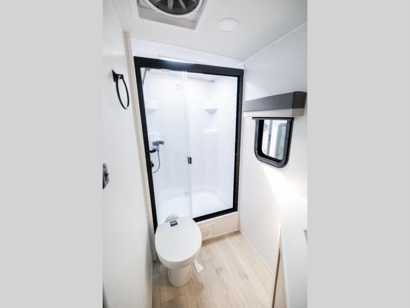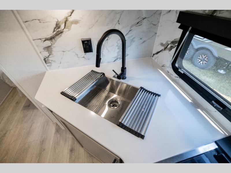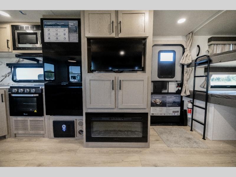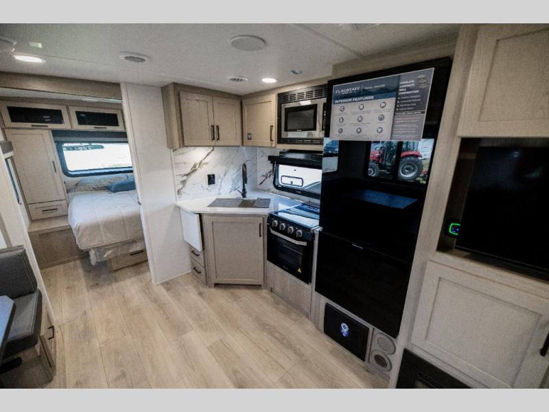 With any Flagstaff Super Lite travel trailer by Forest River the towing features include the TST tire pressure monitor system with a monitor providing safety on the road, Easy Lube axles and Nev-R adjust brakes, a power tongue jack for easy setup, and rear observation camera prep. Each is built with 6 sided aluminum framed side walls, end wall, front, floor and a roof, a plywood tongue and groove subfloor, electronically controlled heated holding tanks and an enclosed underbelly allowing you to travel during any season. The interior includes designer kitchen backsplash, solid surface kitchen countertops, Sedonwood cabinetry, and solid wood cabinet doors and drawers to make you feel right at home.