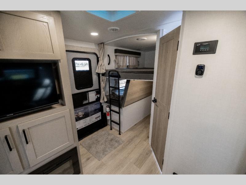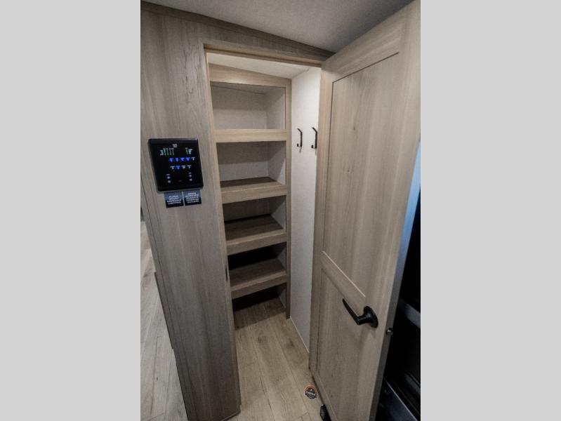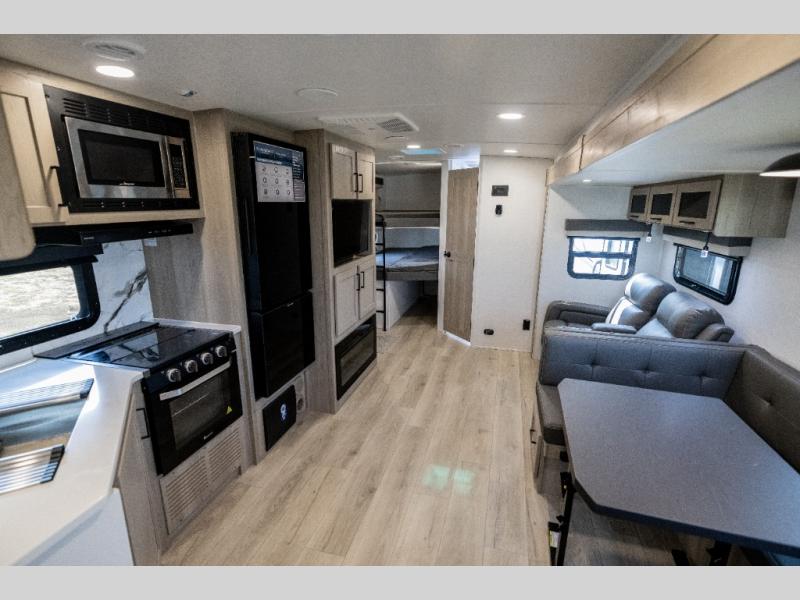 Get ready for a fun camping experience with your family and friends in this trailer that sleeps eight! From the rear double size bunks to the front bedroom's queen bed, and the furniture in the spacious main living area, everyone will find a place to lay their head at night. The cook will have full amenities inside and the choice to make meals on the outside kitchen when feeding everyone. There is abundant storage for your snacks and dry ingredients in the walk-in pantry, your cold items in the 12V refrigerator, and throughout the interior and along the exterior. You can load the larger gear in the front pass-thru storage with an optional steel sliding tray, and there is also an optional front door leading to the bedroom if you want even more convenience!