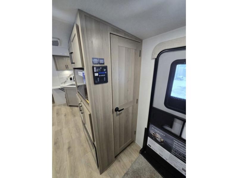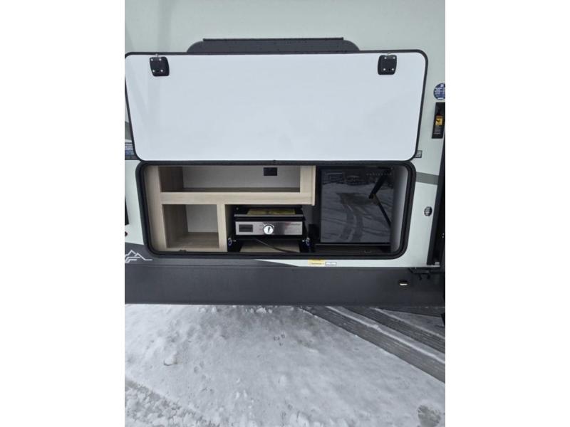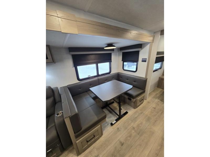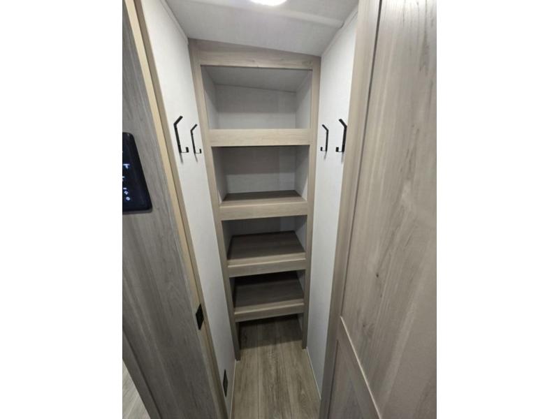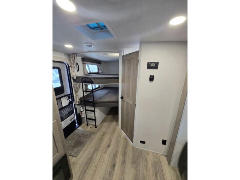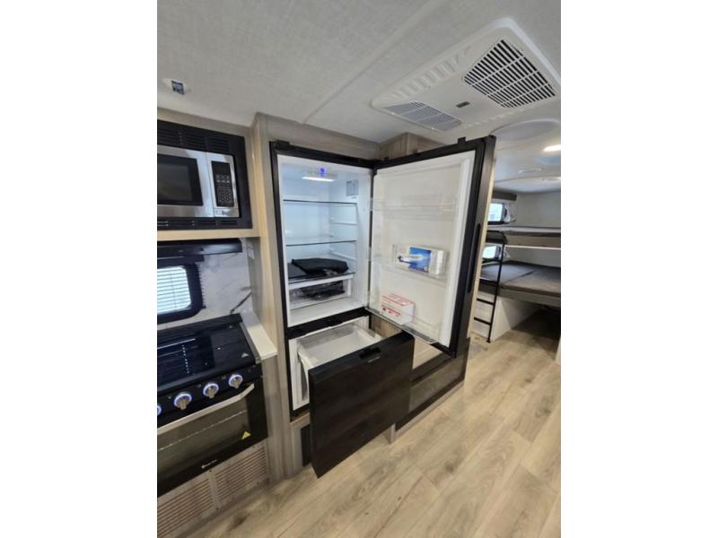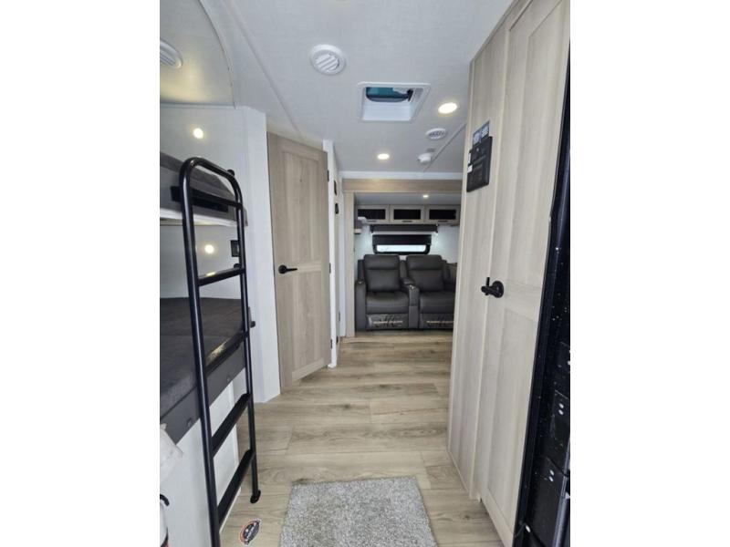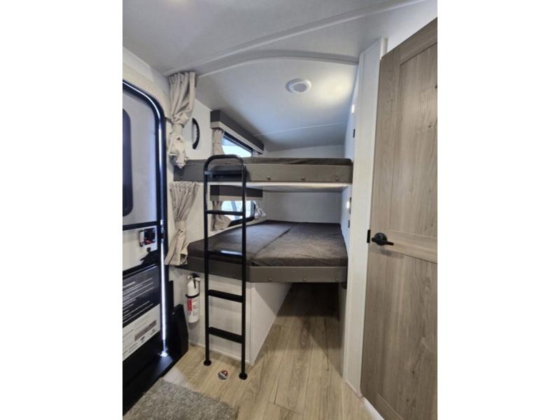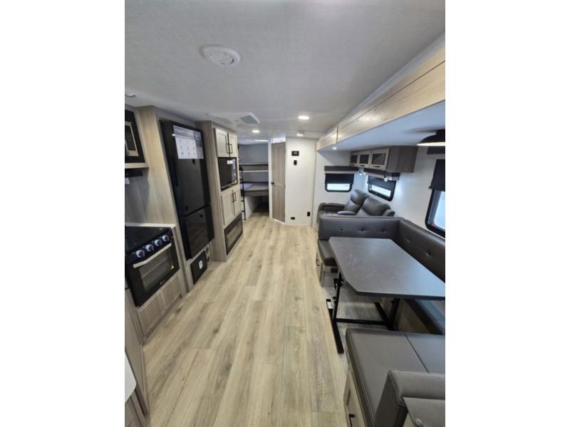 Get ready for a fun camping experience with your family and friends in this trailer that sleeps eight! From the rear double size bunks to the front bedroom's queen bed, and the furniture in the spacious main living area, everyone will find a place to lay their head at night. The cook will have full amenities inside and the choice to make meals on the outside kitchen when feeding everyone. There is abundant storage for your snacks and dry ingredients in the walk-in pantry, your cold items in the 12V refrigerator, and throughout the interior and along the exterior. You can load the larger gear in the front pass-thru storage with an optional steel sliding tray, and there is also an optional front door leading to the bedroom if you want even more convenience!