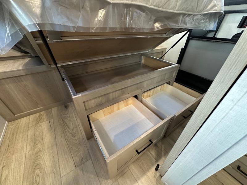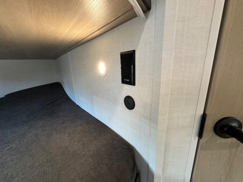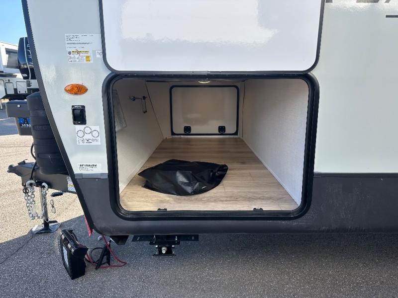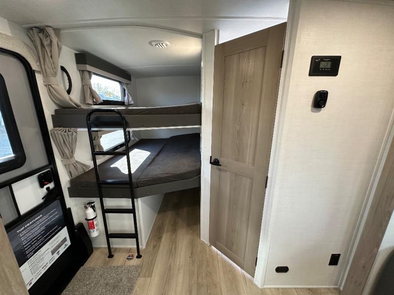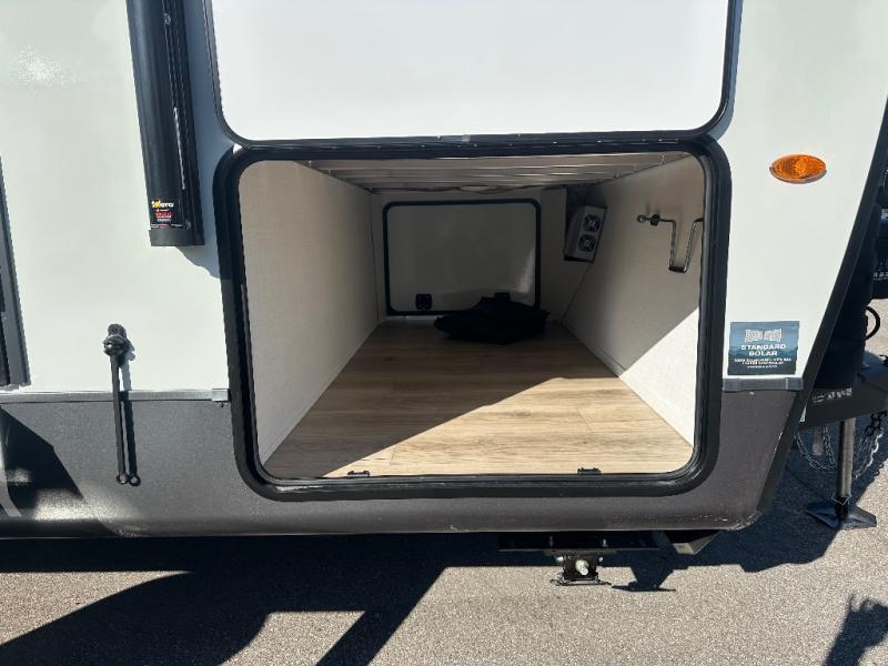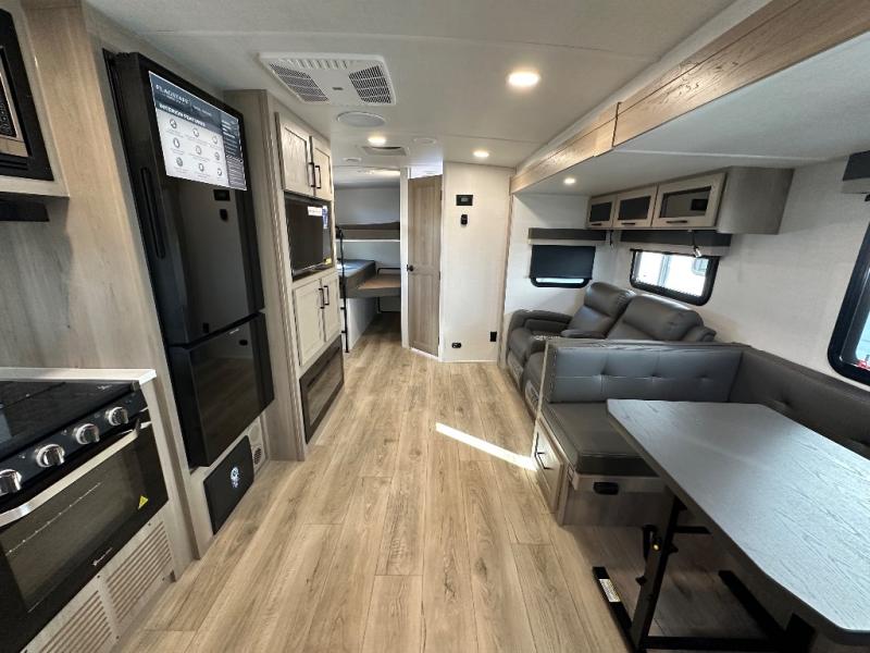 Get ready for a fun camping experience with your family and friends in this trailer that sleeps eight! From the rear double size bunks to the front bedroom's queen bed, and the furniture in the spacious main living area, everyone will find a place to lay their head at night. The cook will have full amenities inside and the choice to make meals on the outside kitchen when feeding everyone. There is abundant storage for your snacks and dry ingredients in the walk-in pantry, your cold items in the 12V refrigerator, and throughout the interior and along the exterior. You can load the larger gear in the front pass-thru storage with an optional steel sliding tray, and there is also an optional front door leading to the bedroom if you want even more convenience!