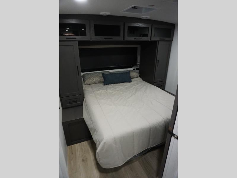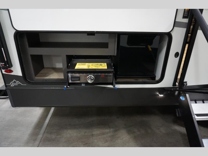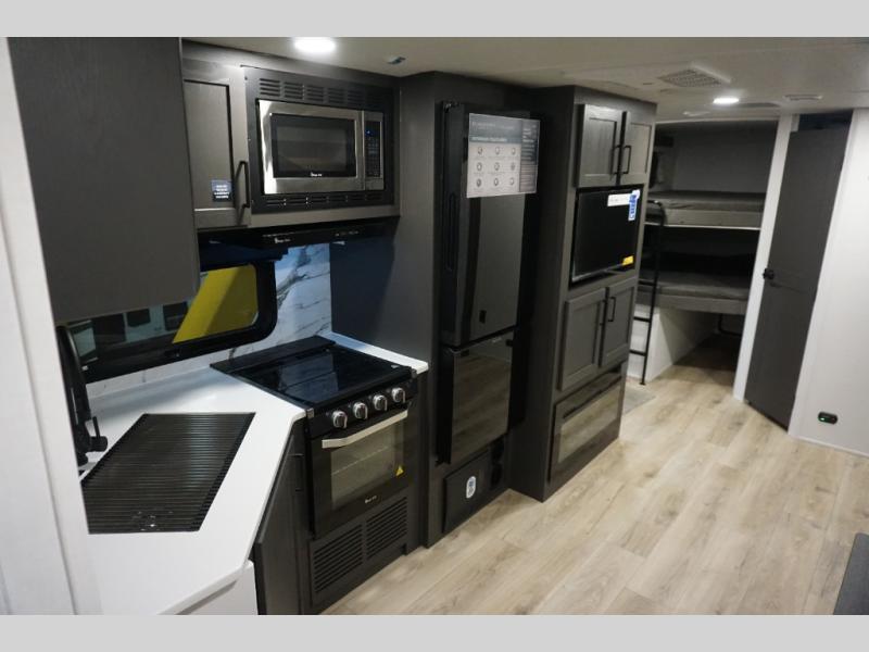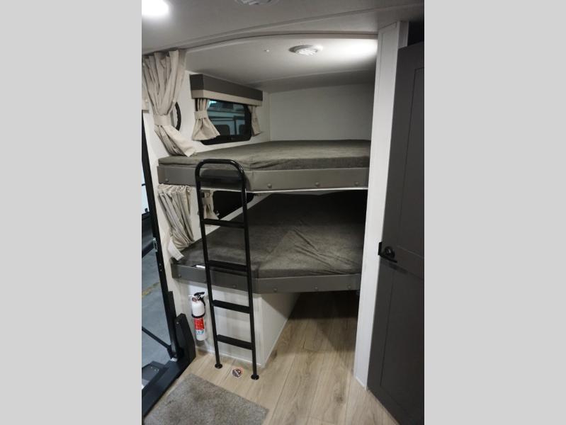 Get ready for a fun camping experience with your family and friends in this trailer that sleeps eight! From the rear double size bunks to the front bedroom's queen bed, and the furniture in the spacious main living area, everyone will find a place to lay their head at night. The cook will have full amenities inside and the choice to make meals on the outside kitchen when feeding everyone. There is abundant storage for your snacks and dry ingredients in the walk-in pantry, your cold items in the 12V refrigerator, and throughout the interior and along the exterior. You can load the larger gear in the front pass-thru storage with an optional steel sliding tray, and there is also an optional front door leading to the bedroom if you want even more convenience!