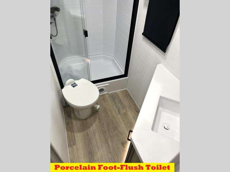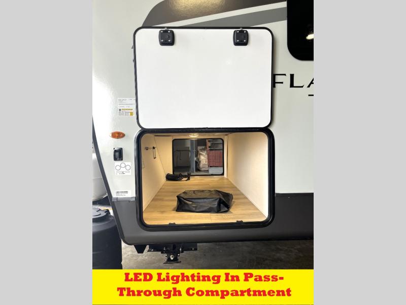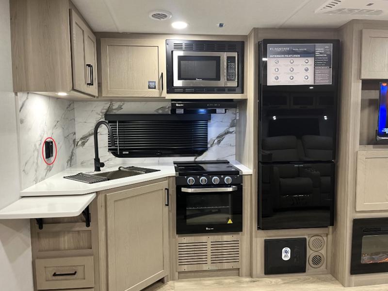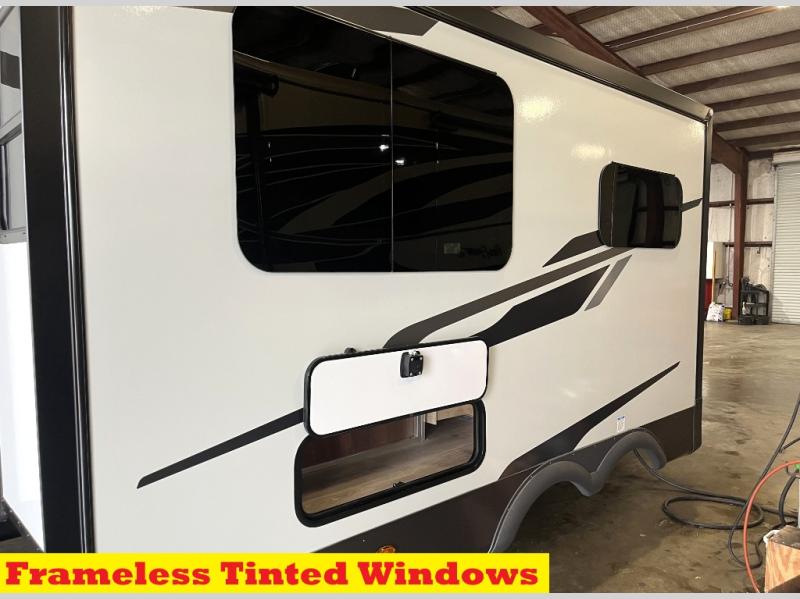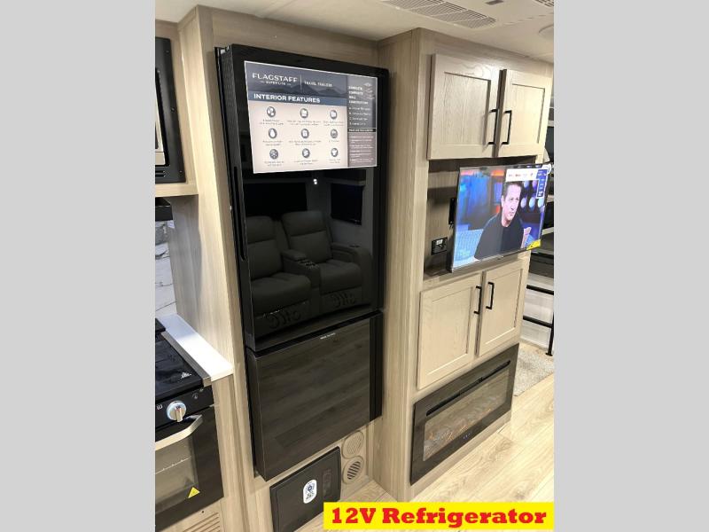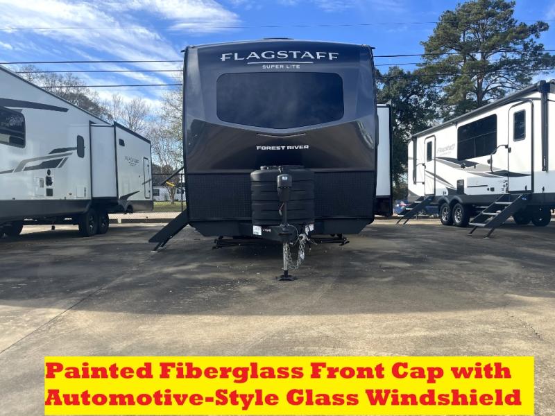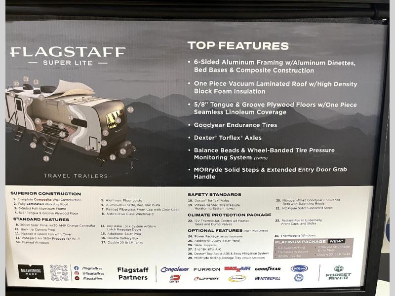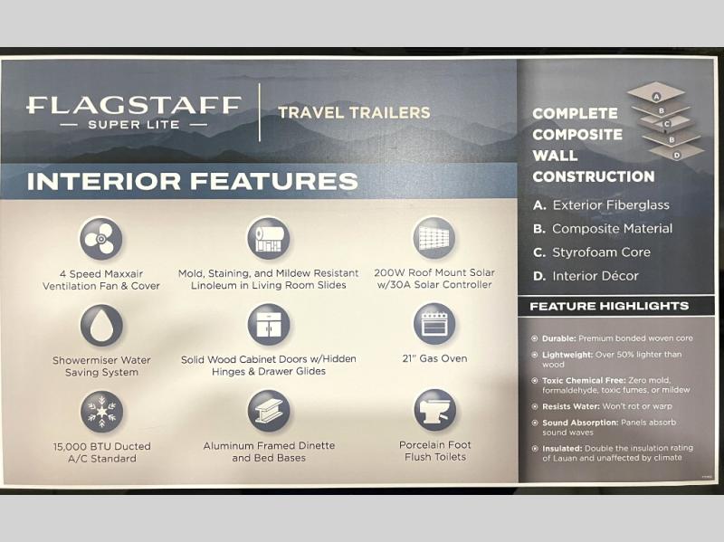 With any Flagstaff Super Lite travel trailer by Forest River, you can enjoy quality features with lightweight towing! The Climate Protection Package includes radiant foil in the front cap, underbelly, and slides, plus there are 12V thermostat-controlled heated tanks for added protection. The complete composite wall construction and 6-sided full-aluminum frame is ultra durable, and the RoadTech tire pressure monitoring adds safety. Each model also includes the Coast to Coast Package that comes with slam latch baggage doors, a high gloss fiberglass cap, Goodyear Endurance tires, plus a 200W solar panel with an optional additional 200W panel for more off grid capabilities. Inside, you'll love the roller shades, solid surface kitchen countertops, a shower miser system, and many more comforts!