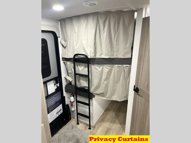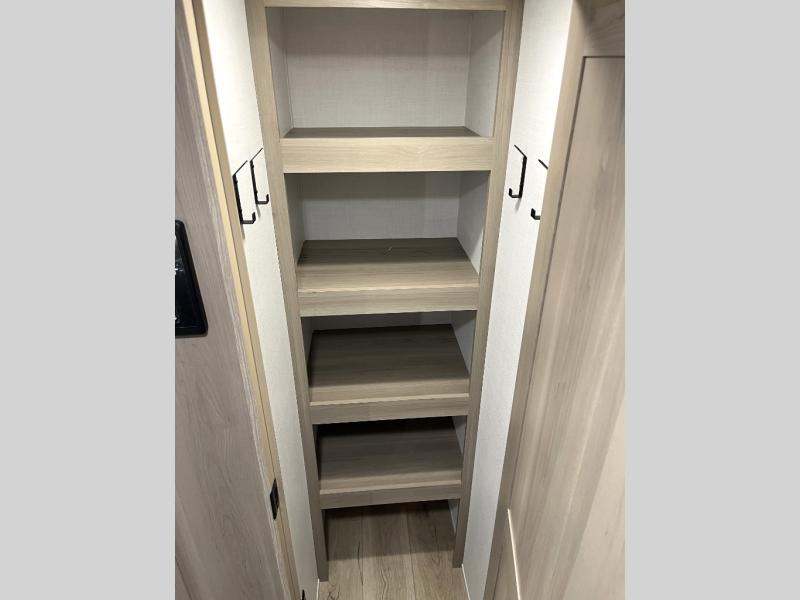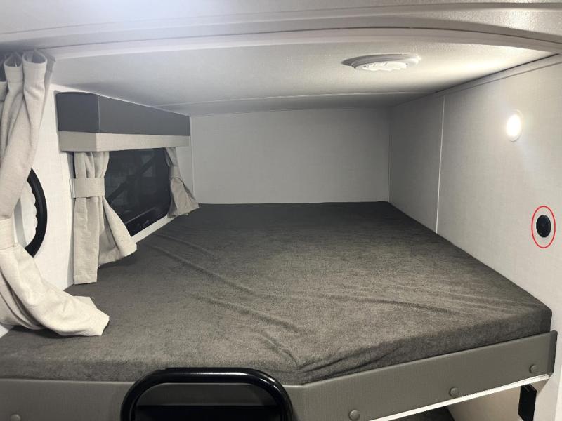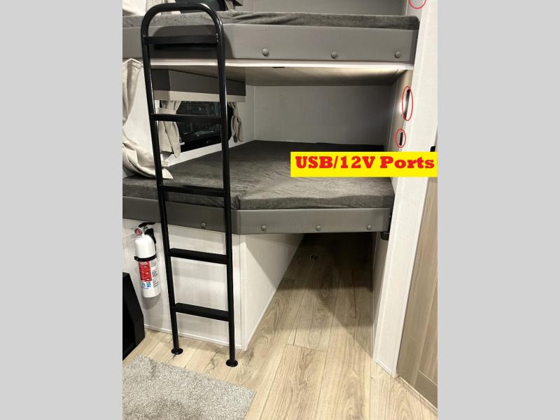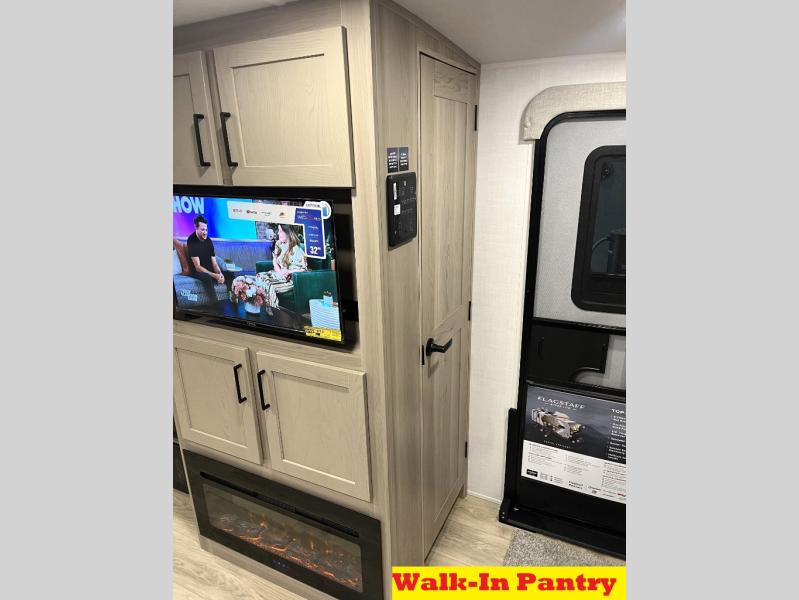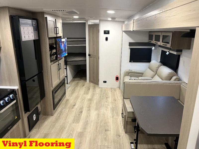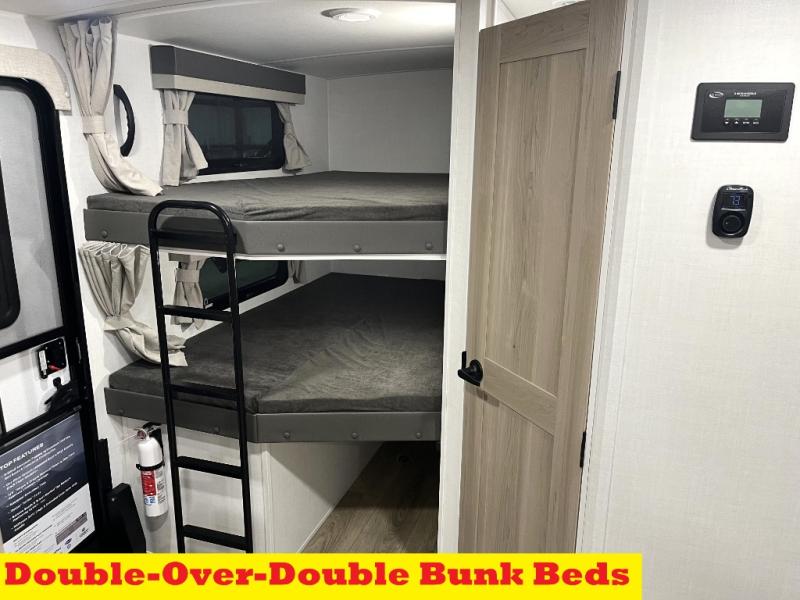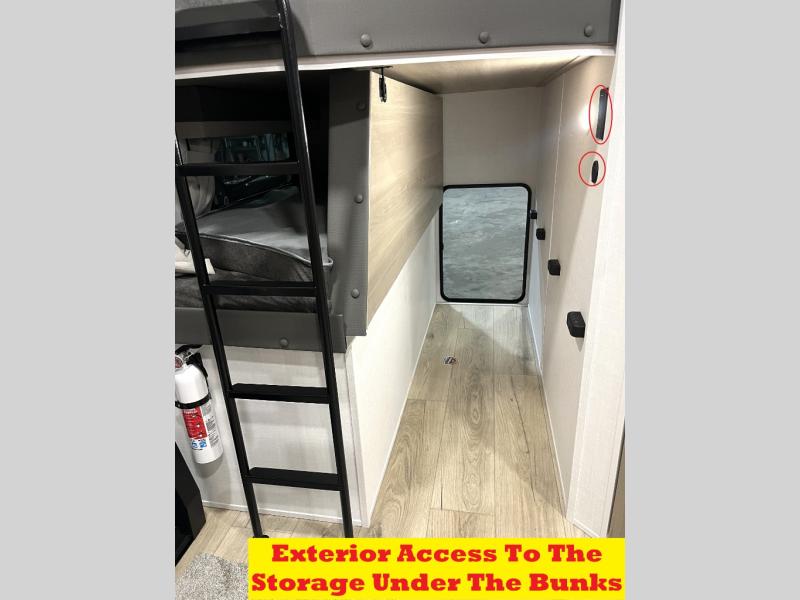 Get ready for a fun camping experience with your family and friends in this trailer that sleeps eight! From the rear double size bunks to the front bedroom's queen bed, and the furniture in the spacious main living area, everyone will find a place to lay their head at night. The cook will have full amenities inside and the choice to make meals on the outside kitchen when feeding everyone. There is abundant storage for your snacks and dry ingredients in the walk-in pantry, your cold items in the 12V refrigerator, and throughout the interior and along the exterior. You can load the larger gear in the front pass-thru storage with an optional steel sliding tray, and there is also an optional front door leading to the bedroom if you want even more convenience!