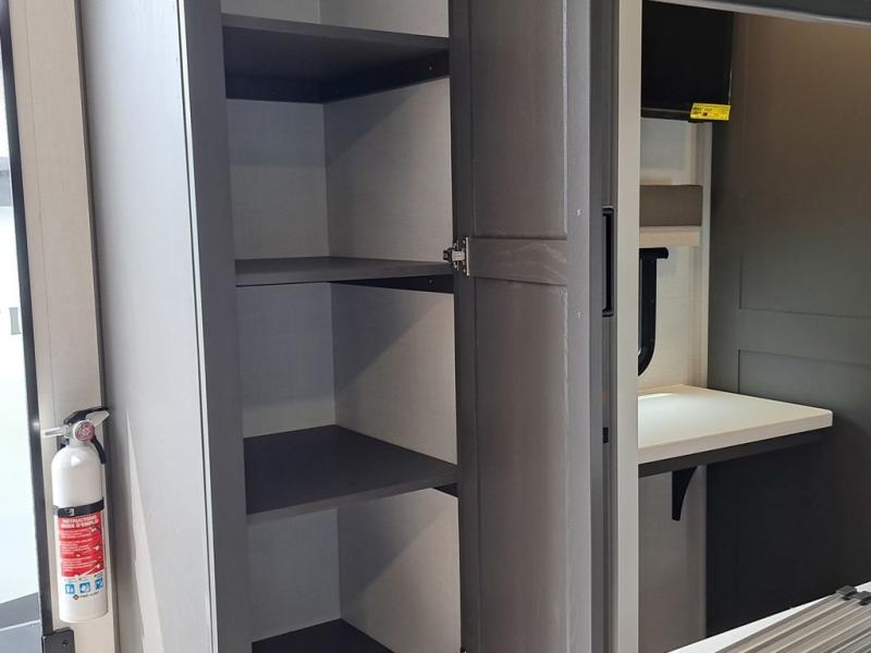 Get ready for a fun camping experience with your family and friends in this trailer that sleeps five to six! There is a rear bunkhouse suite with 43" x 74" bunks, a desk, and a half bath for added convenience. You will also find a front master bedroom with a queen bed, easy access to the walk-thru bath, and one of the dual entry doors. There is abundant storage for your snacks and dry ingredients in the pantry/wardrobe, your cold items in the 12V refrigerator, and throughout the interior and along the exterior. You can load the larger gear in the front pass-thru with an optional steel sliding tray, and other outdoor items in the rear or side storage compartments.