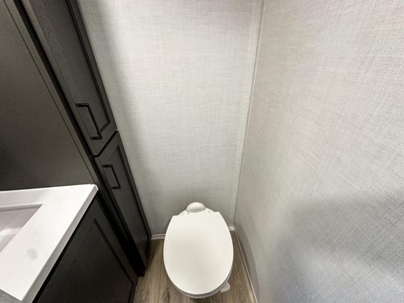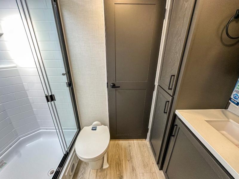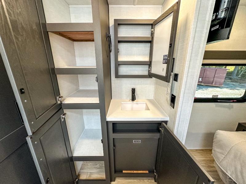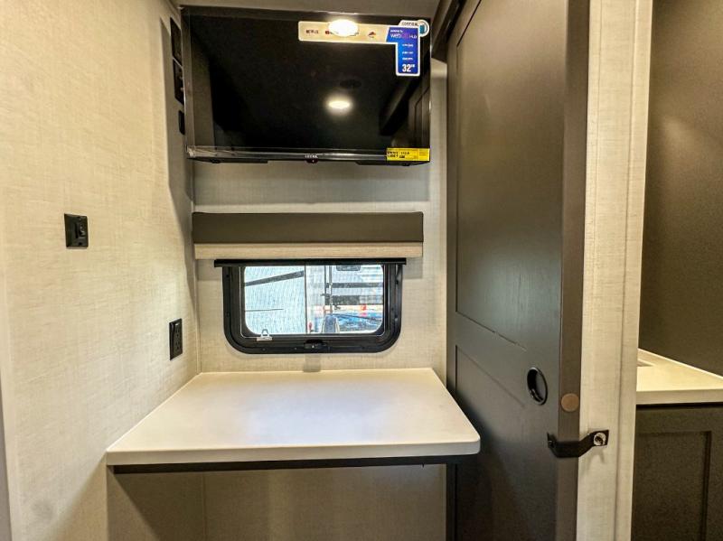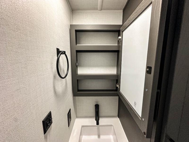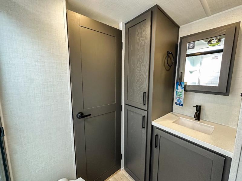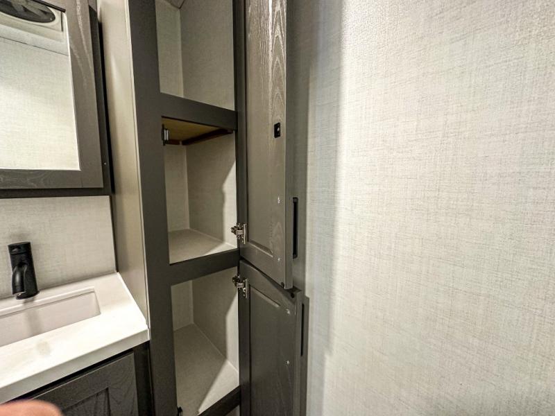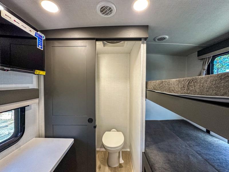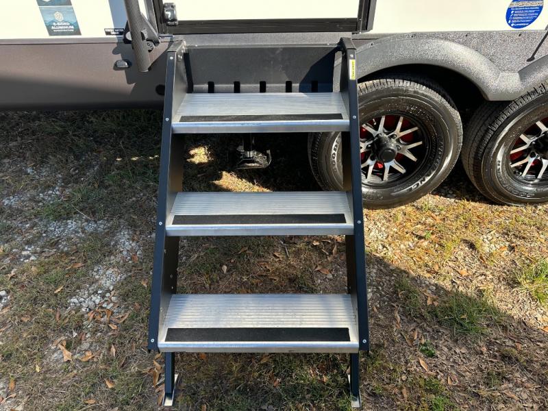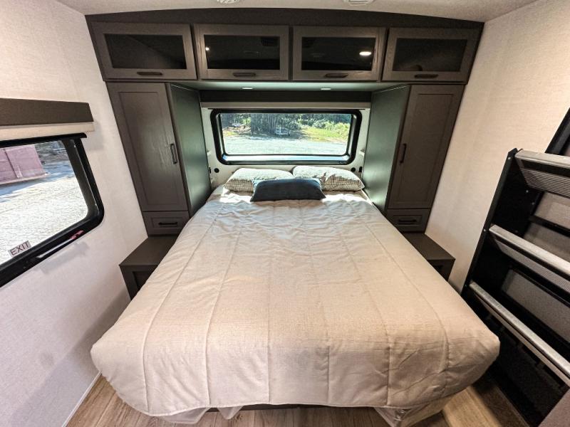 Get ready for a fun camping experience with your family and friends in this trailer that sleeps five to six! There is a rear bunkhouse suite with 43" x 74" bunks, a desk, and a half bath for added convenience. You will also find a front master bedroom with a queen bed, easy access to the walk-thru bath, and one of the dual entry doors. There is abundant storage for your snacks and dry ingredients in the pantry/wardrobe, your cold items in the 12V refrigerator, and throughout the interior and along the exterior. You can load the larger gear in the front pass-thru with an optional steel sliding tray, and other outdoor items in the rear or side storage compartments.
