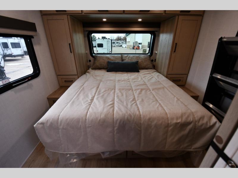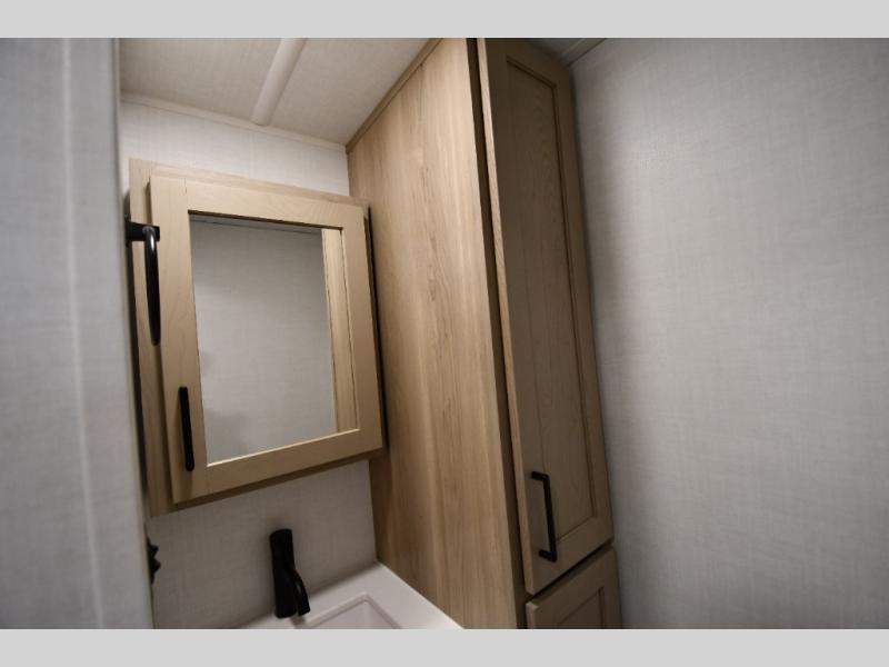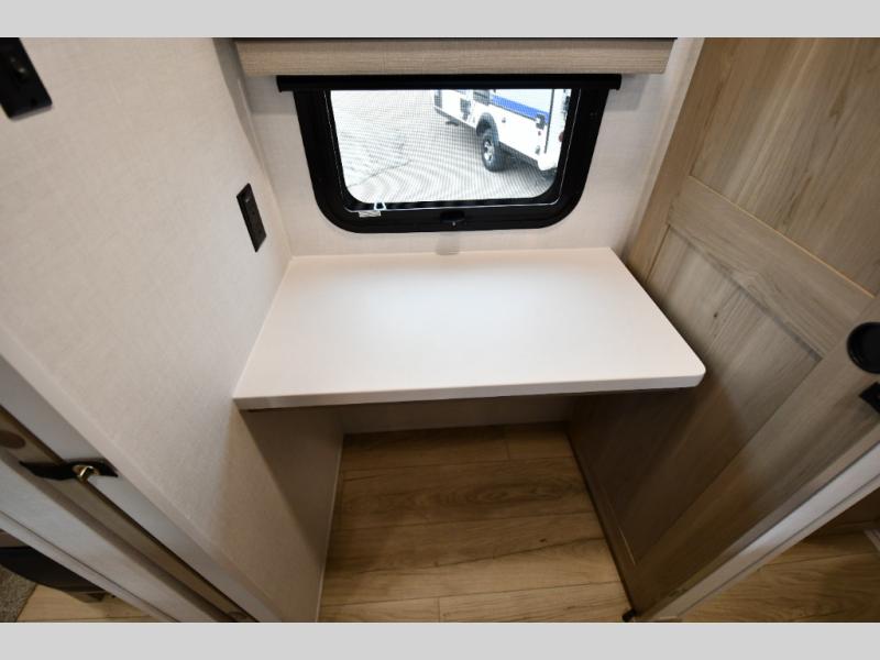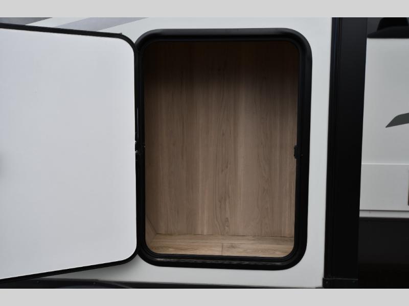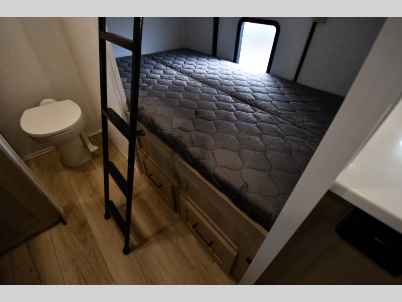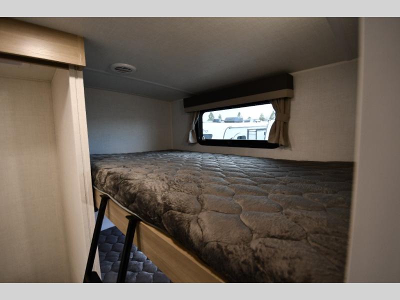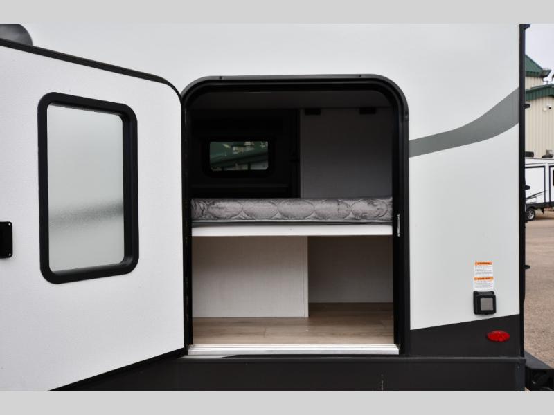 Get ready for a fun camping experience with your family and friends in this trailer that sleeps five to six! There is a rear bunkhouse suite with 43" x 74" bunks, a desk, and a half bath for added convenience. You will also find a front master bedroom with a queen bed, easy access to the walk-thru bath, and one of the dual entry doors. There is abundant storage for your snacks and dry ingredients in the pantry/wardrobe, your cold items in the 12V refrigerator, and throughout the interior and along the exterior. You can load the larger gear in the front pass-thru with an optional steel sliding tray, and other outdoor items in the rear or side storage compartments.