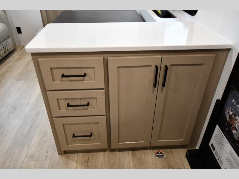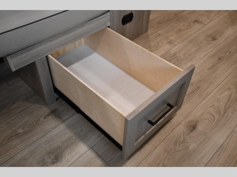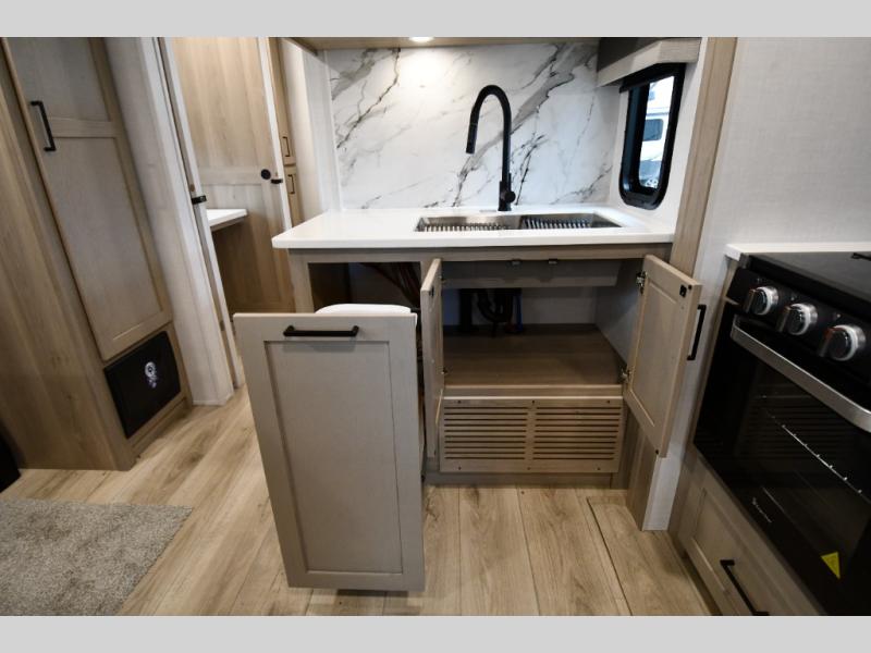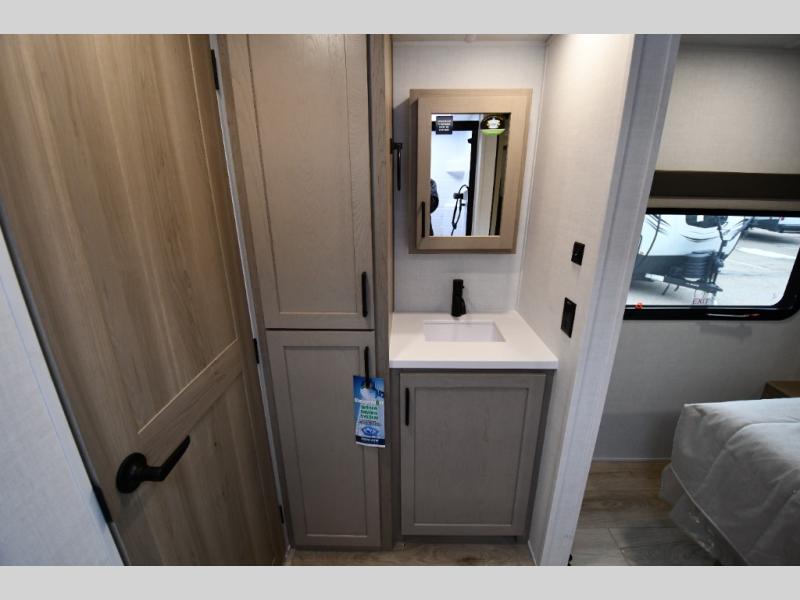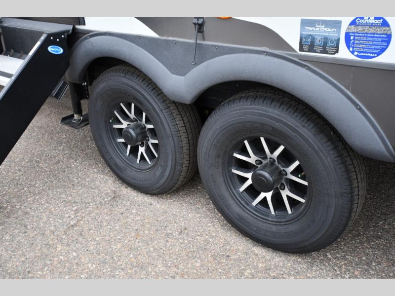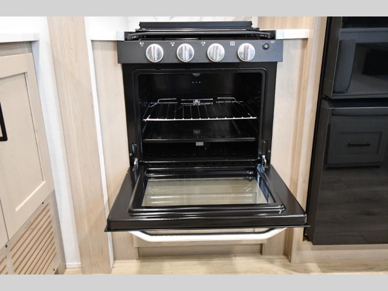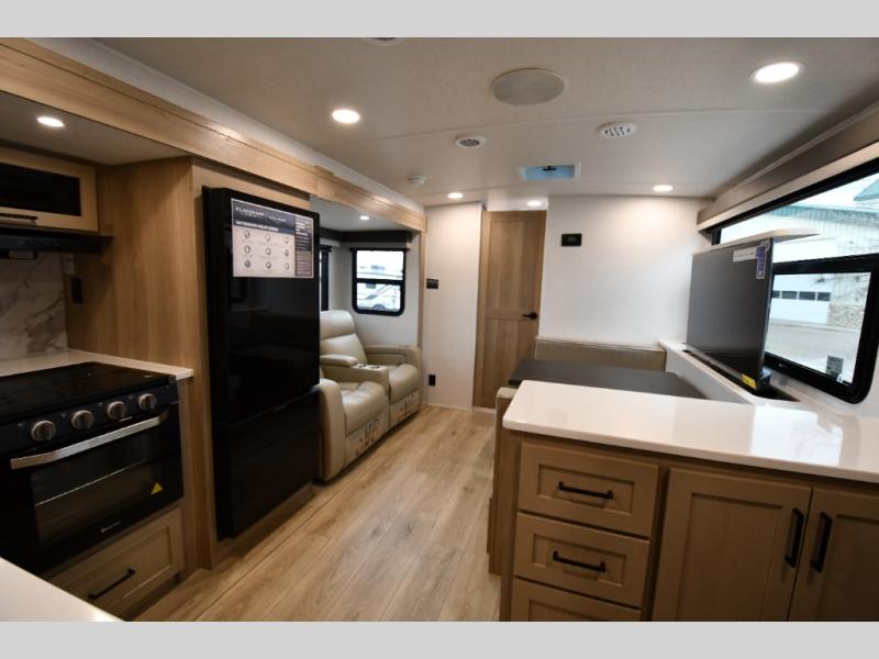 Get ready for a fun camping experience with your family and friends in this trailer that sleeps five to six! There is a rear bunkhouse suite with 43" x 74" bunks, a desk, and a half bath for added convenience. You will also find a front master bedroom with a queen bed, easy access to the walk-thru bath, and one of the dual entry doors. There is abundant storage for your snacks and dry ingredients in the pantry/wardrobe, your cold items in the 12V refrigerator, and throughout the interior and along the exterior. You can load the larger gear in the front pass-thru with an optional steel sliding tray, and other outdoor items in the rear or side storage compartments.
