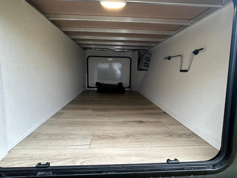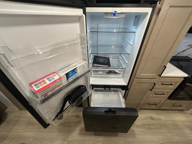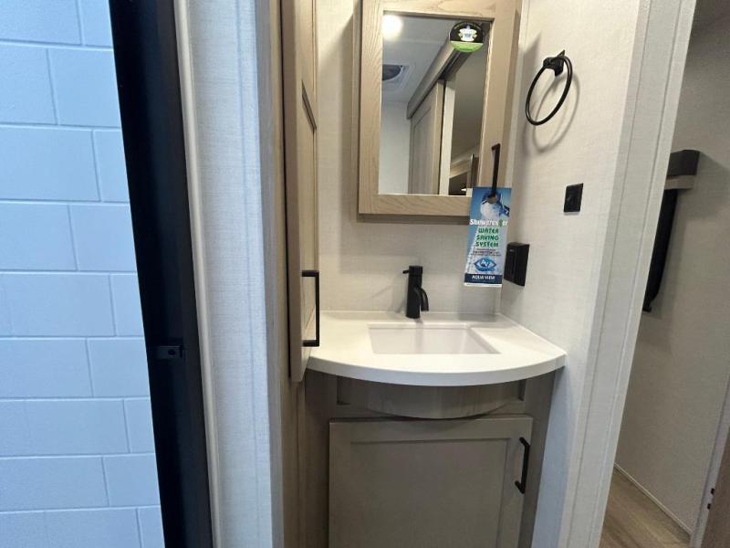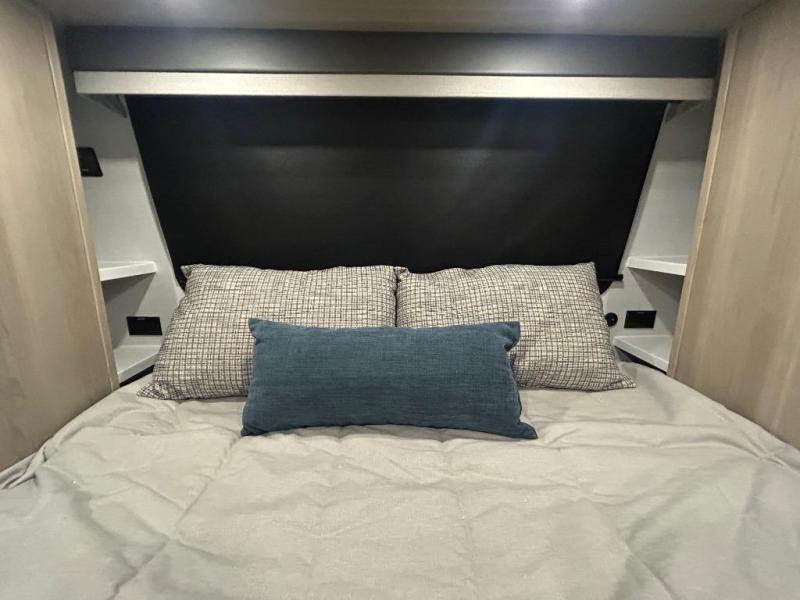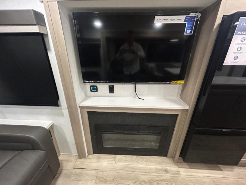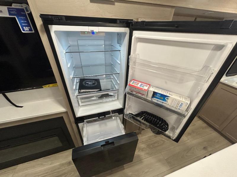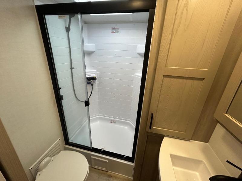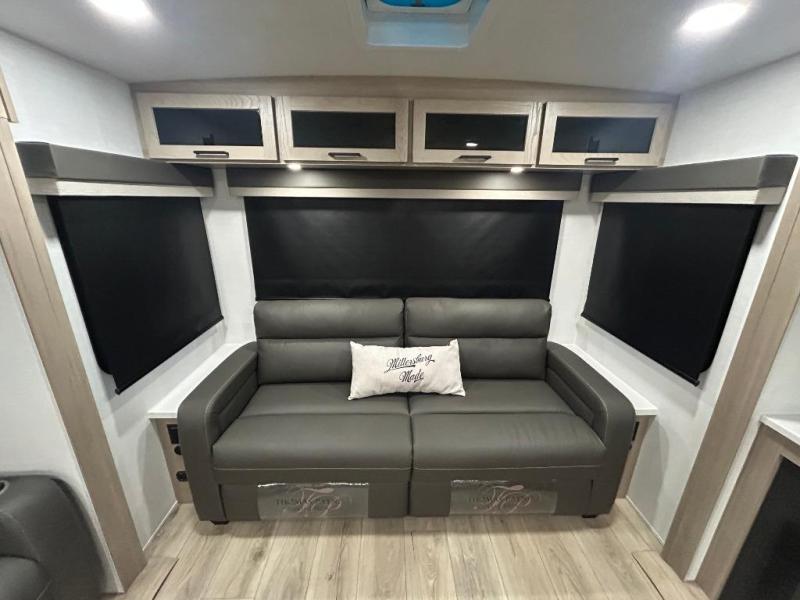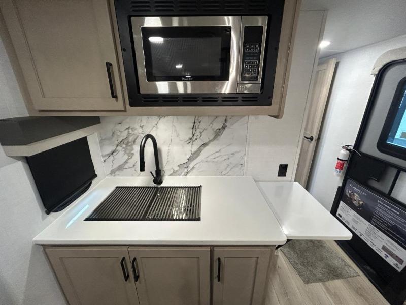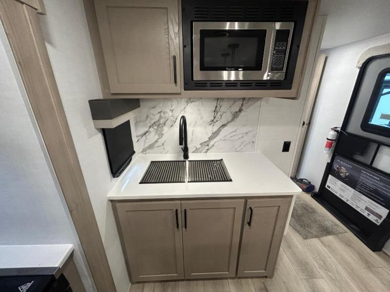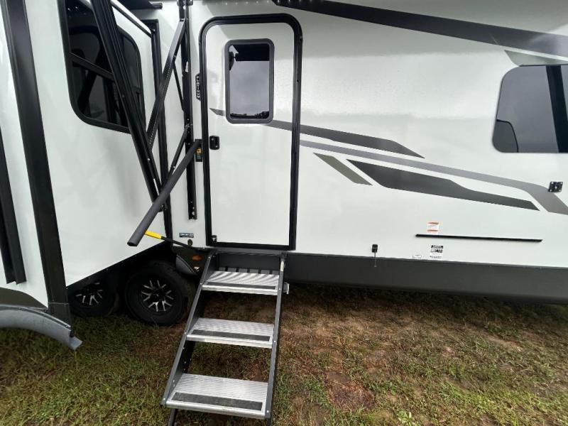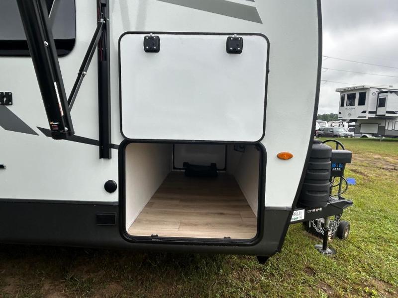 You'll feel right at home when staying in this spacious travel trailer. There are dual opposing slides in the combined kitchen and living area, and the large kitchen island will give the chef of your group more counter space to prep meals. Your crew can dine at the booth dinette, relax on the theater seat, and sleep on the hide-a-bed sofa. You'll find your own space in the front private bedroom that includes a queen bed, triple wardrobes, and a TV option. Head outdoors to find two power awnings, a rear 2" receiver hitch, and a pass-thru storage with an optional steel sliding tray.