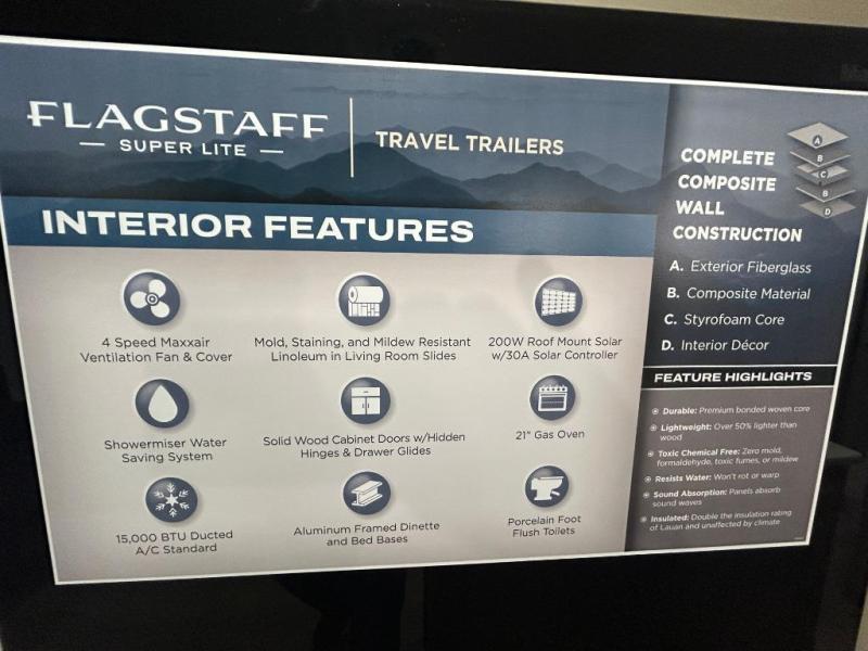 With any Flagstaff Super Lite travel trailer by Forest River, you can enjoy quality features with lightweight towing! The Climate Protection Package includes radiant foil in the front cap, underbelly, and slides, plus there are 12V thermostat-controlled heated tanks for added protection. The complete composite wall construction and 6-sided full-aluminum frame is ultra durable, and the RoadTech tire pressure monitoring adds safety. Each model also includes the Coast to Coast Package that comes with slam latch baggage doors, a high gloss fiberglass cap, Goodyear Endurance tires, plus a 200W solar panel with an optional additional 200W panel for more off grid capabilities. Inside, you'll love the roller shades, solid surface kitchen countertops, a shower miser system, and many more comforts!