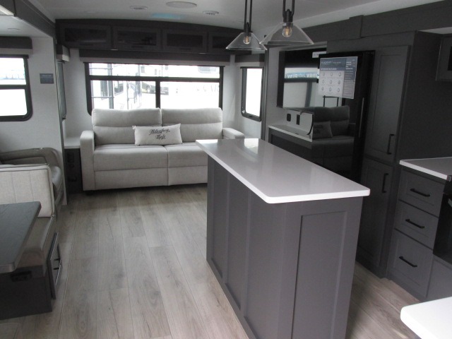 You'll feel right at home when staying in this spacious travel trailer. There are dual opposing slides in the combined kitchen and living area, and the large kitchen island will give the chef of your group more counter space to prep meals. Your crew can dine at the booth dinette, relax on the theater seat, and sleep on the hide-a-bed sofa. You'll find your own space in the front private bedroom that includes a queen bed, triple wardrobes, and a TV option. Head outdoors to find two power awnings, a rear 2" receiver hitch, and a pass-thru storage with an optional steel sliding tray.