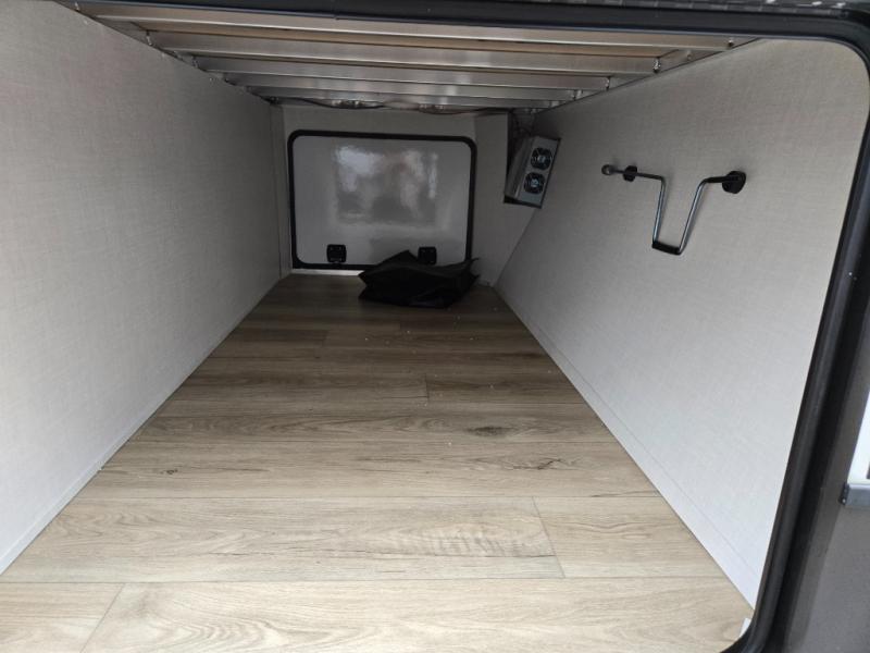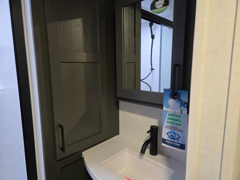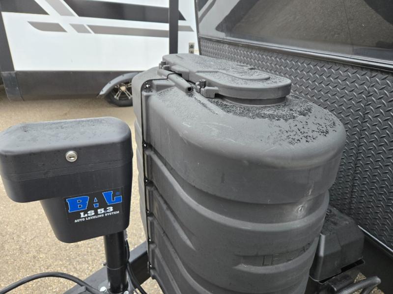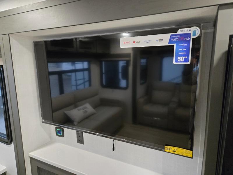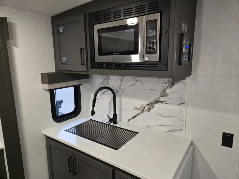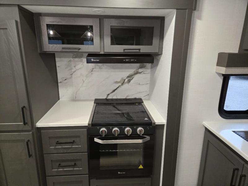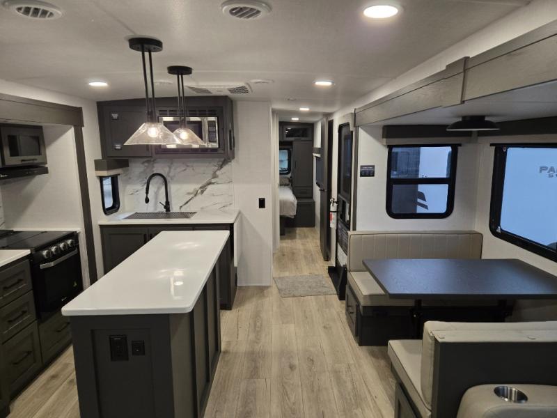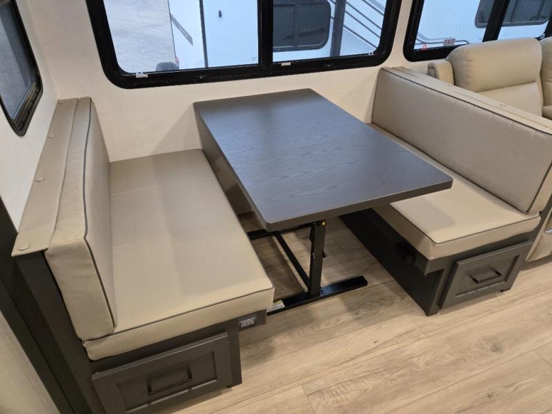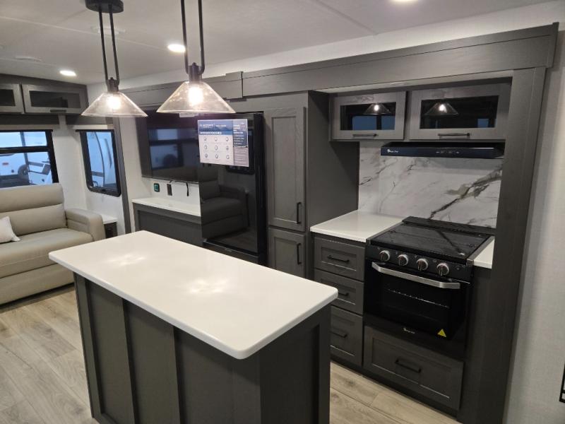 You'll feel right at home when staying in this spacious travel trailer. There are dual opposing slides in the combined kitchen and living area, and the large kitchen island will give the chef of your group more counter space to prep meals. Your crew can dine at the booth dinette, relax on the theater seat, and sleep on the hide-a-bed sofa. You'll find your own space in the front private bedroom that includes a queen bed, triple wardrobes, and a TV option. Head outdoors to find two power awnings, a rear 2" receiver hitch, and a pass-thru storage with an optional steel sliding tray.