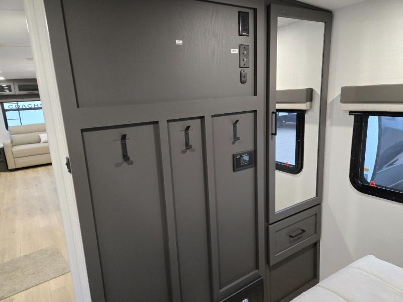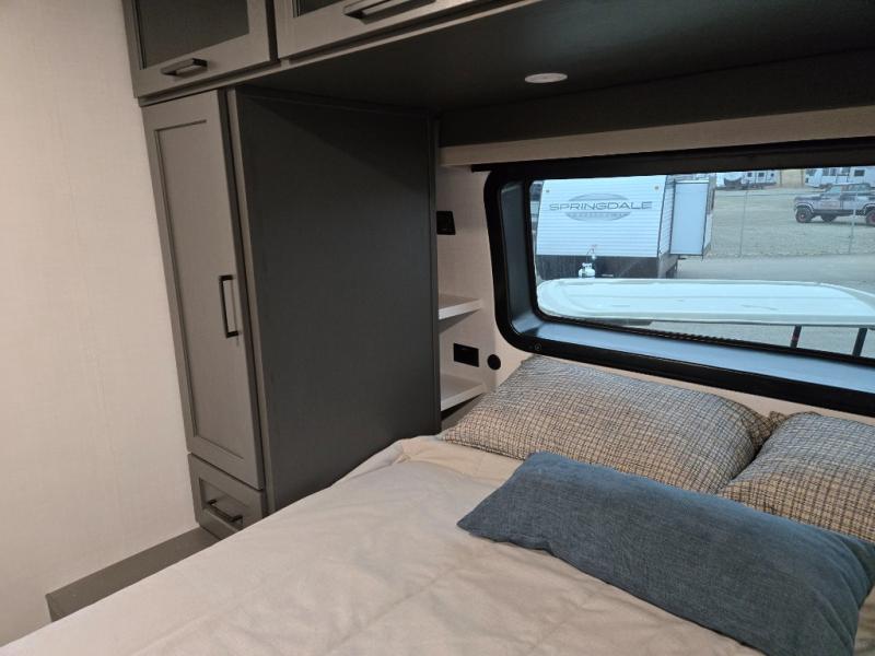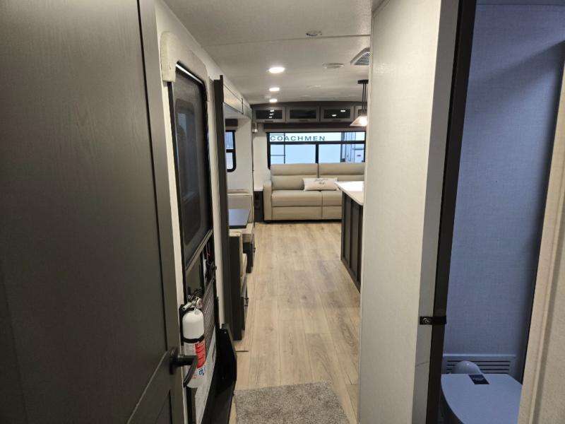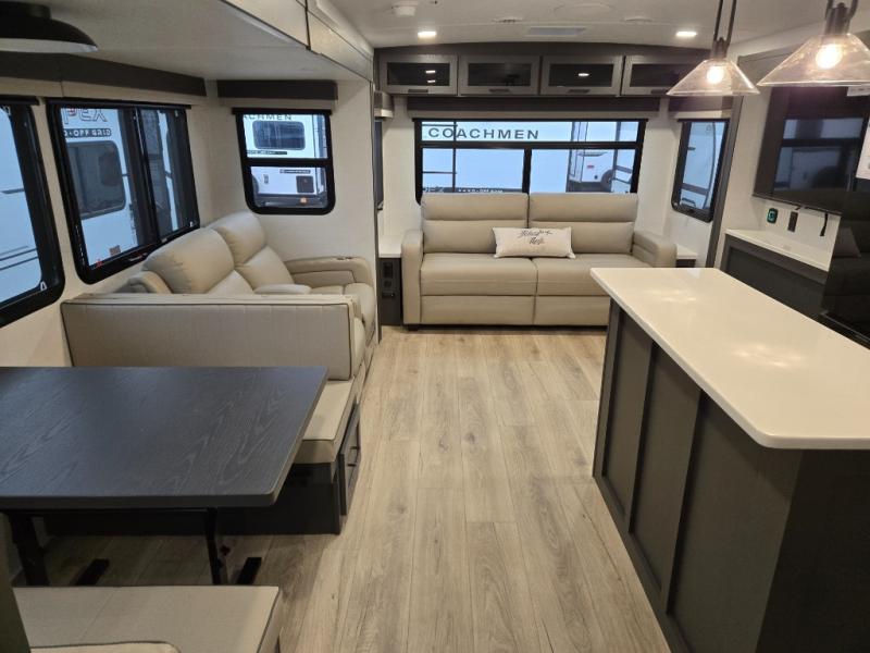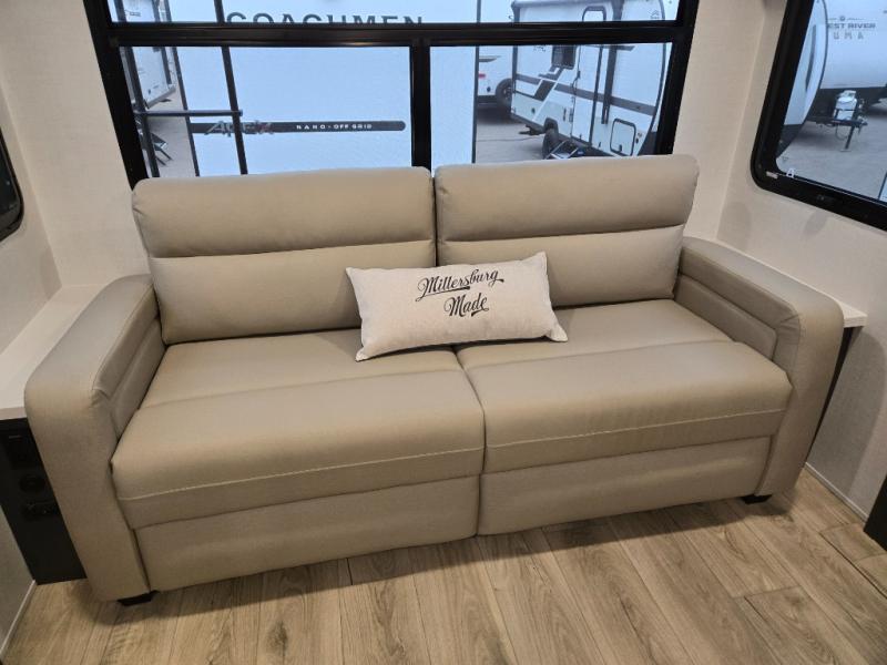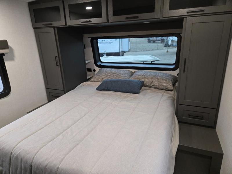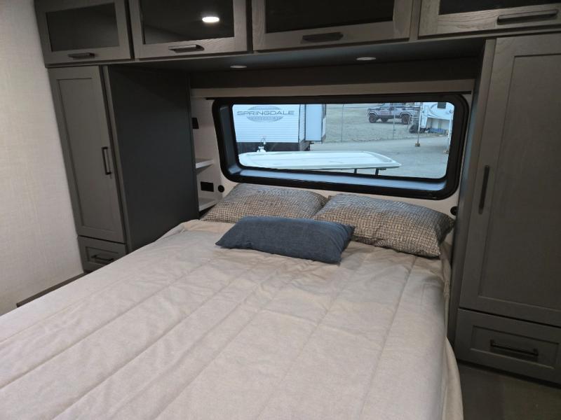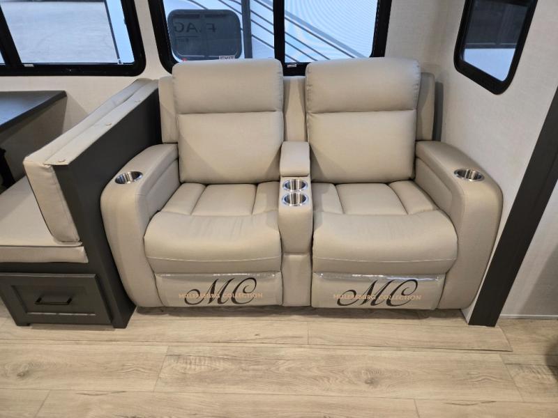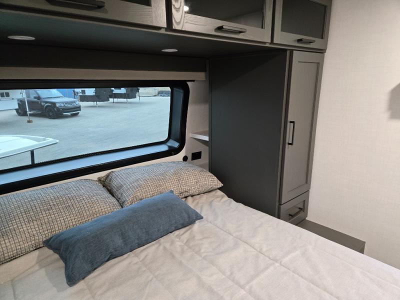 You'll feel right at home when staying in this spacious travel trailer. There are dual opposing slides in the combined kitchen and living area, and the large kitchen island will give the chef of your group more counter space to prep meals. Your crew can dine at the booth dinette, relax on the theater seat, and sleep on the hide-a-bed sofa. You'll find your own space in the front private bedroom that includes a queen bed, triple wardrobes, and a TV option. Head outdoors to find two power awnings, a rear 2" receiver hitch, and a pass-thru storage with an optional steel sliding tray.