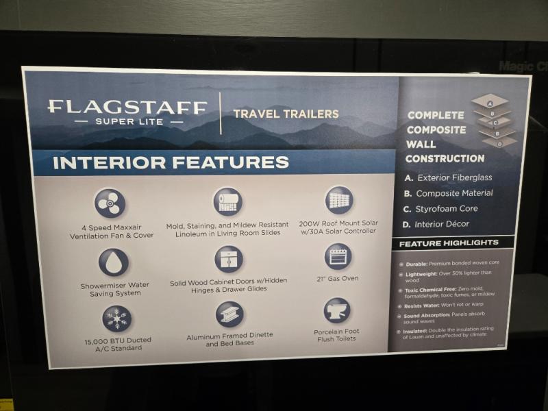 With any Flagstaff Super Lite travel trailer by Forest River, you can enjoy quality features with lightweight towing! The Climate Protection Package includes radiant foil in the front cap, underbelly, and slides, plus there are 12V thermostat-controlled heated tanks for added protection. The complete composite wall construction and 6-sided full-aluminum frame is ultra durable, and the RoadTech tire pressure monitoring adds safety. Each model also includes the Coast to Coast Package that comes with slam latch baggage doors, a high gloss fiberglass cap, Goodyear Endurance tires, plus a 200W solar panel with an optional additional 200W panel for more off grid capabilities. Inside, you'll love the roller shades, solid surface kitchen countertops, a shower miser system, and many more comforts!