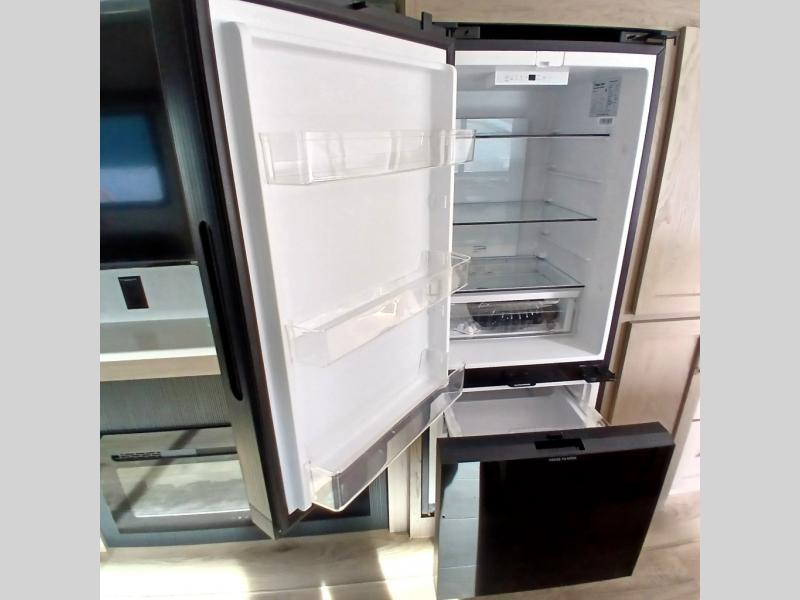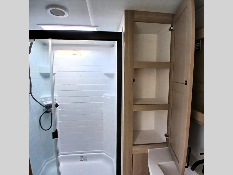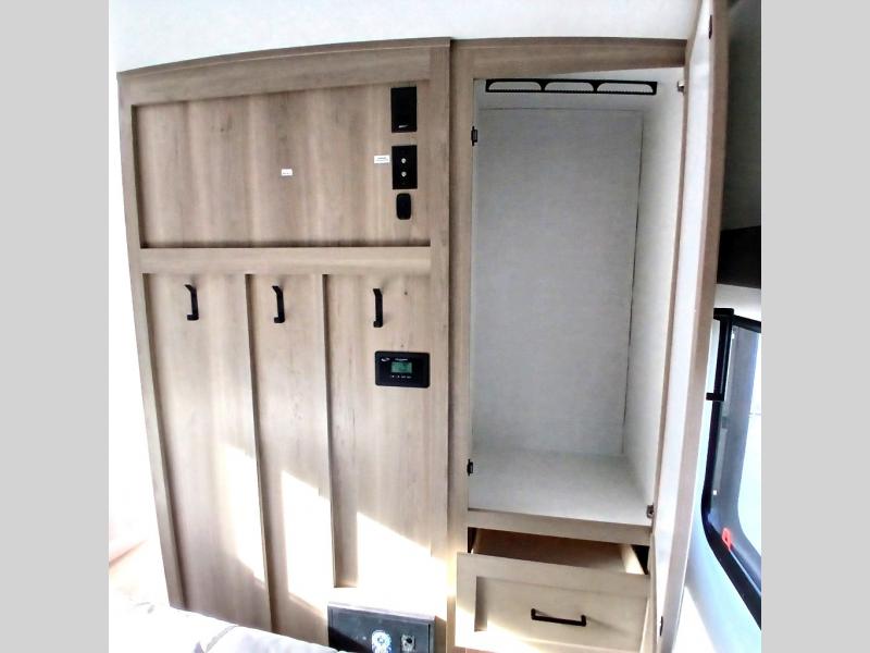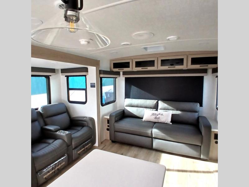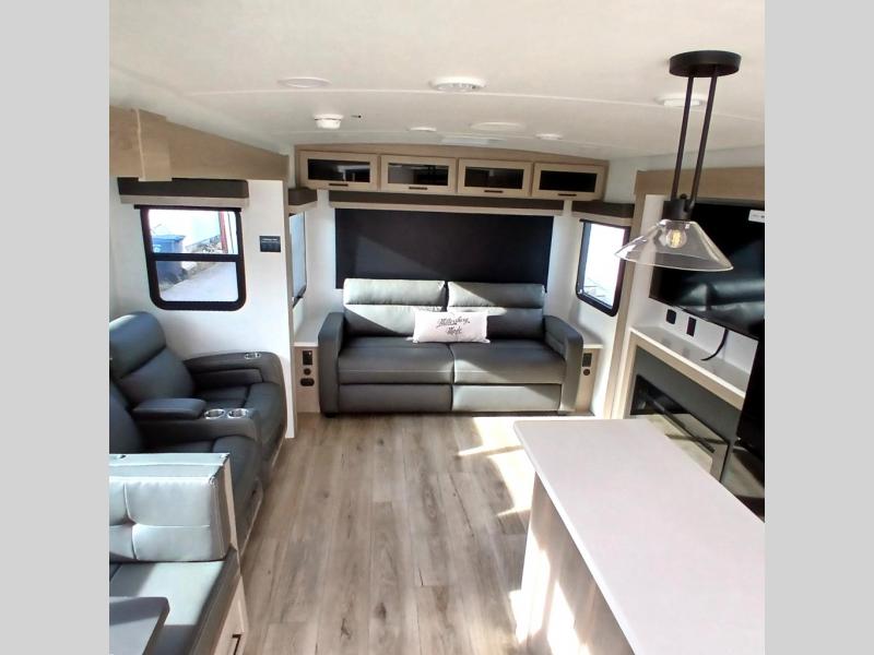You'll feel right at home when staying in this spacious travel trailer. There are dual opposing slides in the combined kitchen and living area, and the large kitchen island will give the chef of your group more counter space to prep meals. Your crew can dine at the booth dinette, relax on the theater seat, and sleep on the hide-a-bed sofa. You'll find your own space in the front private bedroom that includes a queen bed, triple wardrobes, and a TV option. Head outdoors to find two power awnings, a rear 2" receiver hitch, and a pass-thru storage with an optional steel sliding tray.