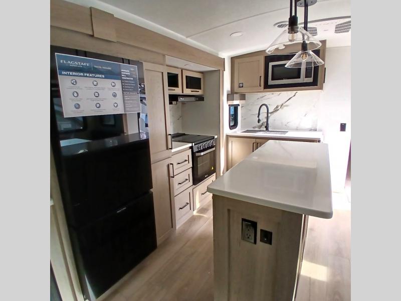 With any Flagstaff Super Lite travel trailer by Forest River, you can enjoy quality features with lightweight towing! The Climate Protection Package includes radiant foil in the front cap, underbelly, and slides, plus there are 12V thermostat-controlled heated tanks for added protection. The complete composite wall construction and 6-sided full-aluminum frame is ultra durable, and the RoadTech tire pressure monitoring adds safety. Each model also includes the Coast to Coast Package that comes with slam latch baggage doors, a high gloss fiberglass cap, Goodyear Endurance tires, plus a 200W solar panel with an optional additional 200W panel for more off grid capabilities. Inside, you'll love the roller shades, solid surface kitchen countertops, a shower miser system, and many more comforts!