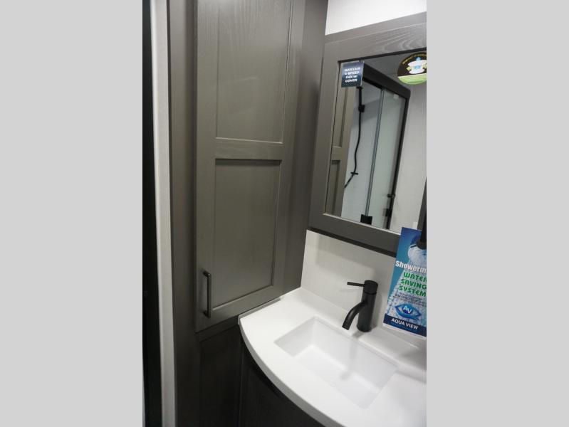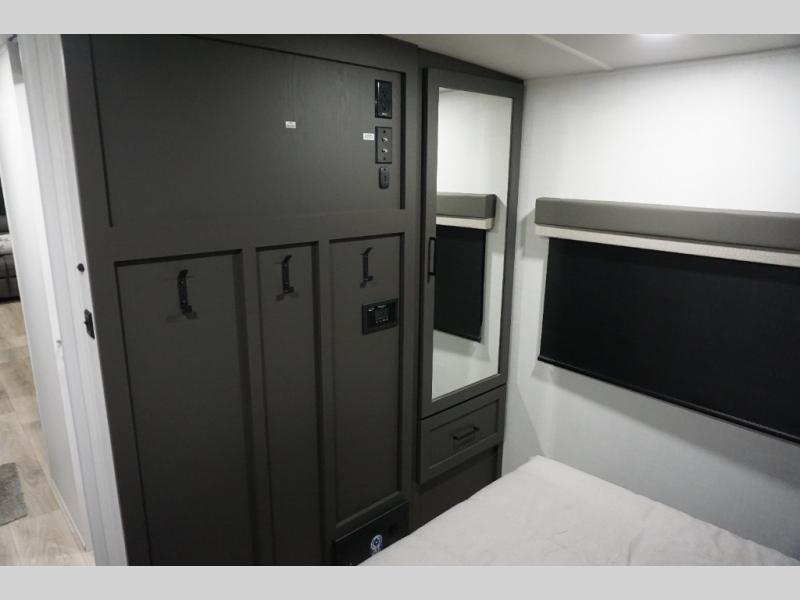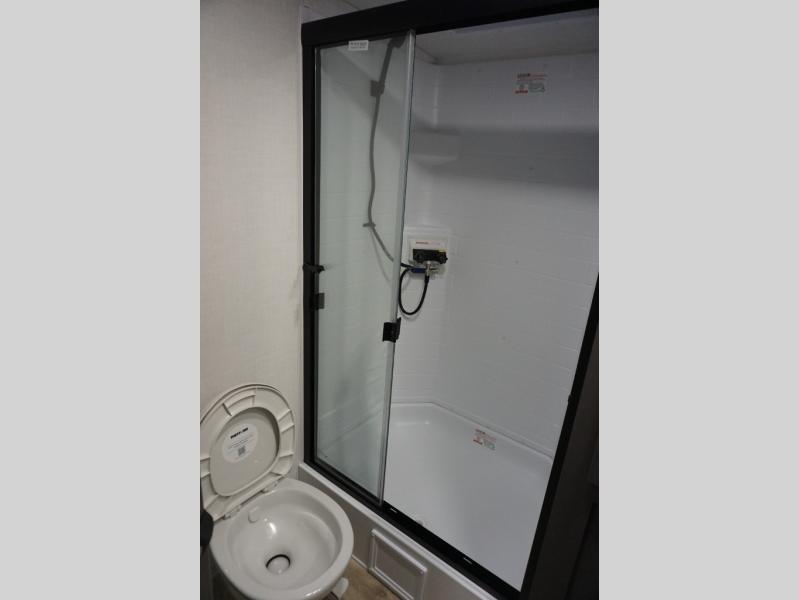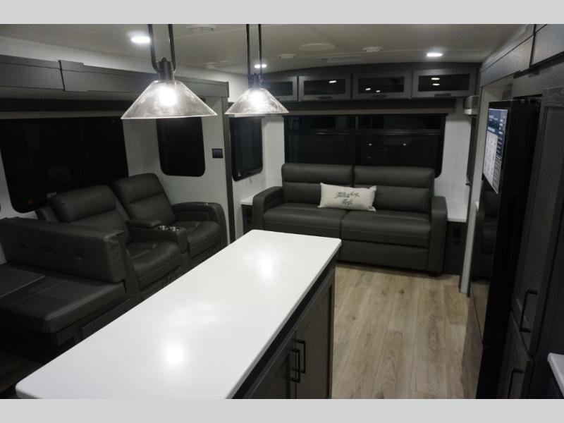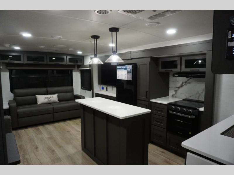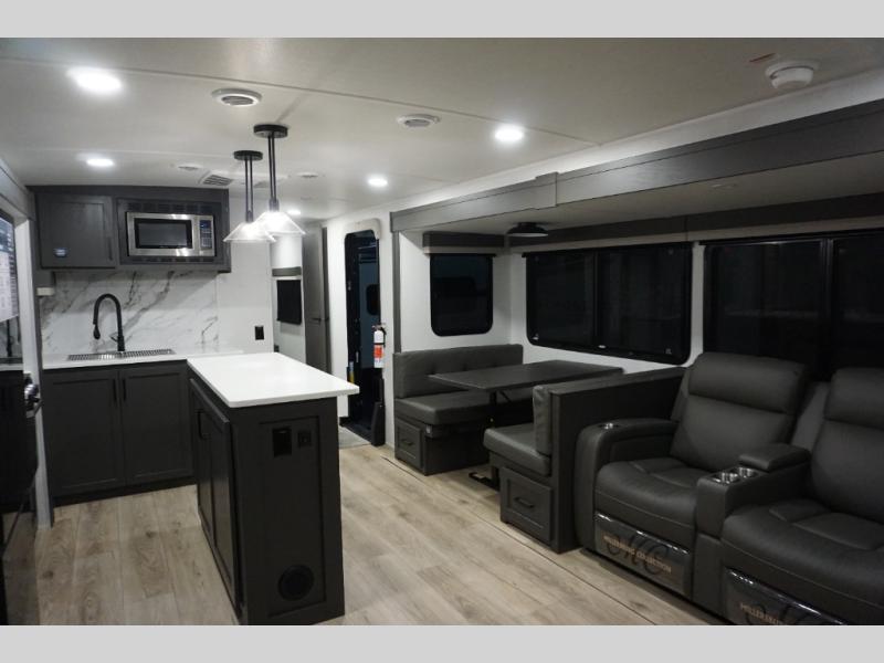 You'll feel right at home when staying in this spacious travel trailer. There are dual opposing slides in the combined kitchen and living area, and the large kitchen island will give the chef of your group more counter space to prep meals. Your crew can dine at the booth dinette, relax on the theater seat, and sleep on the hide-a-bed sofa. You'll find your own space in the front private bedroom that includes a queen bed, triple wardrobes, and a TV option. Head outdoors to find two power awnings, a rear 2" receiver hitch, and a pass-thru storage with an optional steel sliding tray.