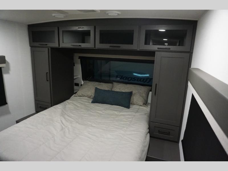 With any Flagstaff Super Lite travel trailer by Forest River, you can enjoy quality features with lightweight towing! The Climate Protection Package includes radiant foil in the front cap, underbelly, and slides, plus there are 12V thermostat-controlled heated tanks for added protection. The complete composite wall construction and 6-sided full-aluminum frame is ultra durable, and the RoadTech tire pressure monitoring adds safety. Each model also includes the Coast to Coast Package that comes with slam latch baggage doors, a high gloss fiberglass cap, Goodyear Endurance tires, plus a 200W solar panel with an optional additional 200W panel for more off grid capabilities. Inside, you'll love the roller shades, solid surface kitchen countertops, a shower miser system, and many more comforts!