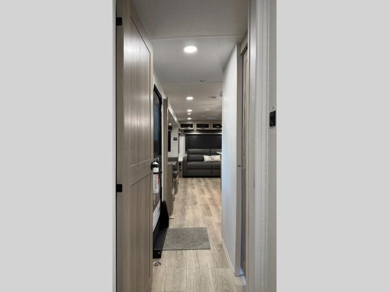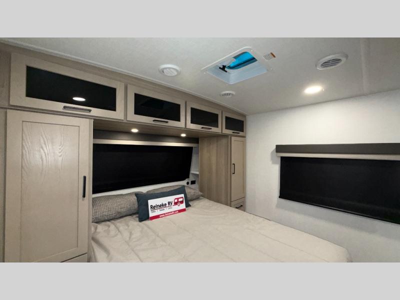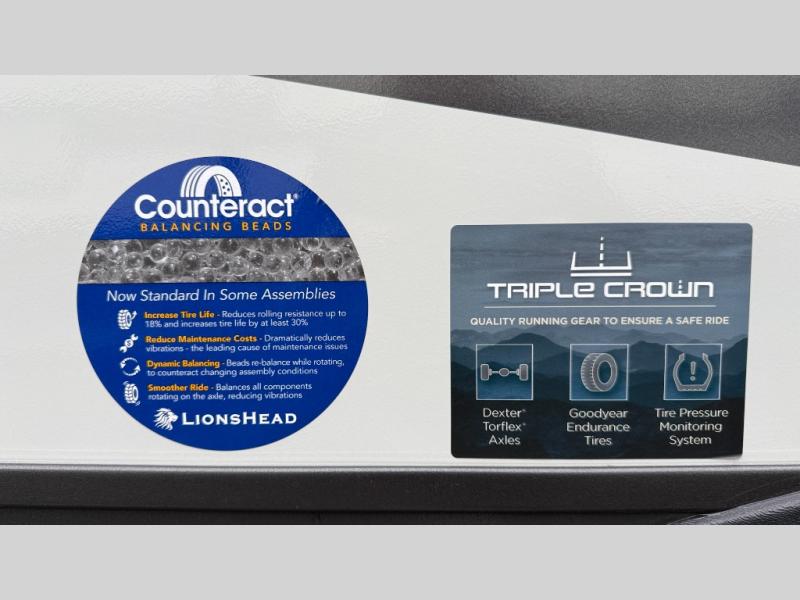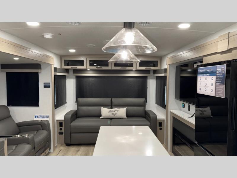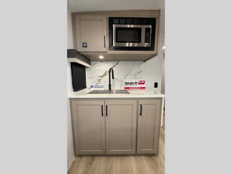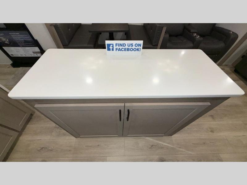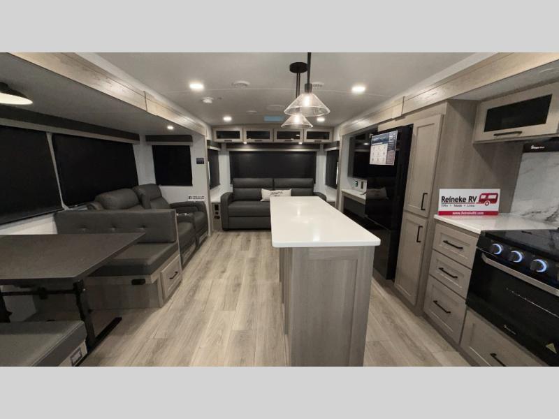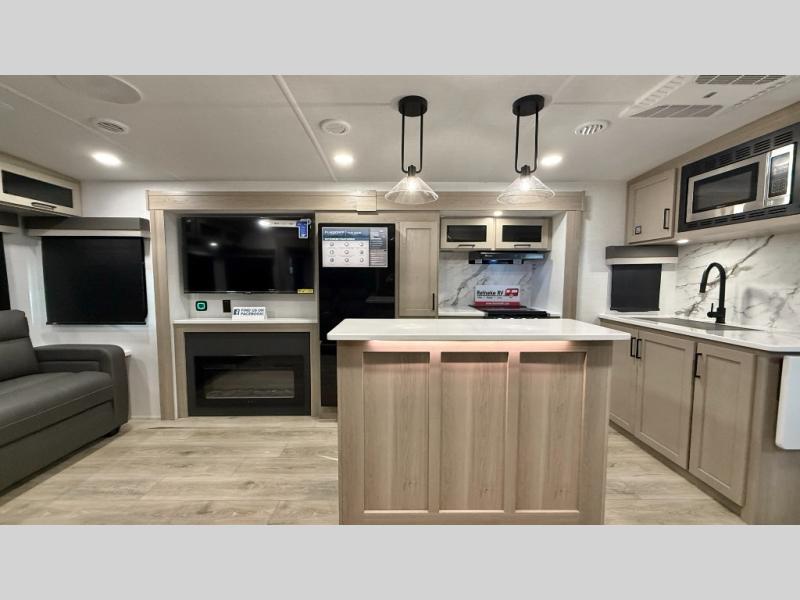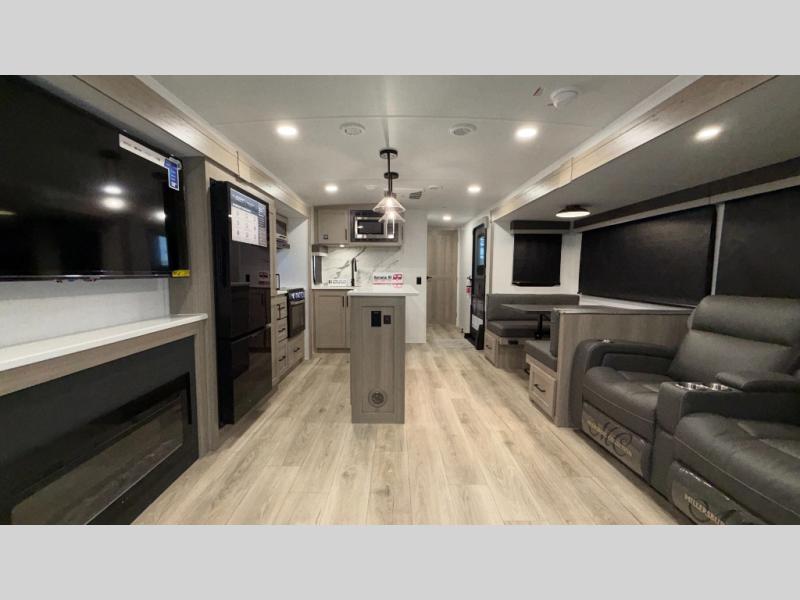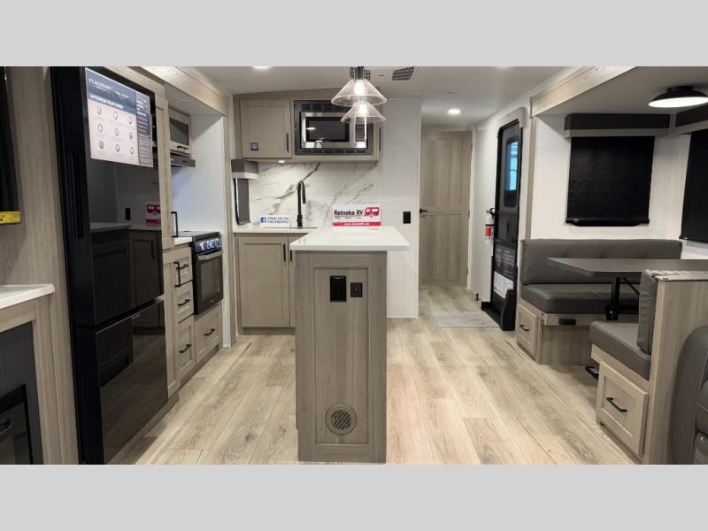 You'll feel right at home when staying in this spacious travel trailer. There are dual opposing slides in the combined kitchen and living area, and the large kitchen island will give the chef of your group more counter space to prep meals. Your crew can dine at the booth dinette, relax on the theater seat, and sleep on the hide-a-bed sofa. You'll find your own space in the front private bedroom that includes a queen bed, triple wardrobes, and a TV option. Head outdoors to find two power awnings, a rear 2" receiver hitch, and a pass-thru storage with an optional steel sliding tray.
