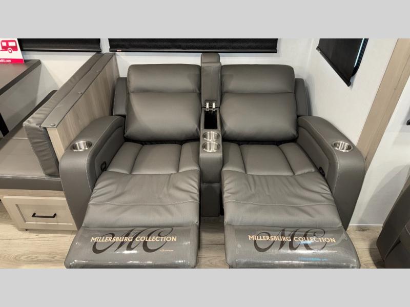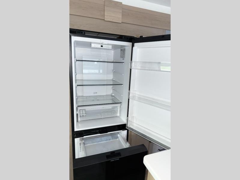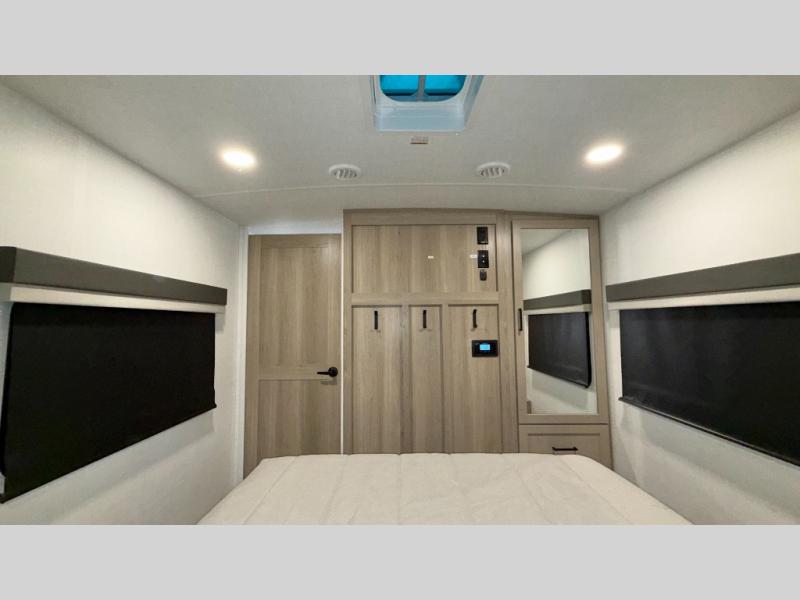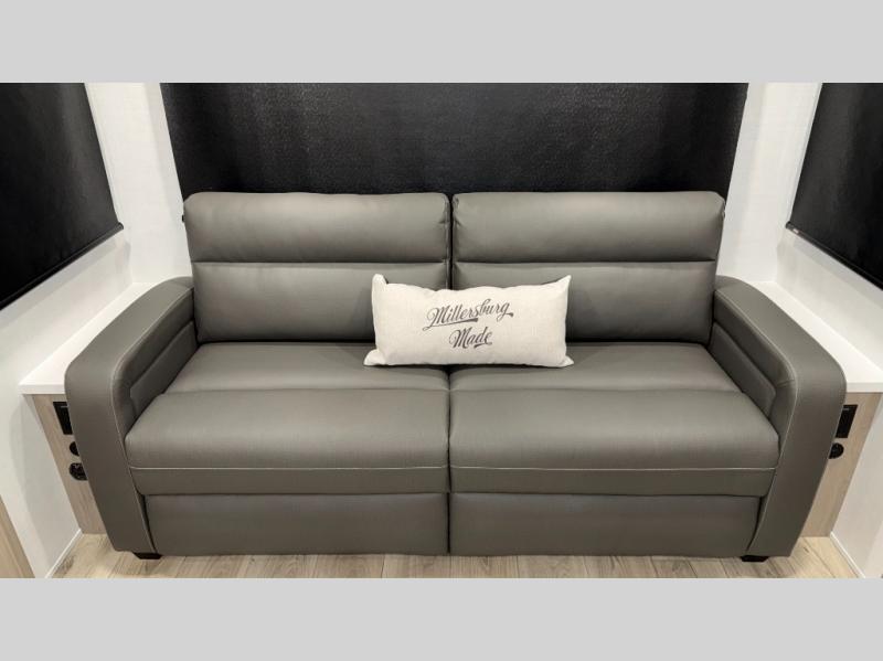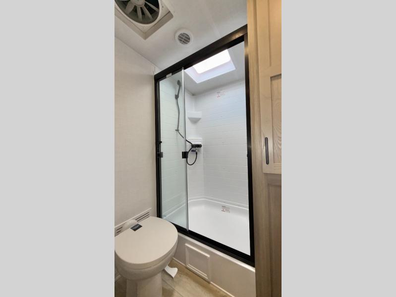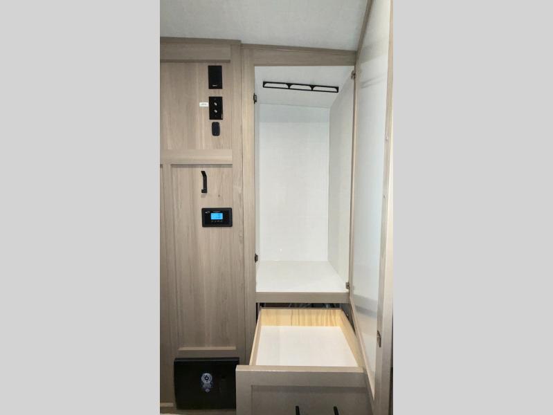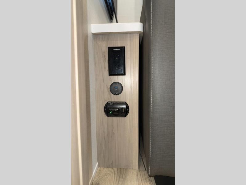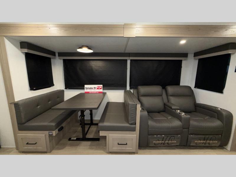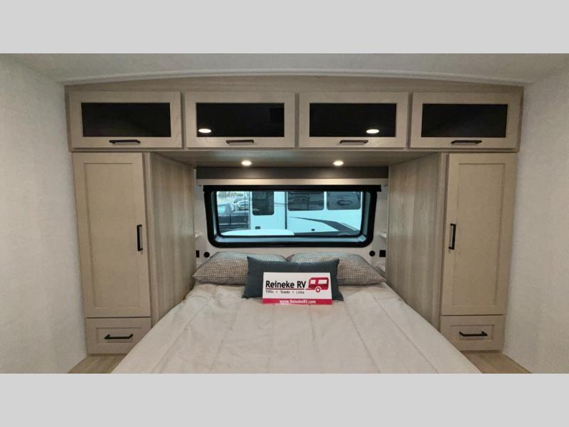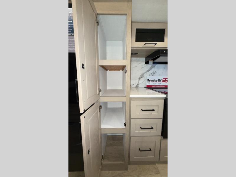 You'll feel right at home when staying in this spacious travel trailer. There are dual opposing slides in the combined kitchen and living area, and the large kitchen island will give the chef of your group more counter space to prep meals. Your crew can dine at the booth dinette, relax on the theater seat, and sleep on the hide-a-bed sofa. You'll find your own space in the front private bedroom that includes a queen bed, triple wardrobes, and a TV option. Head outdoors to find two power awnings, a rear 2" receiver hitch, and a pass-thru storage with an optional steel sliding tray.