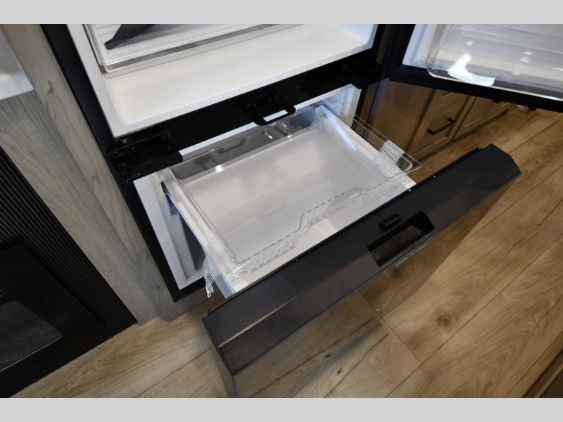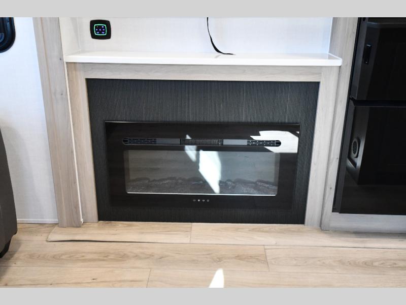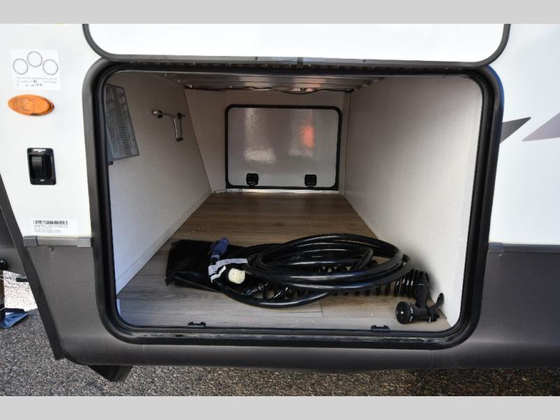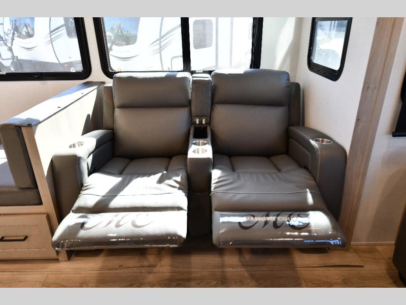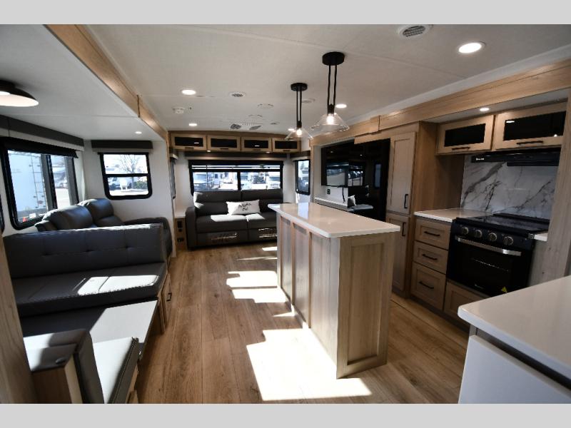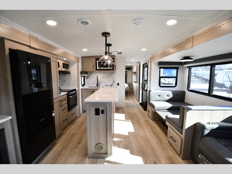 You'll feel right at home when staying in this spacious travel trailer. There are dual opposing slides in the combined kitchen and living area, and the large kitchen island will give the chef of your group more counter space to prep meals. Your crew can dine at the booth dinette, relax on the theater seat, and sleep on the hide-a-bed sofa. You'll find your own space in the front private bedroom that includes a queen bed, triple wardrobes, and a TV option. Head outdoors to find two power awnings, a rear 2" receiver hitch, and a pass-thru storage with an optional steel sliding tray.