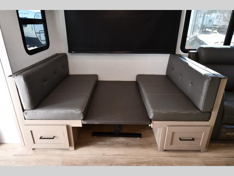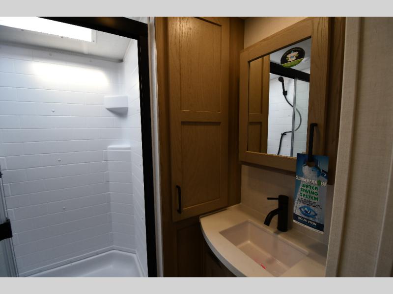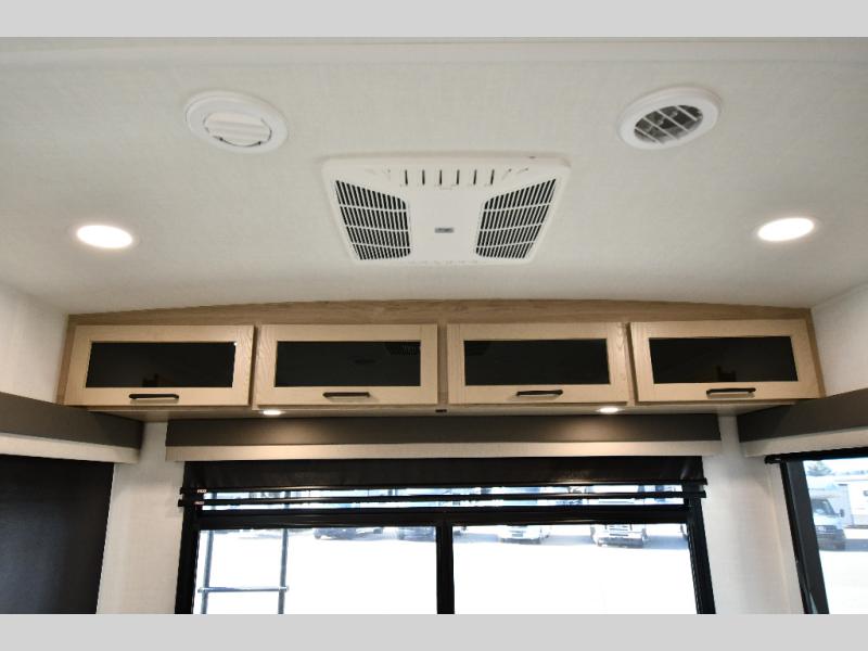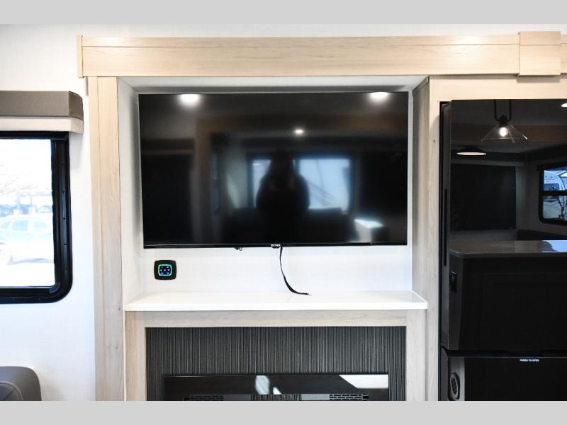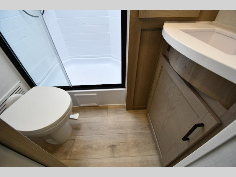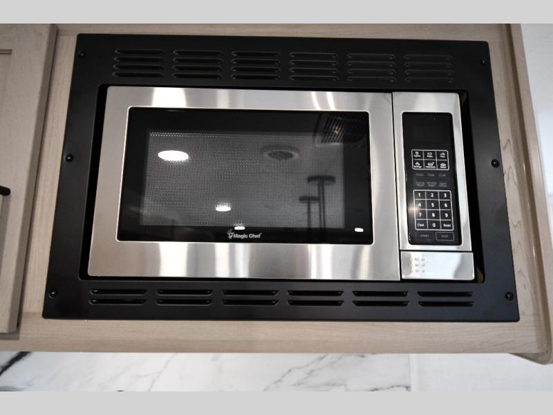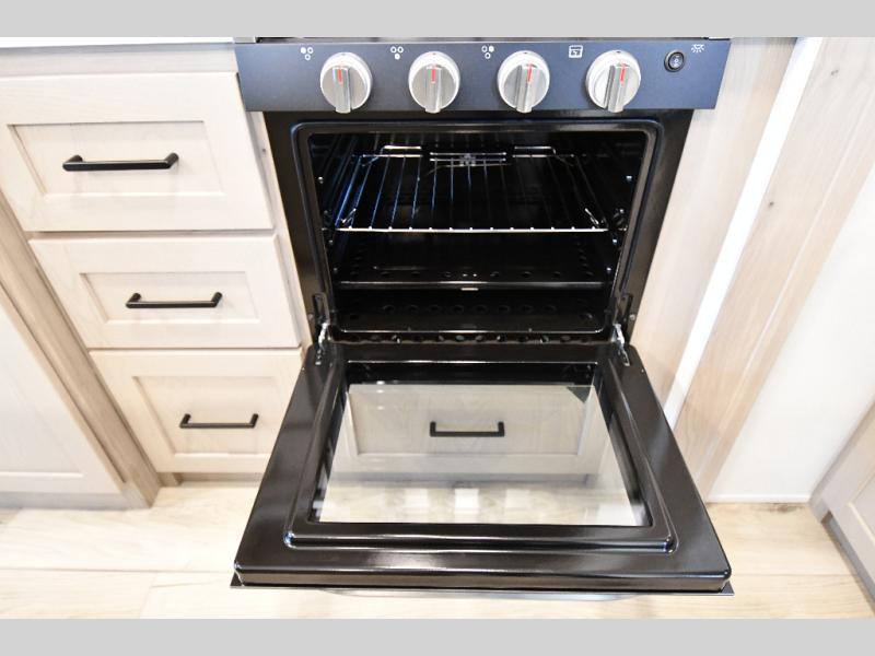 You'll feel right at home when staying in this spacious travel trailer. There are dual opposing slides in the combined kitchen and living area, and the large kitchen island will give the chef of your group more counter space to prep meals. Your crew can dine at the booth dinette, relax on the theater seat, and sleep on the hide-a-bed sofa. You'll find your own space in the front private bedroom that includes a queen bed, triple wardrobes, and a TV option. Head outdoors to find two power awnings, a rear 2" receiver hitch, and a pass-thru storage with an optional steel sliding tray.