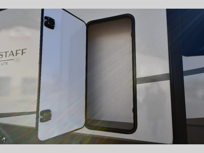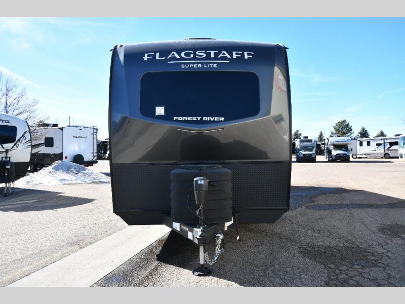With any Flagstaff Super Lite travel trailer by Forest River, you can enjoy quality features with lightweight towing! The Climate Protection Package includes radiant foil in the front cap, underbelly, and slides, plus there are 12V thermostat-controlled heated tanks for added protection. The complete composite wall construction and 6-sided full-aluminum frame is ultra durable, and the RoadTech tire pressure monitoring adds safety. Each model also includes the Coast to Coast Package that comes with slam latch baggage doors, a high gloss fiberglass cap, Goodyear Endurance tires, plus a 200W solar panel with an optional additional 200W panel for more off grid capabilities. Inside, you'll love the roller shades, solid surface kitchen countertops, a shower miser system, and many more comforts!