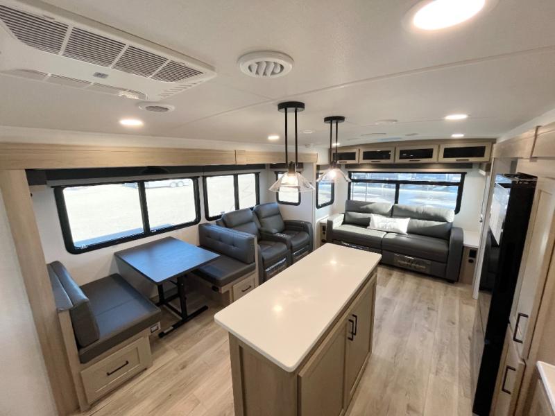 You'll feel right at home when staying in this spacious travel trailer. There are dual opposing slides in the combined kitchen and living area, and the large kitchen island will give the chef of your group more counter space to prep meals. Your crew can dine at the booth dinette, relax on the theater seat, and sleep on the hide-a-bed sofa. You'll find your own space in the front private bedroom that includes a queen bed, triple wardrobes, and a TV option. Head outdoors to find two power awnings, a rear 2" receiver hitch, and a pass-thru storage with an optional steel sliding tray.