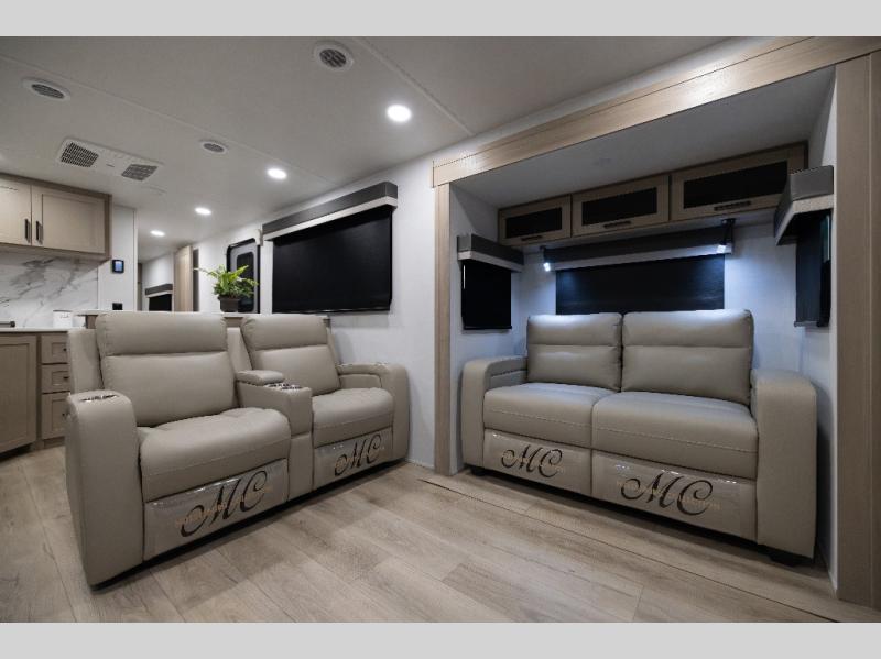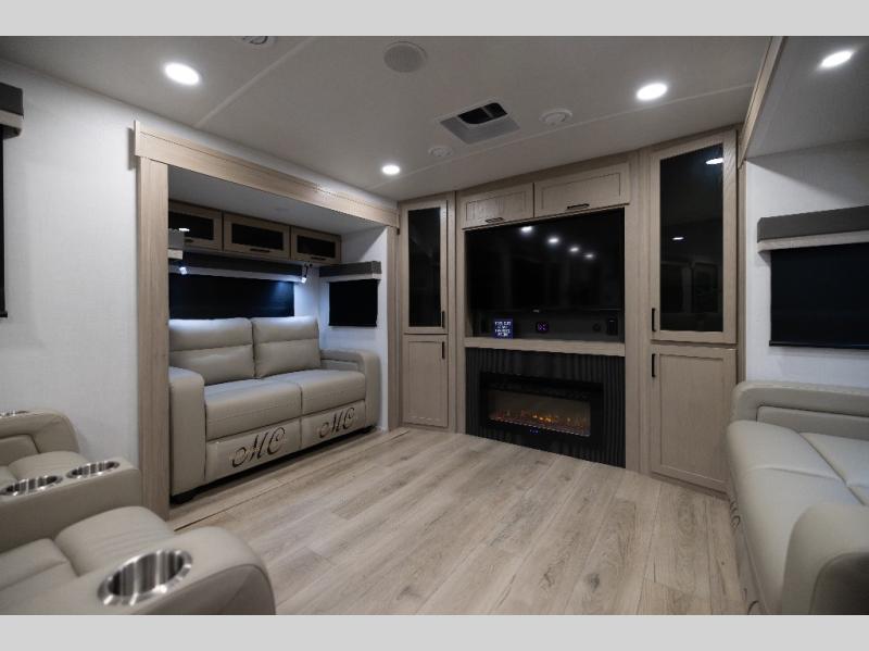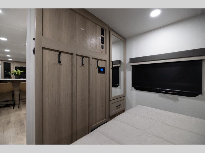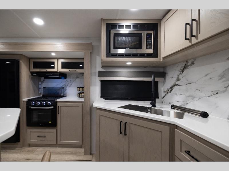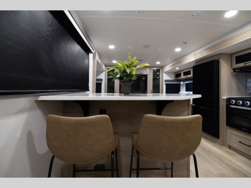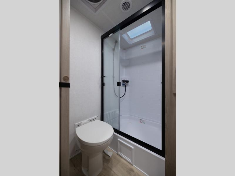 Weekends at the lake are made easy in this spacious travel trailer that can sleep six each night. Once you arrive at the campsite, unload your things from the pass-thru storage with an optional steel sliding tray, set up the 19' power awning, then head out on a trail to stretch your legs. You can freshen up in the full bath when you return before preparing lunch for everyone. A three burner cooktop comes standard, along with a gas oven and microwave oven, and there is a table with bar stools that overlooks the rear living area for those who want to relax. Your guests can convert the rear living area into their bedroom at night since there are dual hide-a-bed sofas, and the rear entertainment center includes a Smart TV so they can watch a movie in bed. And check out the private bedroom with a queen bed, triple wardrobes, and a TV option if you enjoy watching movies in bed.