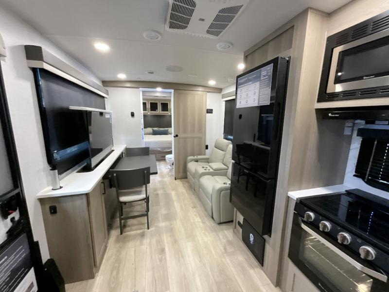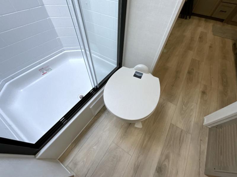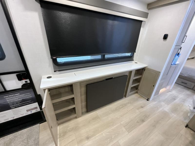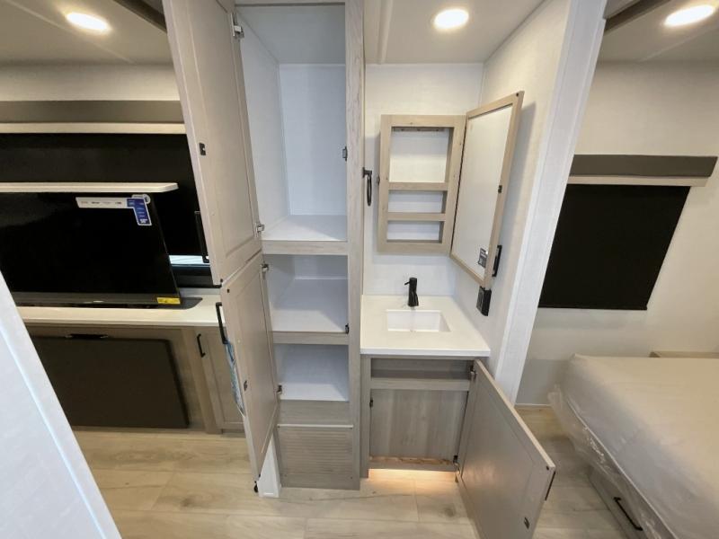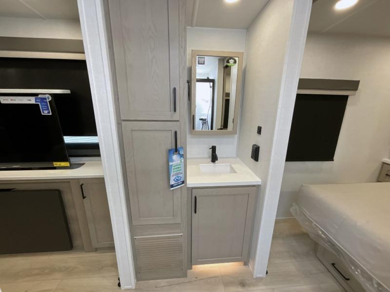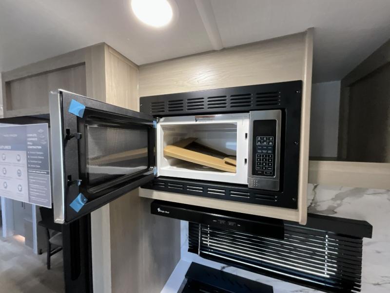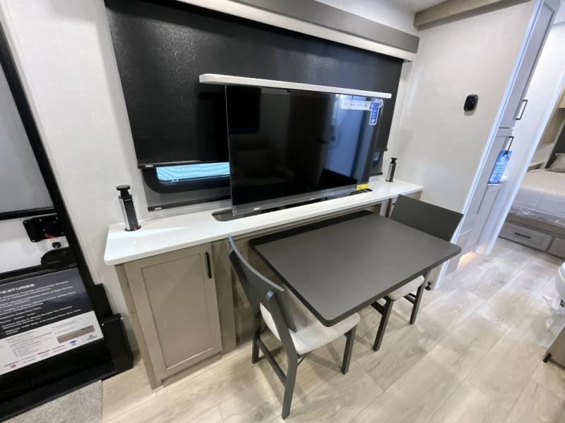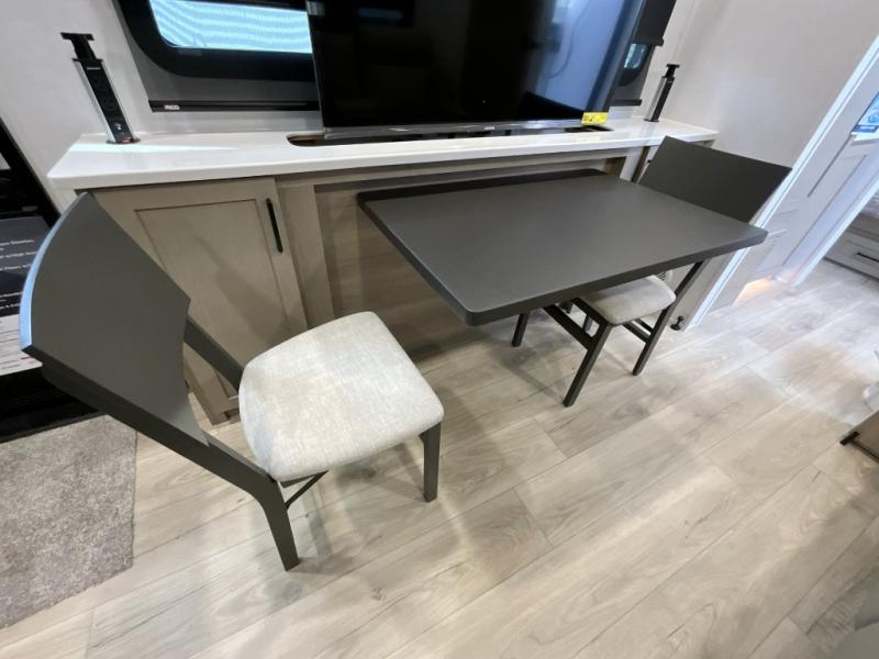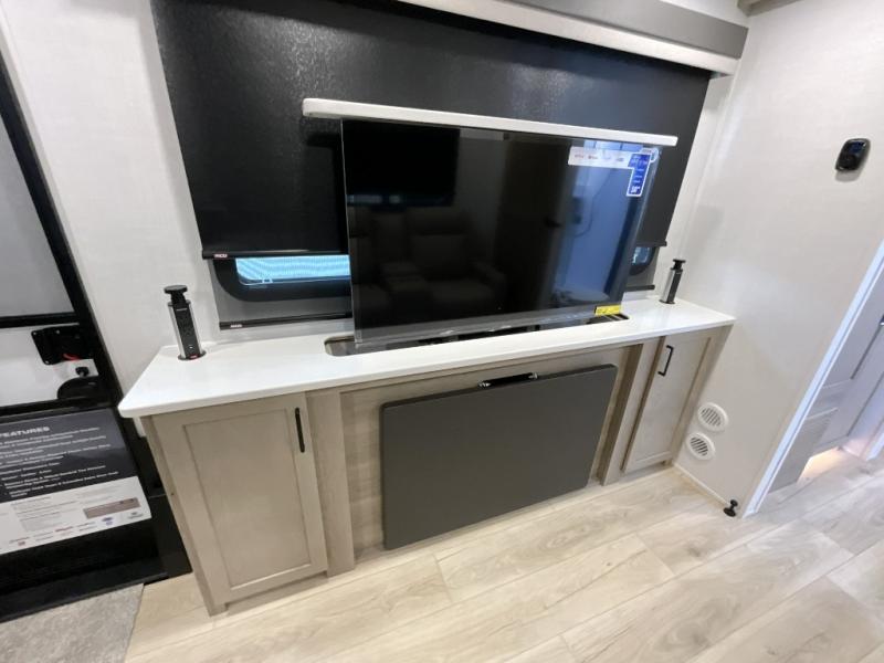 It won't be hard to find comfort in this lightweight travel trailer! The front kitchen includes ample counter space to prep melas, and you'll find a 12V refrigerator plus a pantry for food storage. A flip-up table with folding chairs gives you a place to dine together, and there is a theater seat across from the TV lift to enjoy movie nights. Head through the bath to find the rear master bedroom, complete with a king bed, dual wardrobes, and a TV option. In the morning, you can grab your hiking gear from the pass-thru storage and head for the trails!