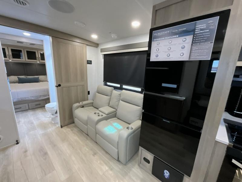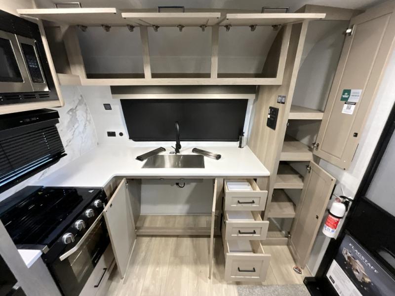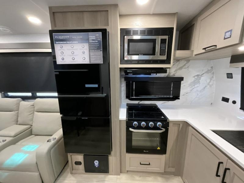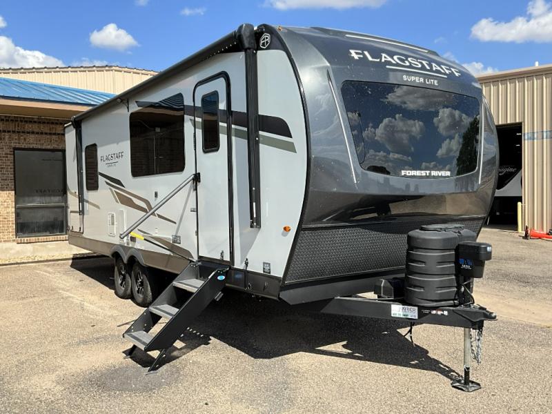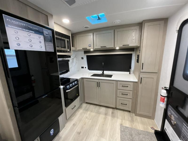 With any Flagstaff Super Lite travel trailer by Forest River, you can enjoy quality features with lightweight towing! The Climate Protection Package includes radiant foil in the front cap, underbelly, and slides, plus there are 12V thermostat-controlled heated tanks for added protection. The complete composite wall construction and 6-sided full-aluminum frame is ultra durable, and the RoadTech tire pressure monitoring adds safety. Each model also includes the Coast to Coast Package that comes with slam latch baggage doors, a high gloss fiberglass cap, Goodyear Endurance tires, plus a 200W solar panel with an optional additional 200W panel for more off grid capabilities. Inside, you'll love the roller shades, solid surface kitchen countertops, a shower miser system, and many more comforts!