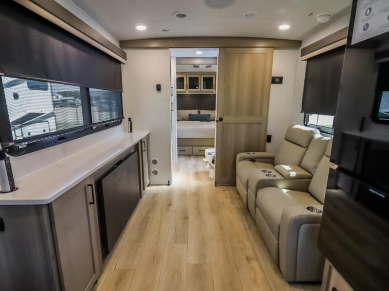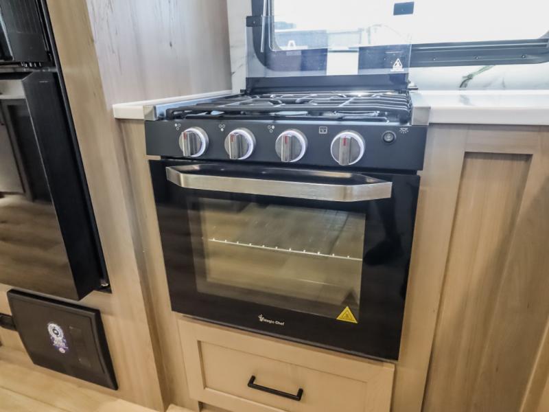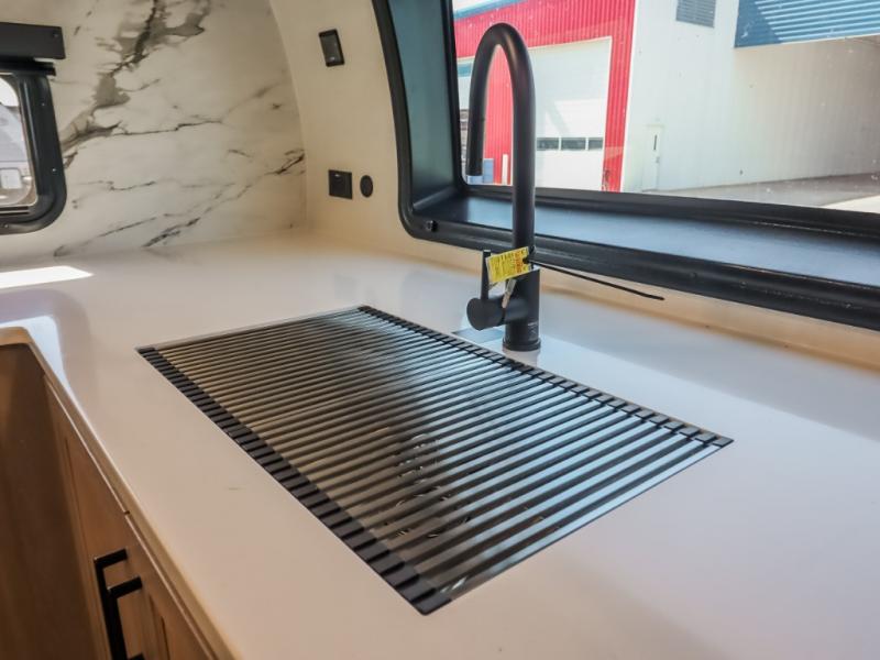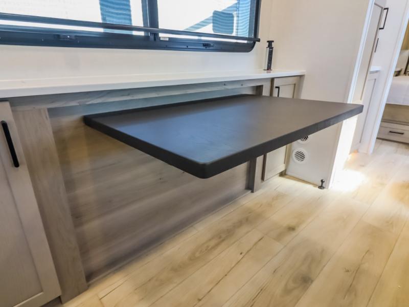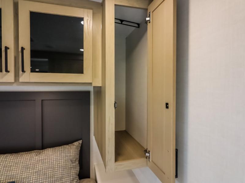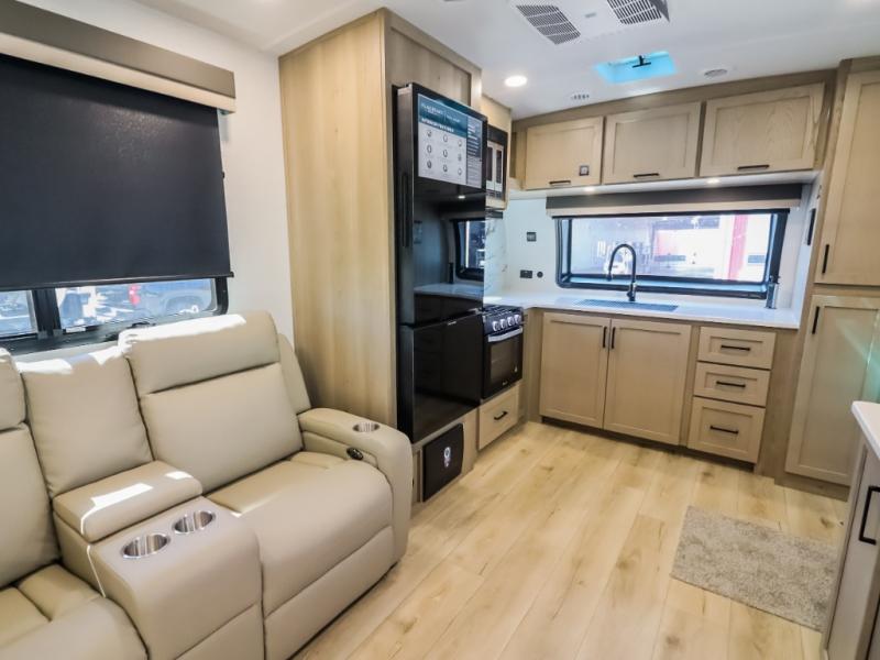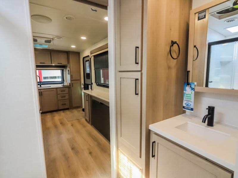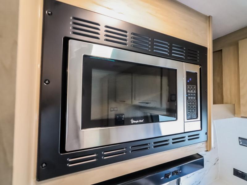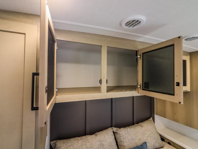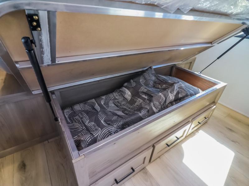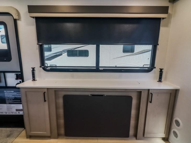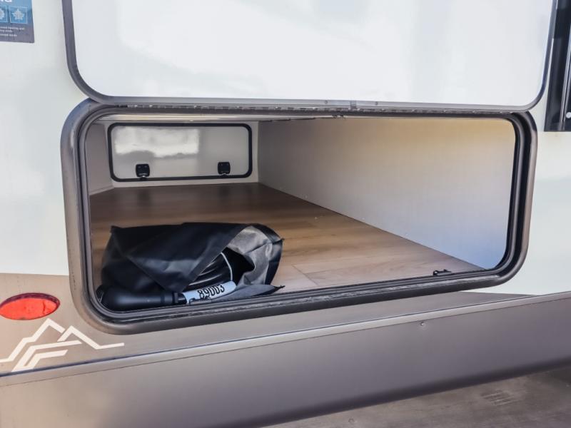 It won't be hard to find comfort in this lightweight travel trailer! The front kitchen includes ample counter space to prep melas, and you'll find a 12V refrigerator plus a pantry for food storage. A flip-up table with folding chairs gives you a place to dine together, and there is a theater seat across from the TV lift to enjoy movie nights. Head through the bath to find the rear master bedroom, complete with a king bed, dual wardrobes, and a TV option. In the morning, you can grab your hiking gear from the pass-thru storage and head for the trails!