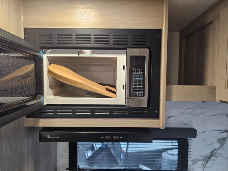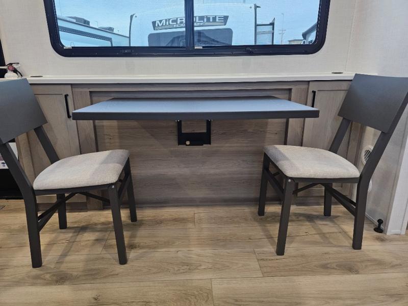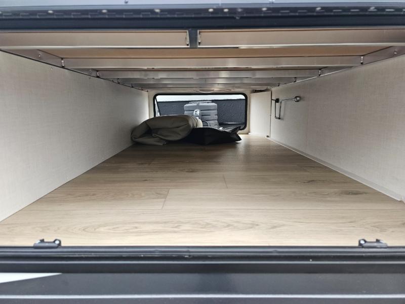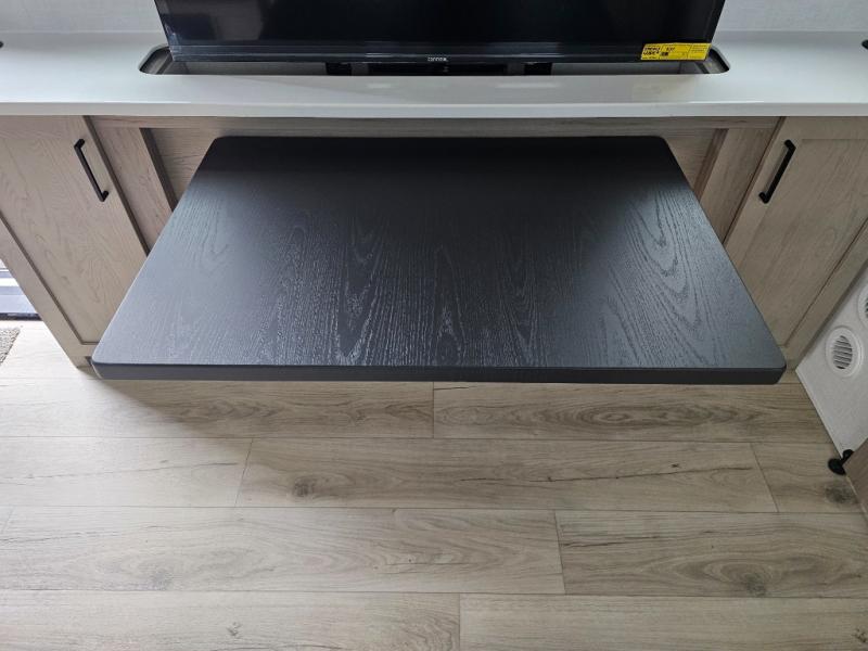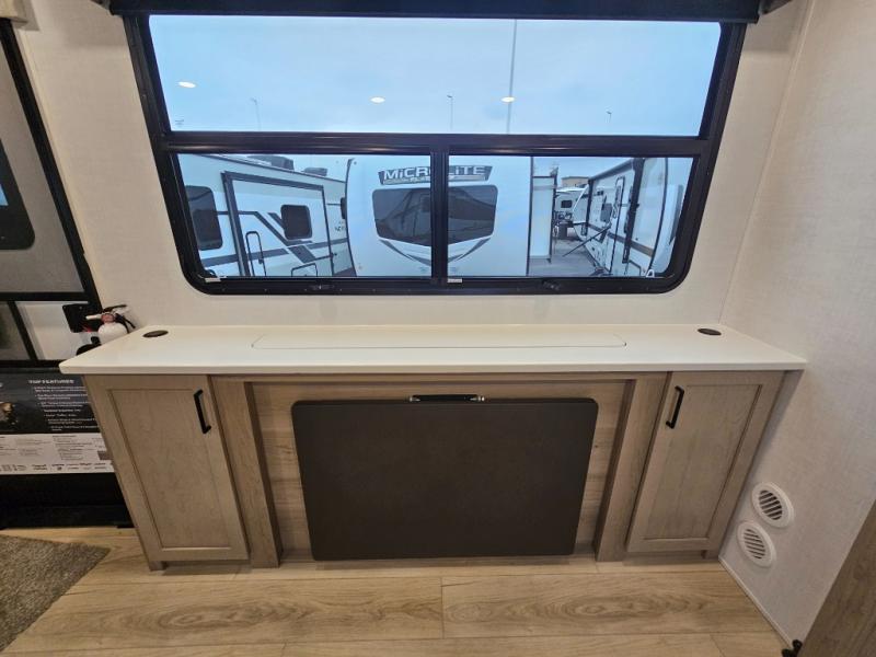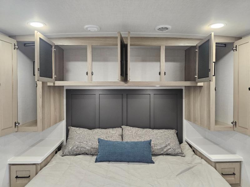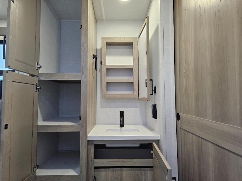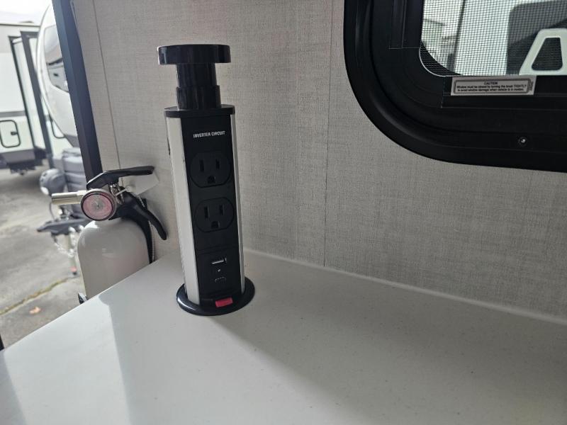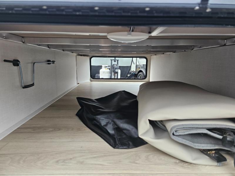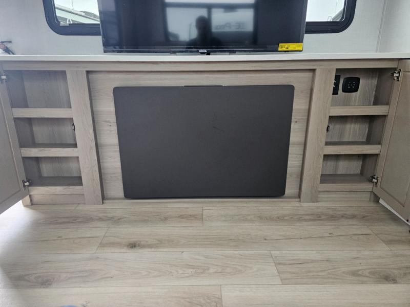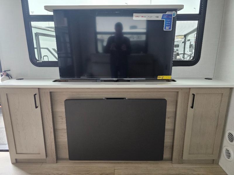It won't be hard to find comfort in this lightweight travel trailer! The front kitchen includes ample counter space to prep melas, and you'll find a 12V refrigerator plus a pantry for food storage. A flip-up table with folding chairs gives you a place to dine together, and there is a theater seat across from the TV lift to enjoy movie nights. Head through the bath to find the rear master bedroom, complete with a king bed, dual wardrobes, and a TV option. In the morning, you can grab your hiking gear from the pass-thru storage and head for the trails!