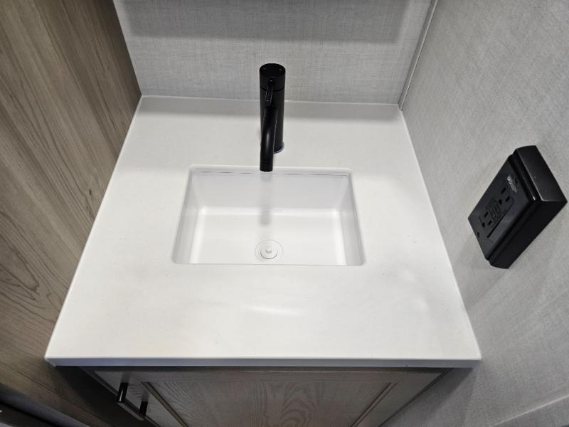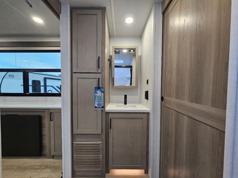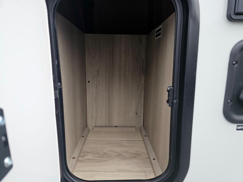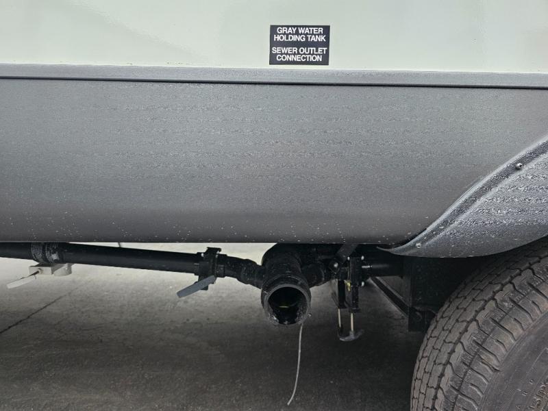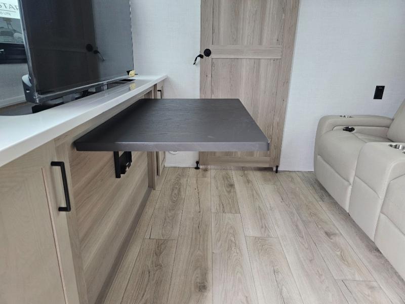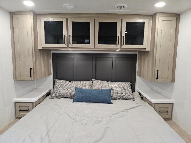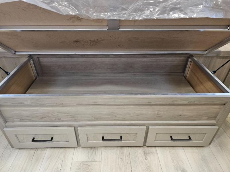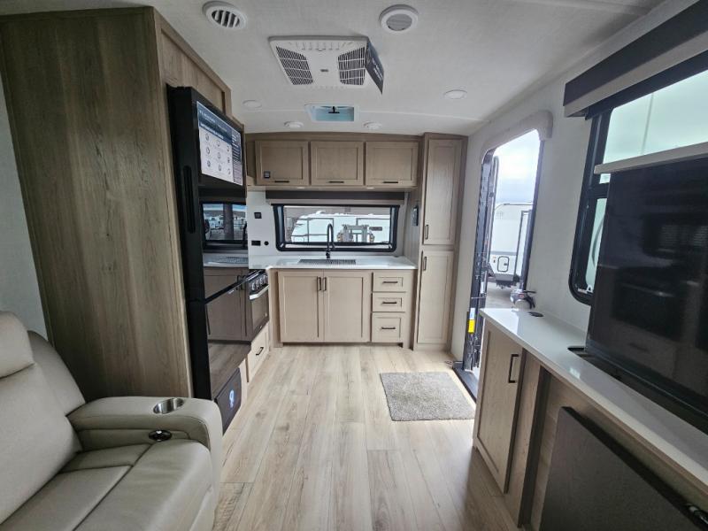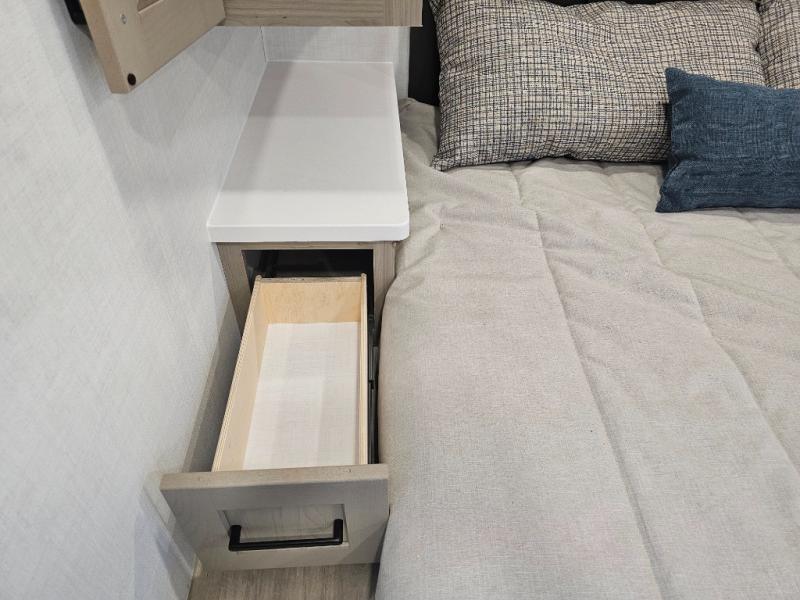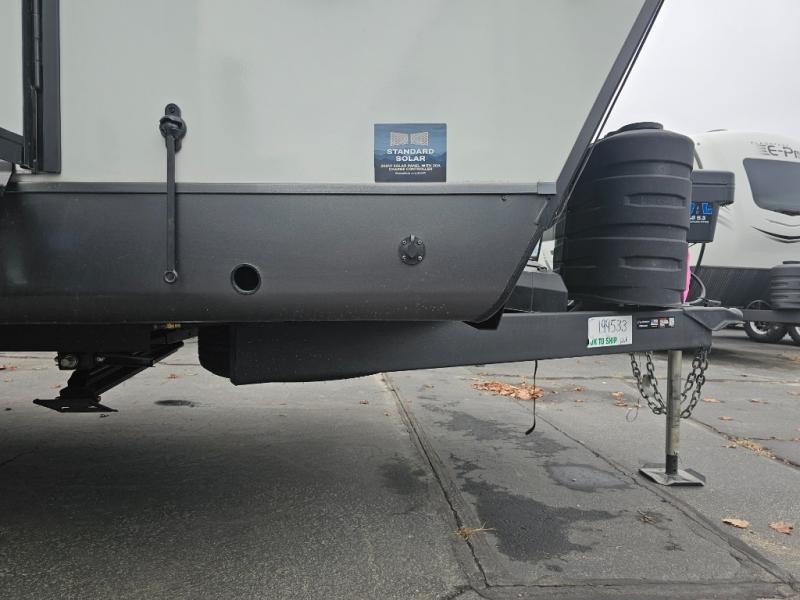 It won't be hard to find comfort in this lightweight travel trailer! The front kitchen includes ample counter space to prep melas, and you'll find a 12V refrigerator plus a pantry for food storage. A flip-up table with folding chairs gives you a place to dine together, and there is a theater seat across from the TV lift to enjoy movie nights. Head through the bath to find the rear master bedroom, complete with a king bed, dual wardrobes, and a TV option. In the morning, you can grab your hiking gear from the pass-thru storage and head for the trails!