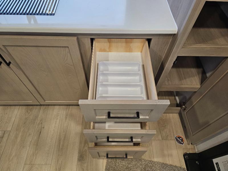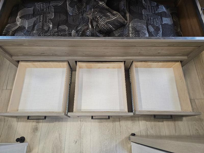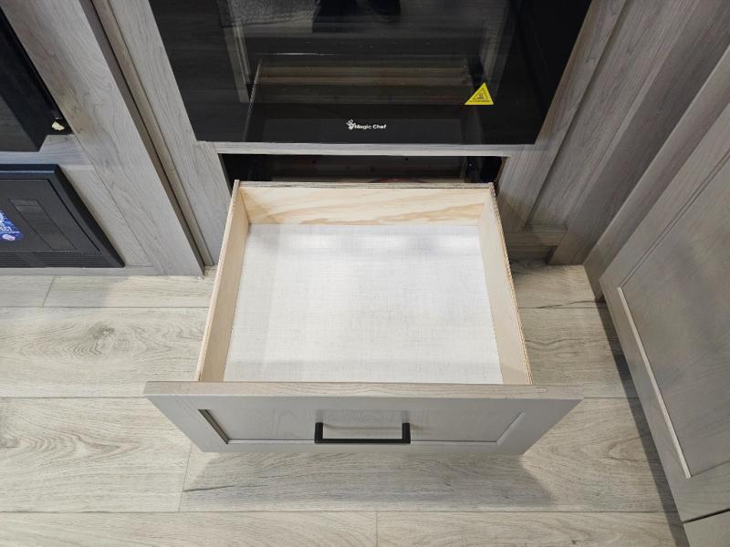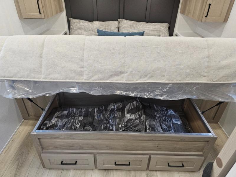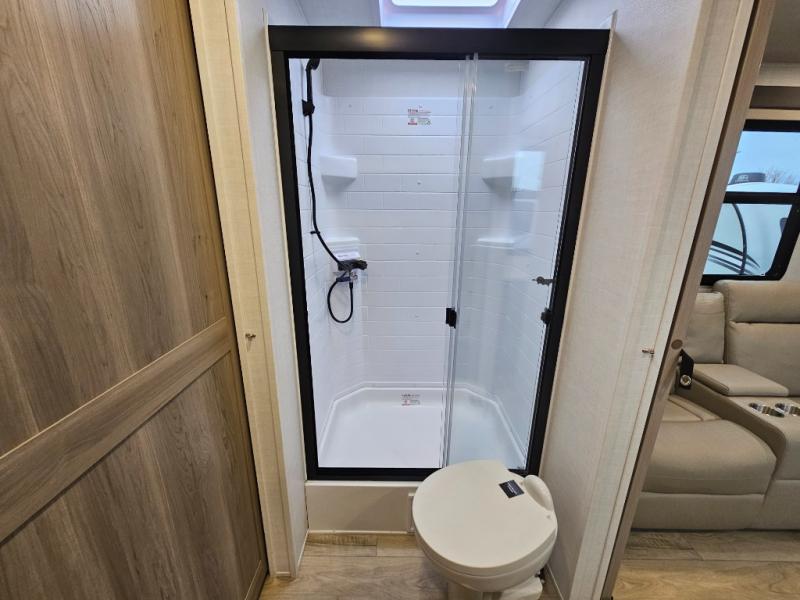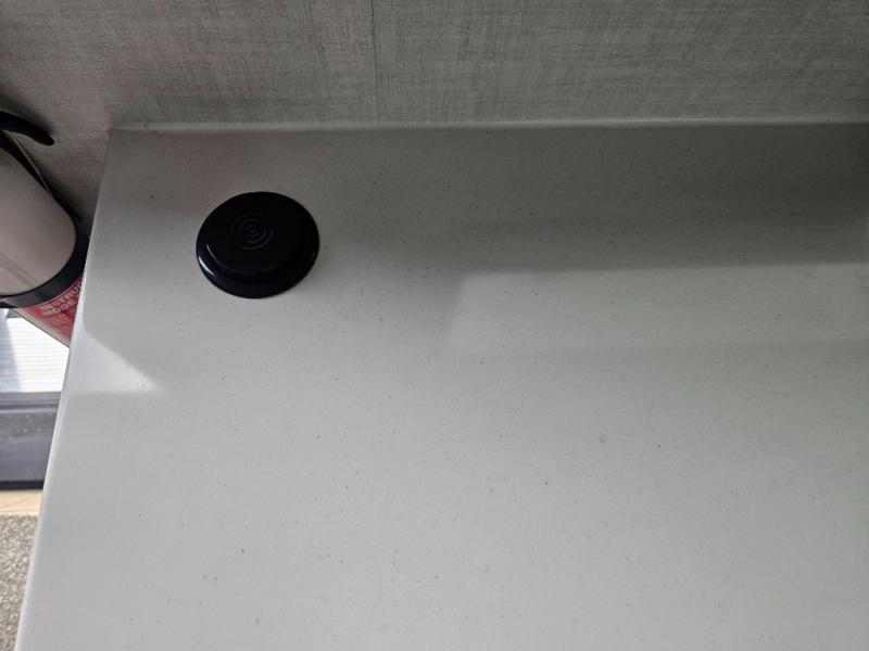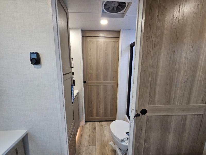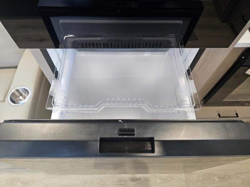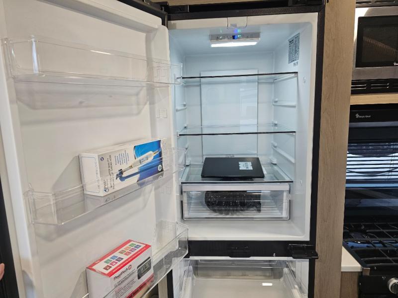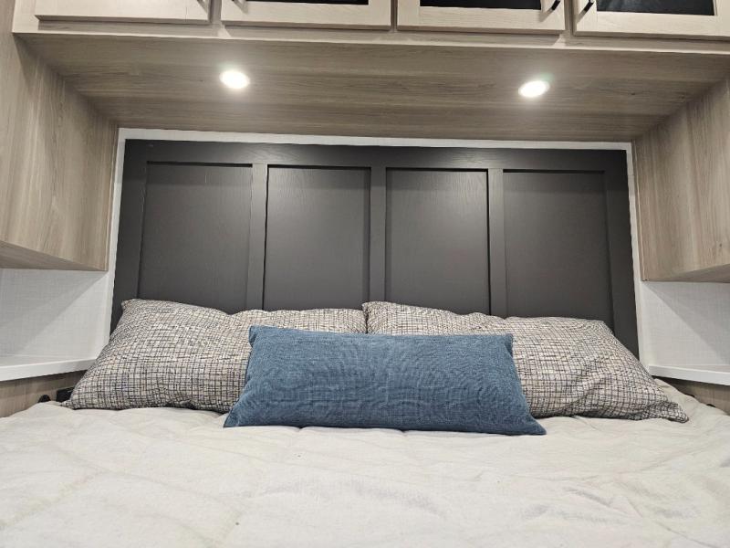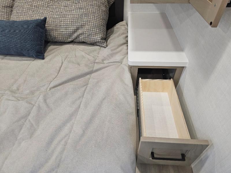 It won't be hard to find comfort in this lightweight travel trailer! The front kitchen includes ample counter space to prep melas, and you'll find a 12V refrigerator plus a pantry for food storage. A flip-up table with folding chairs gives you a place to dine together, and there is a theater seat across from the TV lift to enjoy movie nights. Head through the bath to find the rear master bedroom, complete with a king bed, dual wardrobes, and a TV option. In the morning, you can grab your hiking gear from the pass-thru storage and head for the trails!