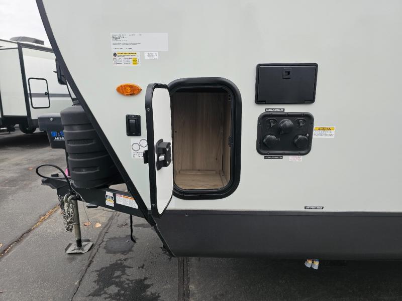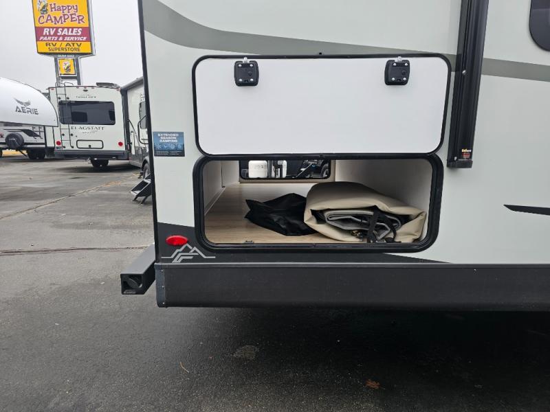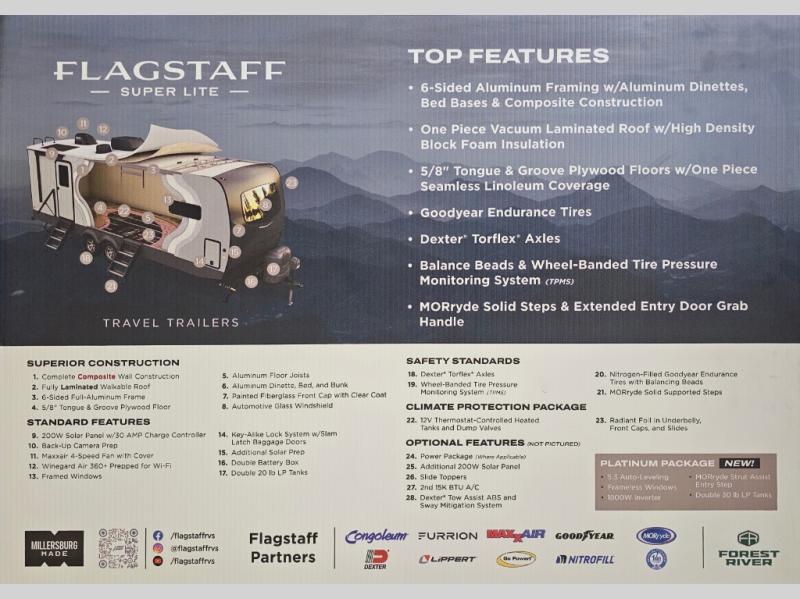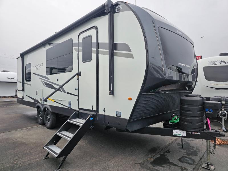 With any Flagstaff Super Lite travel trailer by Forest River, you can enjoy quality features with lightweight towing! The Climate Protection Package includes radiant foil in the front cap, underbelly, and slides, plus there are 12V thermostat-controlled heated tanks for added protection. The complete composite wall construction and 6-sided full-aluminum frame is ultra durable, and the RoadTech tire pressure monitoring adds safety. Each model also includes the Coast to Coast Package that comes with slam latch baggage doors, a high gloss fiberglass cap, Goodyear Endurance tires, plus a 200W solar panel with an optional additional 200W panel for more off grid capabilities. Inside, you'll love the roller shades, solid surface kitchen countertops, a shower miser system, and many more comforts!