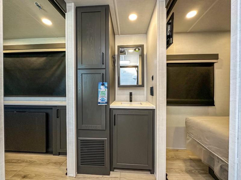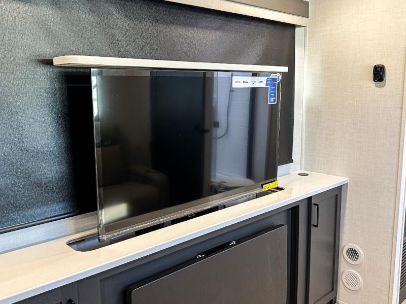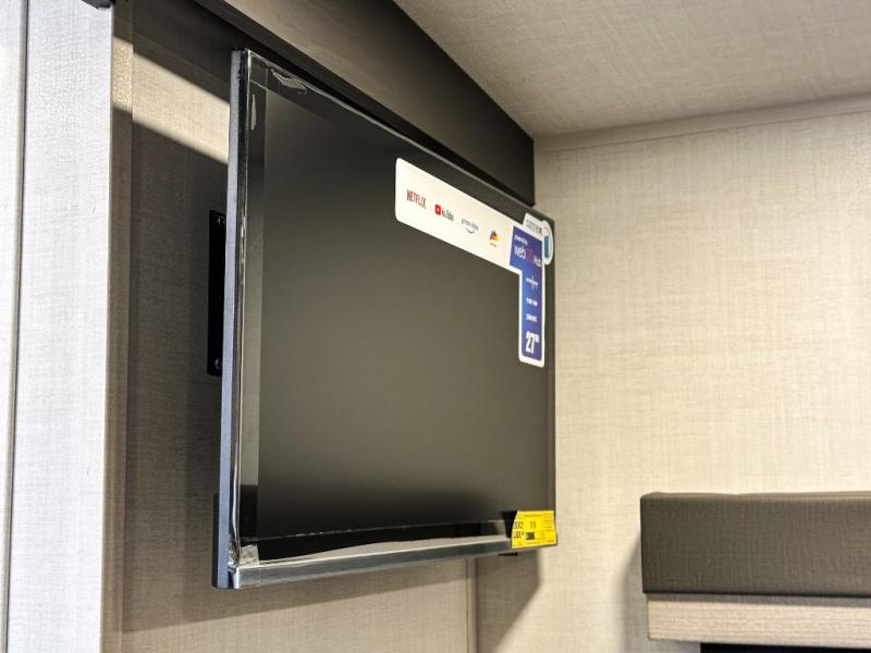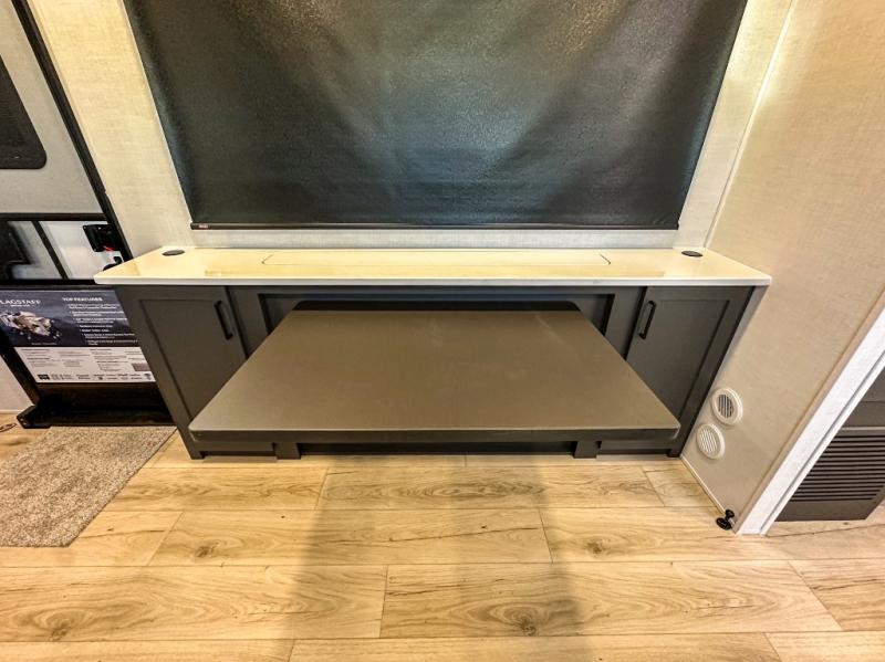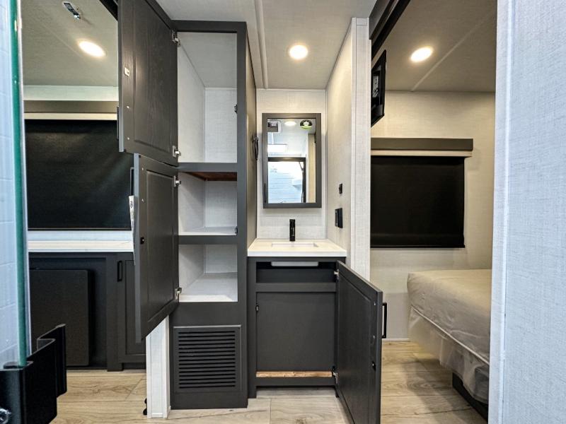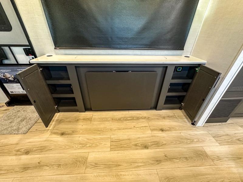 It won't be hard to find comfort in this lightweight travel trailer! The front kitchen includes ample counter space to prep melas, and you'll find a 12V refrigerator plus a pantry for food storage. A flip-up table with folding chairs gives you a place to dine together, and there is a theater seat across from the TV lift to enjoy movie nights. Head through the bath to find the rear master bedroom, complete with a king bed, dual wardrobes, and a TV option. In the morning, you can grab your hiking gear from the pass-thru storage and head for the trails!