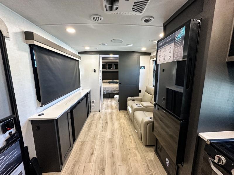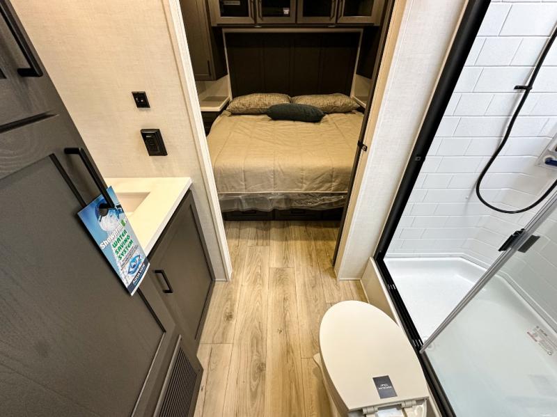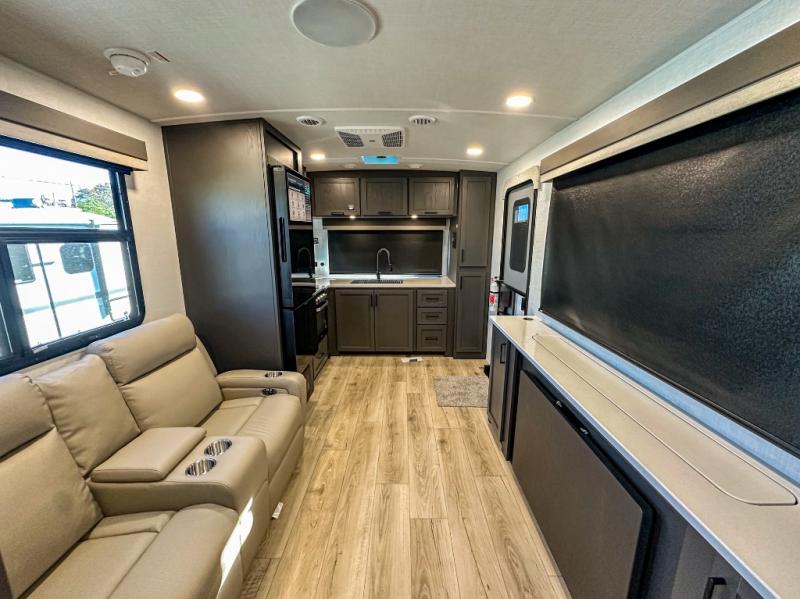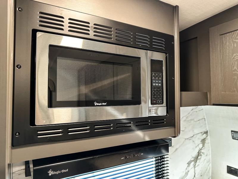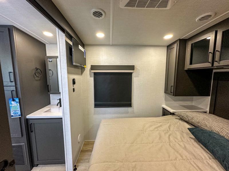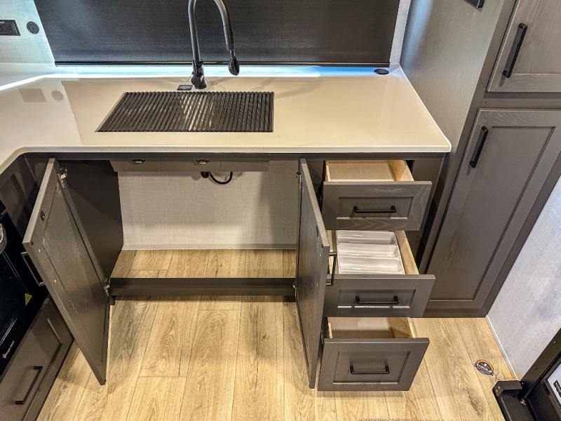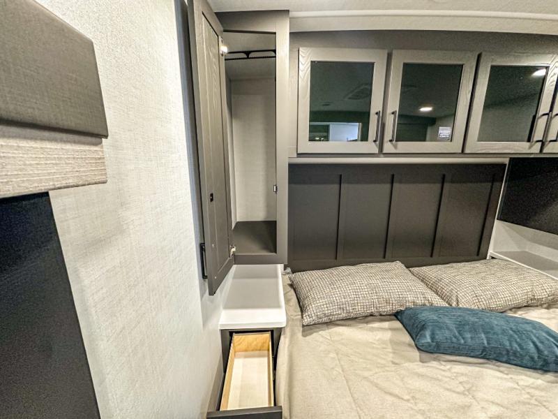 It won't be hard to find comfort in this lightweight travel trailer! The front kitchen includes ample counter space to prep melas, and you'll find a 12V refrigerator plus a pantry for food storage. A flip-up table with folding chairs gives you a place to dine together, and there is a theater seat across from the TV lift to enjoy movie nights. Head through the bath to find the rear master bedroom, complete with a king bed, dual wardrobes, and a TV option. In the morning, you can grab your hiking gear from the pass-thru storage and head for the trails!