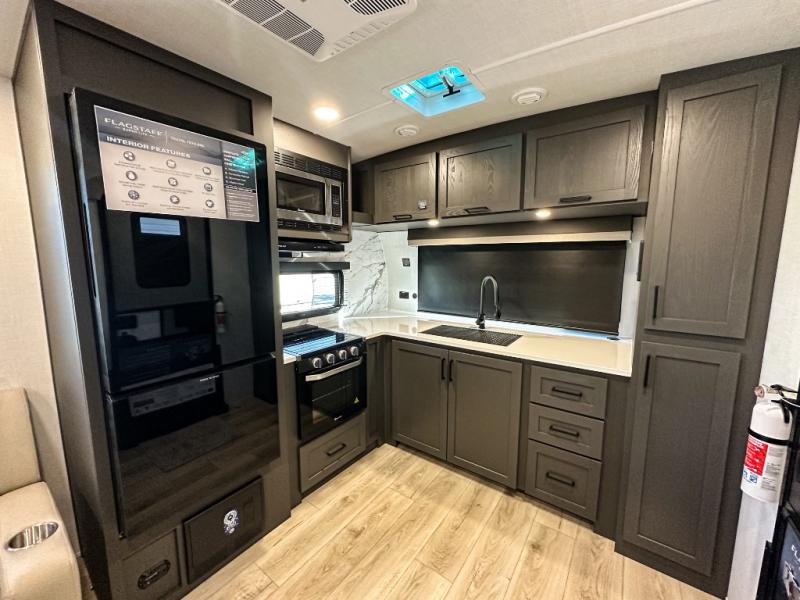 With any Flagstaff Super Lite travel trailer by Forest River, you can enjoy quality features with lightweight towing! The Climate Protection Package includes radiant foil in the front cap, underbelly, and slides, plus there are 12V thermostat-controlled heated tanks for added protection. The complete composite wall construction and 6-sided full-aluminum frame is ultra durable, and the RoadTech tire pressure monitoring adds safety. Each model also includes the Coast to Coast Package that comes with slam latch baggage doors, a high gloss fiberglass cap, Goodyear Endurance tires, plus a 200W solar panel with an optional additional 200W panel for more off grid capabilities. Inside, you'll love the roller shades, solid surface kitchen countertops, a shower miser system, and many more comforts!