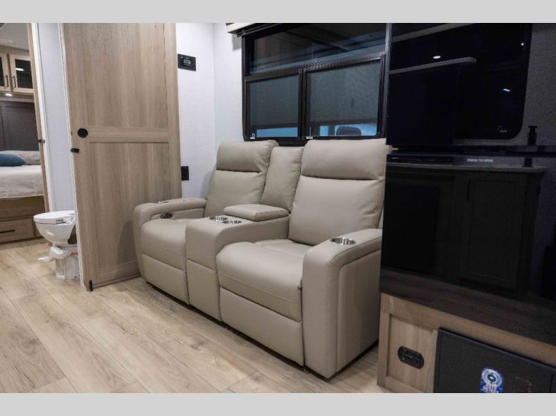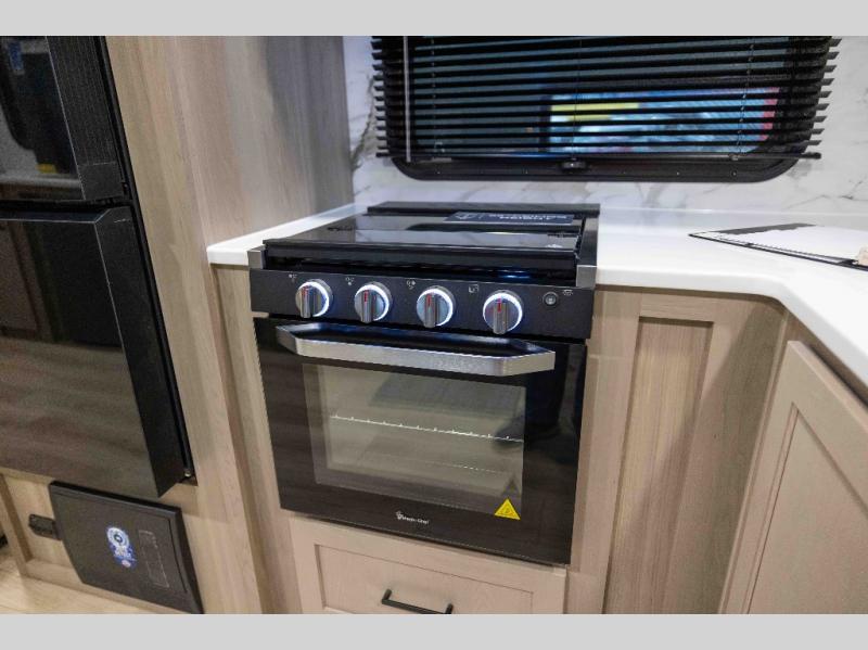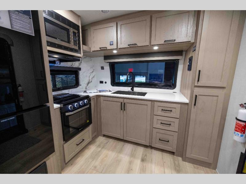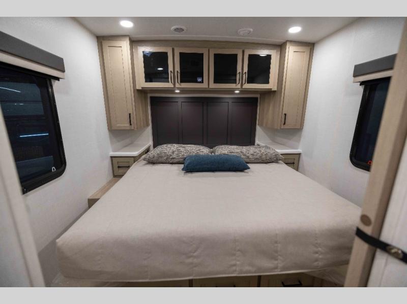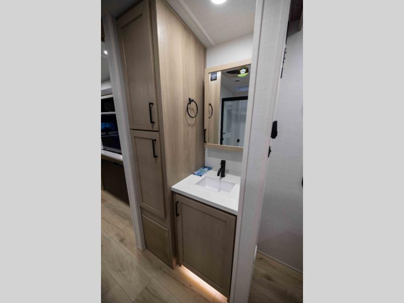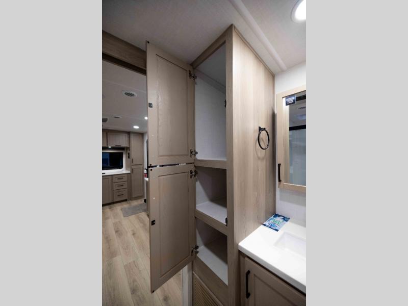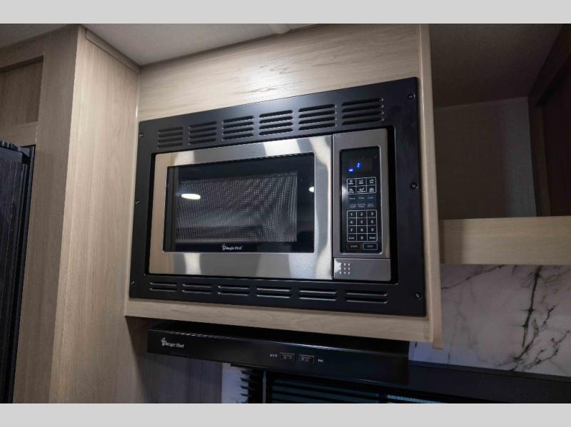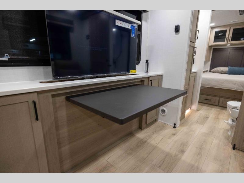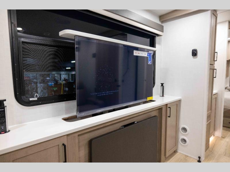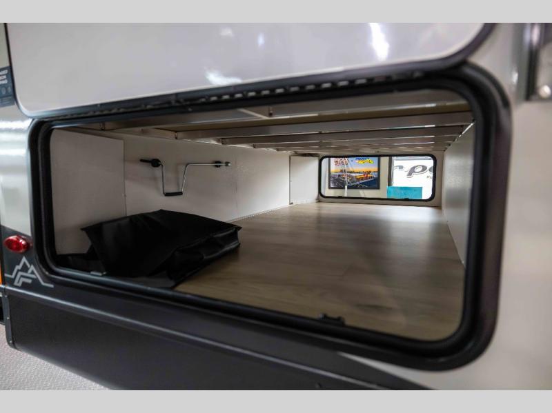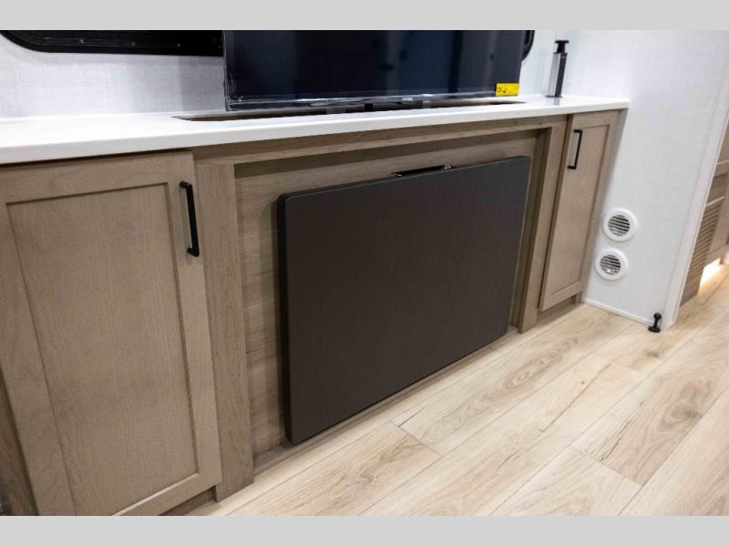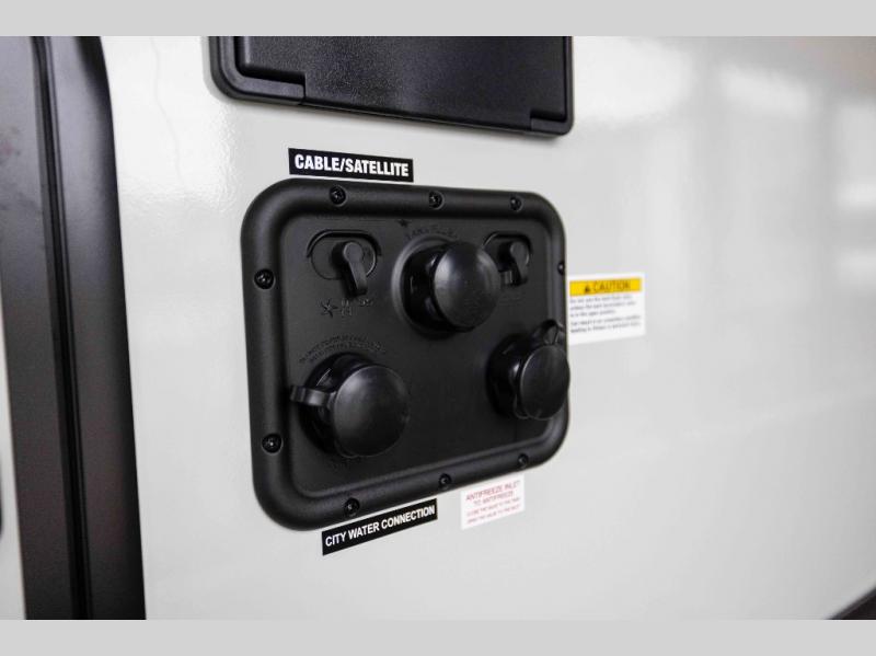 It won't be hard to find comfort in this lightweight travel trailer! The front kitchen includes ample counter space to prep melas, and you'll find a 12V refrigerator plus a pantry for food storage. A flip-up table with folding chairs gives you a place to dine together, and there is a theater seat across from the TV lift to enjoy movie nights. Head through the bath to find the rear master bedroom, complete with a king bed, dual wardrobes, and a TV option. In the morning, you can grab your hiking gear from the pass-thru storage and head for the trails!