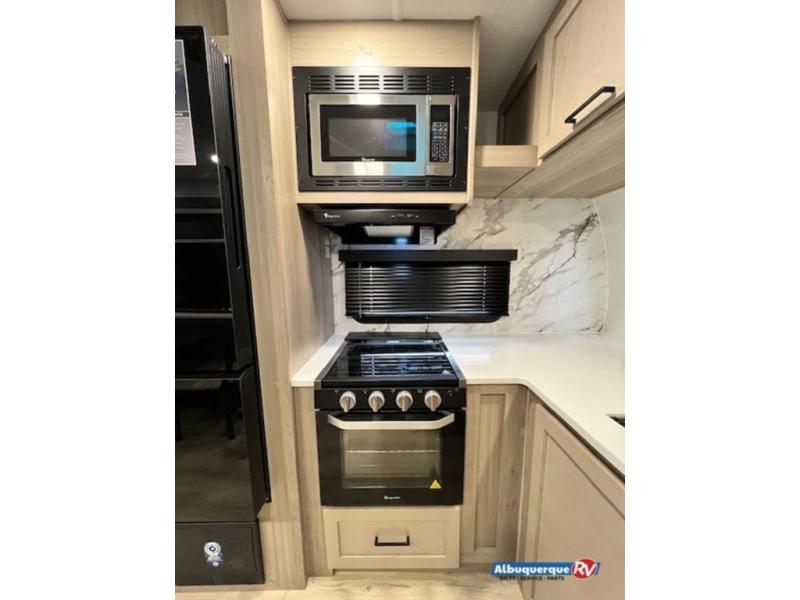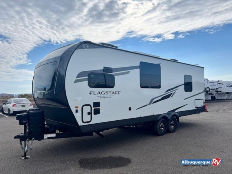 With any Flagstaff Super Lite travel trailer by Forest River, you can enjoy quality features with lightweight towing! The Climate Protection Package includes radiant foil in the front cap, underbelly, and slides, plus there are 12V thermostat-controlled heated tanks for added protection. The complete composite wall construction and 6-sided full-aluminum frame is ultra durable, and the RoadTech tire pressure monitoring adds safety. Each model also includes the Coast to Coast Package that comes with slam latch baggage doors, a high gloss fiberglass cap, Goodyear Endurance tires, plus a 200W solar panel with an optional additional 200W panel for more off grid capabilities. Inside, you'll love the roller shades, solid surface kitchen countertops, a shower miser system, and many more comforts!