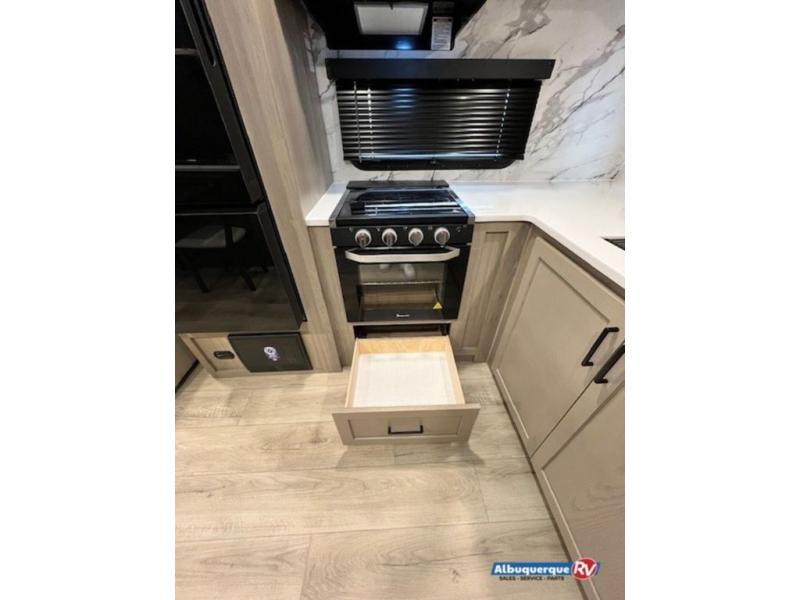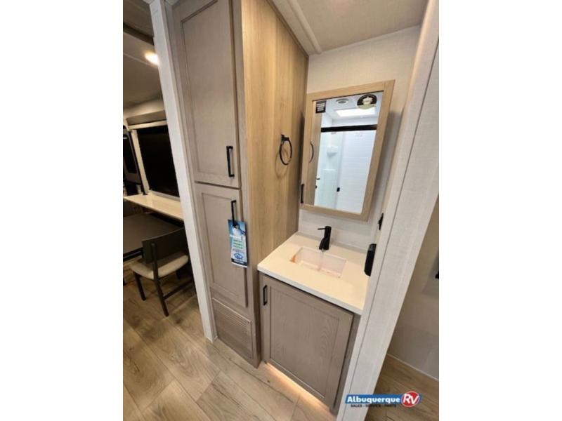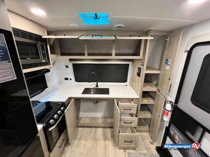 It won't be hard to find comfort in this lightweight travel trailer! The front kitchen includes ample counter space to prep melas, and you'll find a 12V refrigerator plus a pantry for food storage. A flip-up table with folding chairs gives you a place to dine together, and there is a theater seat across from the TV lift to enjoy movie nights. Head through the bath to find the rear master bedroom, complete with a king bed, dual wardrobes, and a TV option. In the morning, you can grab your hiking gear from the pass-thru storage and head for the trails!
