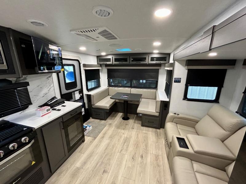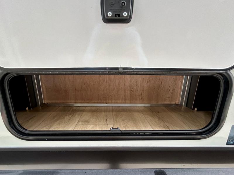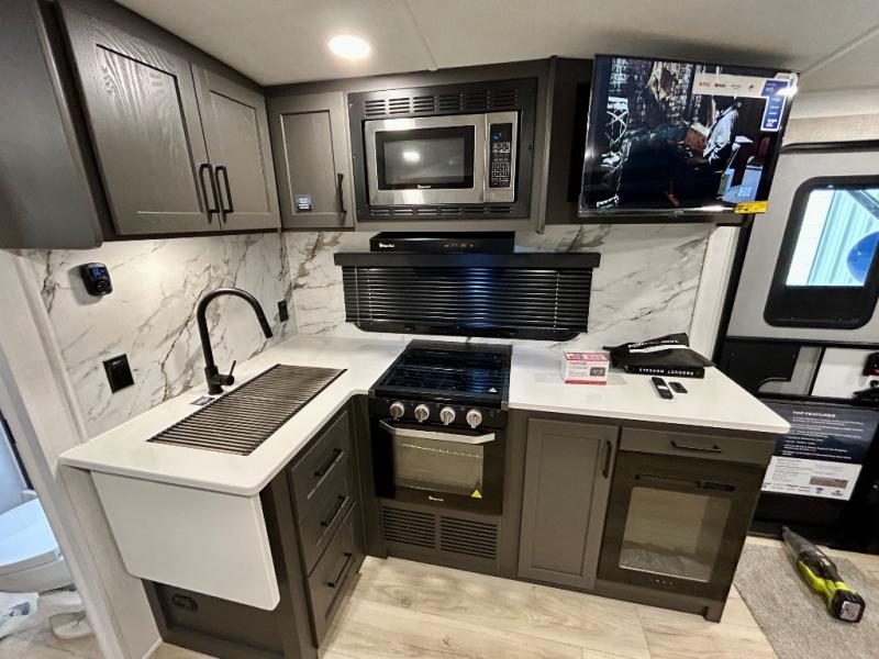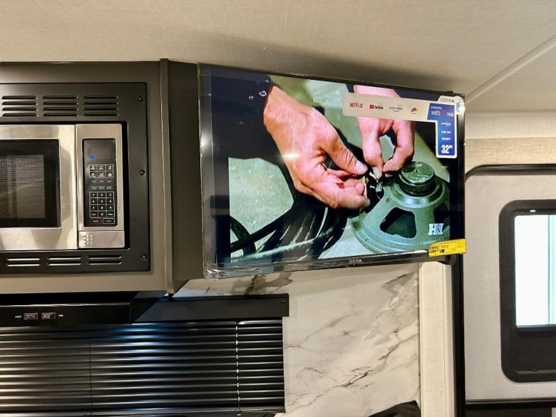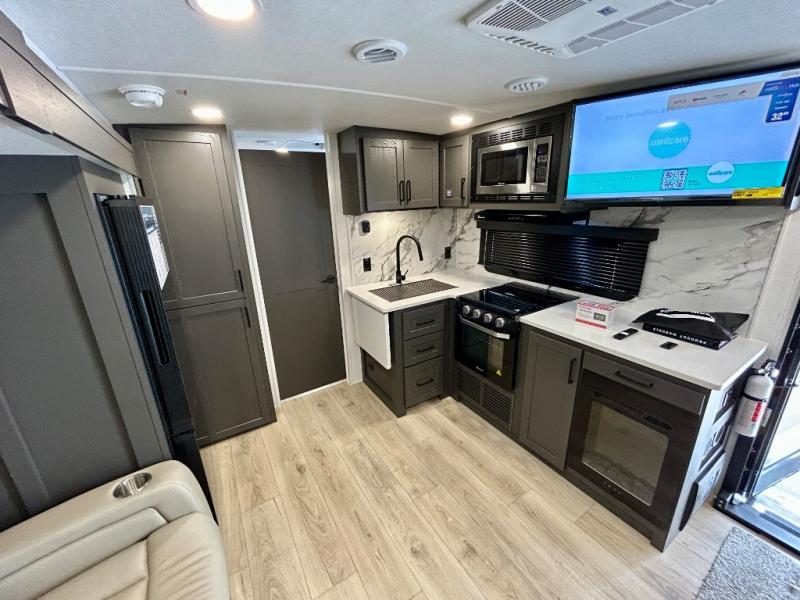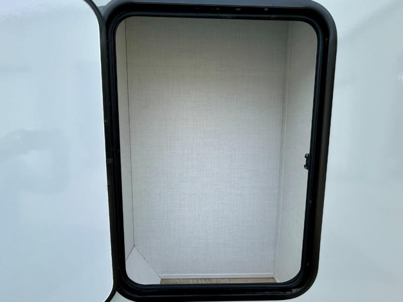 It will be so easy to enjoy time at the campground in this cozy travel trailer. The full kitchen includes a three burner gas oven, a microwave oven, and a 12V refrigerator to cook and store food, and the pantry will let you stock up on snacks. Your crew can get comfortable on the theater seat or around the rear U-shaped dinette, and there is a smart TV here to make it a movie night. The walk-thru bath will let you freshen up each day, and the queen bed in the front bedroom is sure to bring comfort. You will also find one of the dual entry doors here for convenience plus a wardrobe slide out for more storage and floor space. The exterior is just as accommodating with its pass-thru storage, 2" receiver hitch, and 21' power awning!