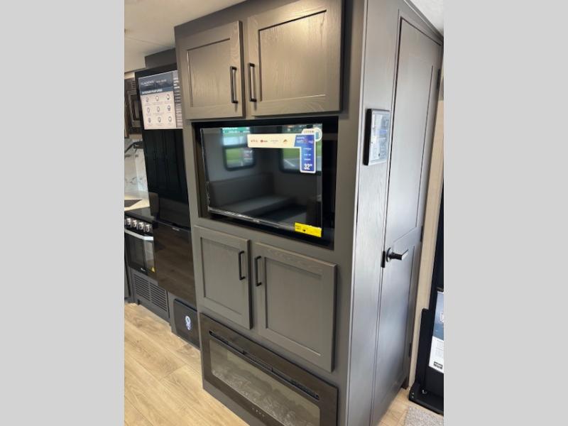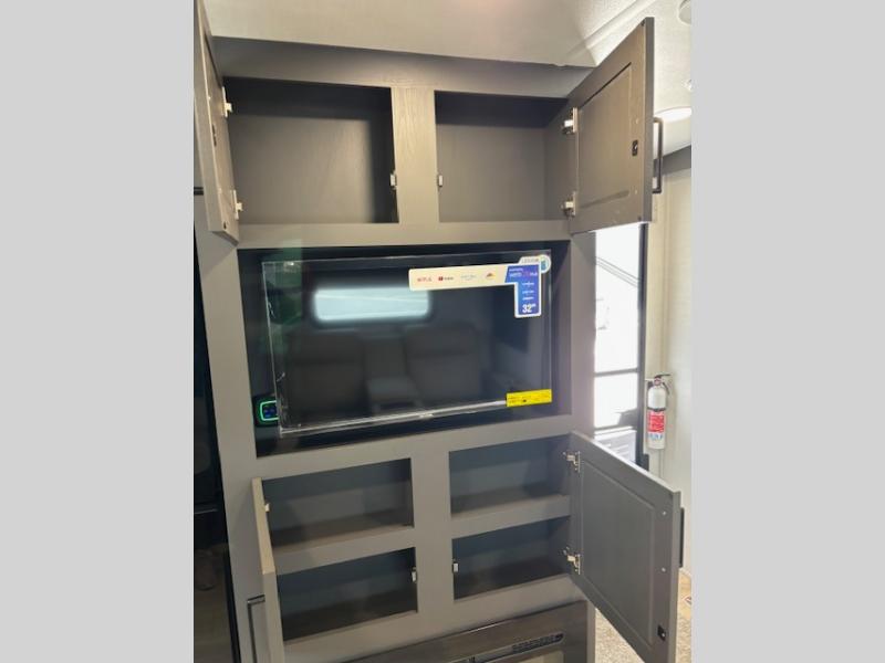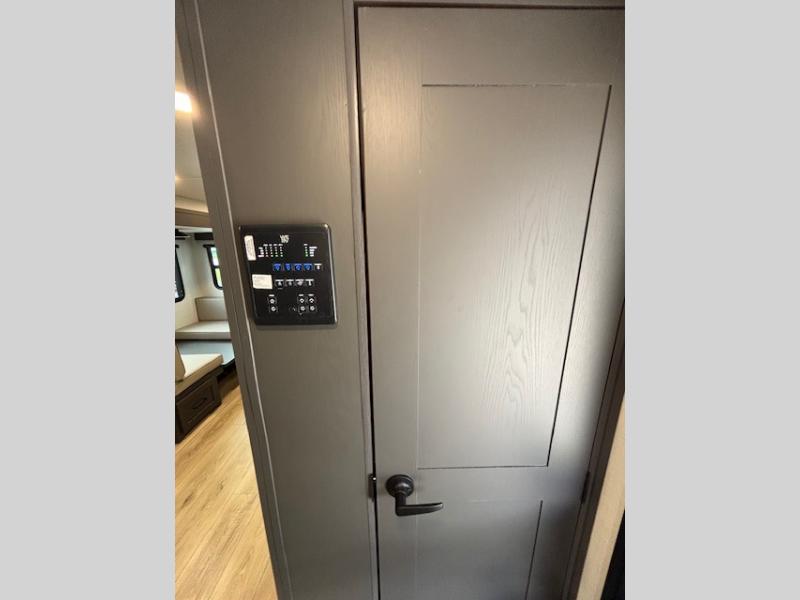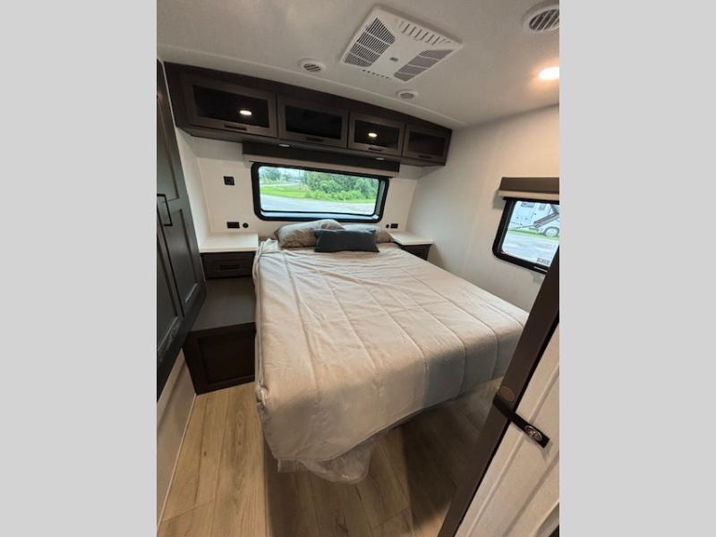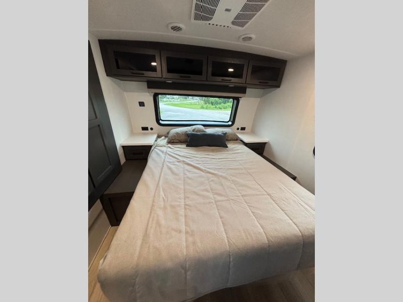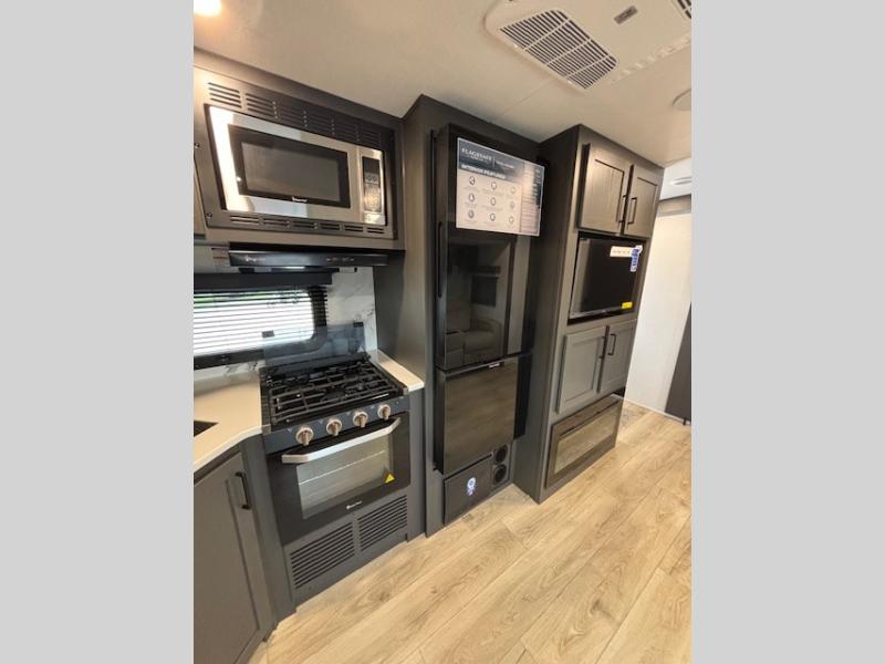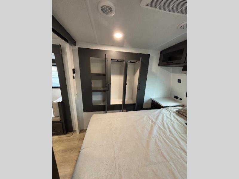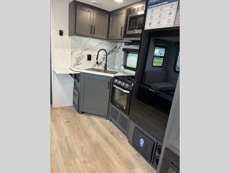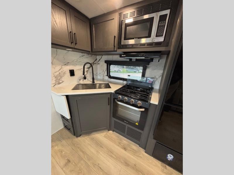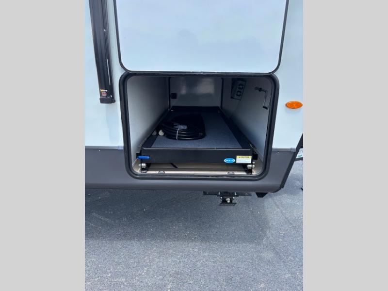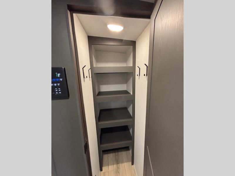 Enjoy inside comforts, and outside conveniences in this trailer. You can relax under the 21' awning which offers an outdoor living area protected from the elements, and a pass-thru storage with an optional steel sliding tray gives you the option to easily access your gear. You'll find ample storage space inside as well, including a walk-in pantry by the entry door for convenience! The cook will have full amenities to make meals, and when you are ready to sleep, head to the front bedroom with a queen bed and plenty of storage, and a wardrobe slide out giving you more floor and storage space.